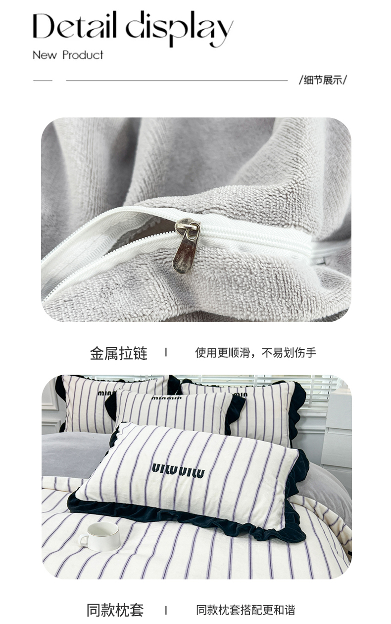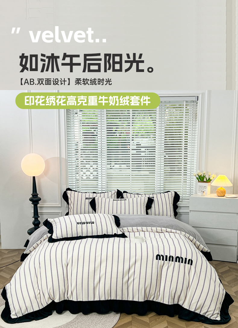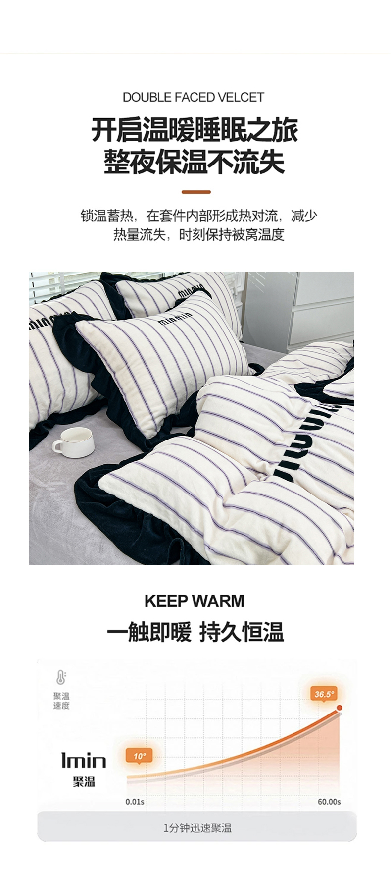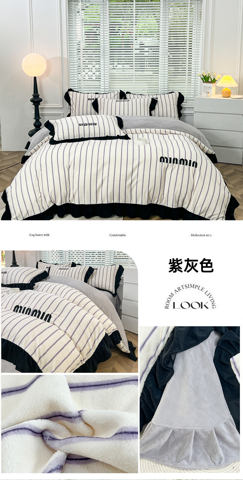 商品名称:(总)子曰 2025新款高克重法式小香风牛奶绒花边条纹系列四件套-罗拉