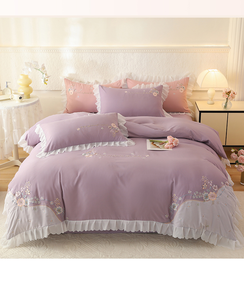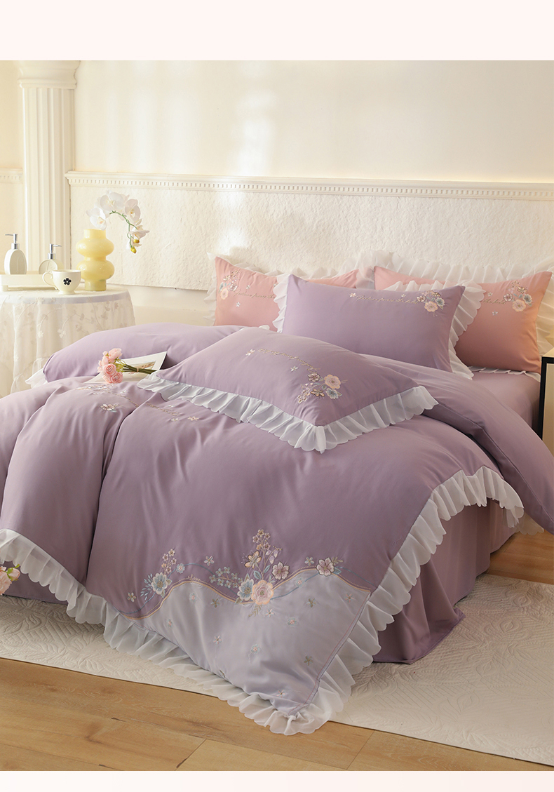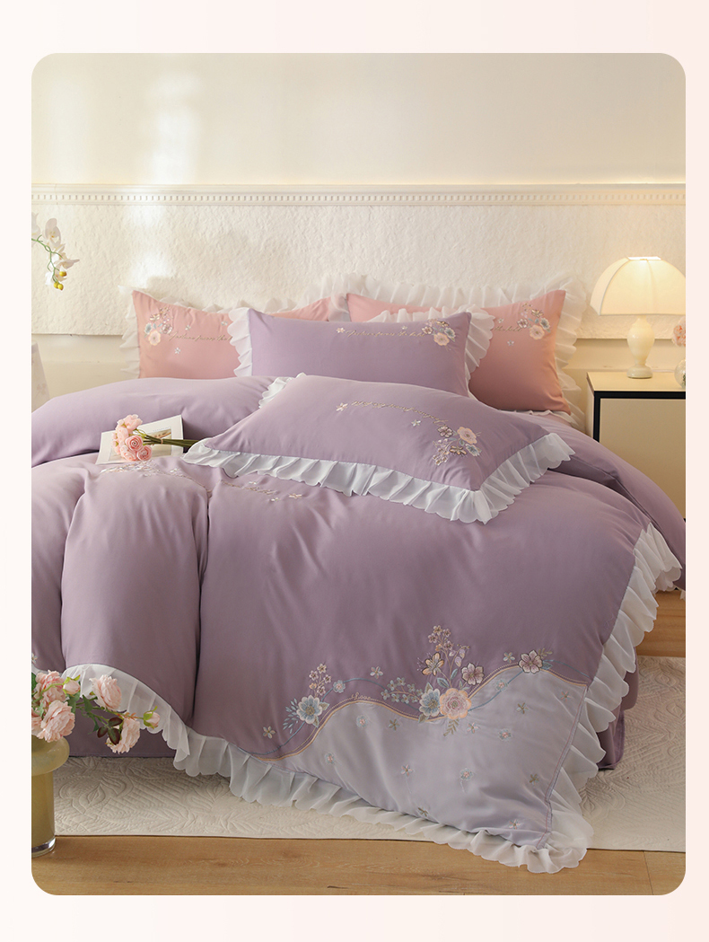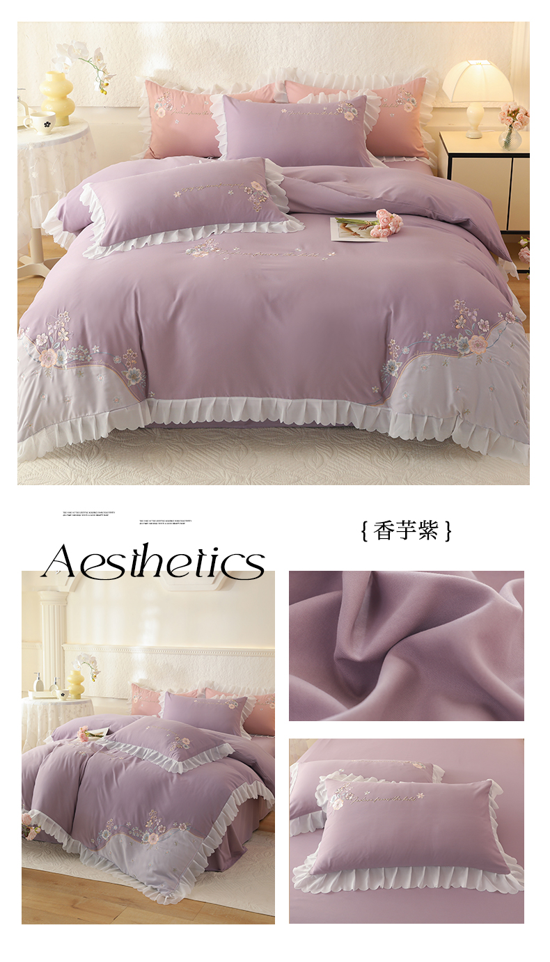 艾米家居 2025新款秋冬加厚铂金磨毛刺绣花边四件套-花涧 花涧-香芋紫