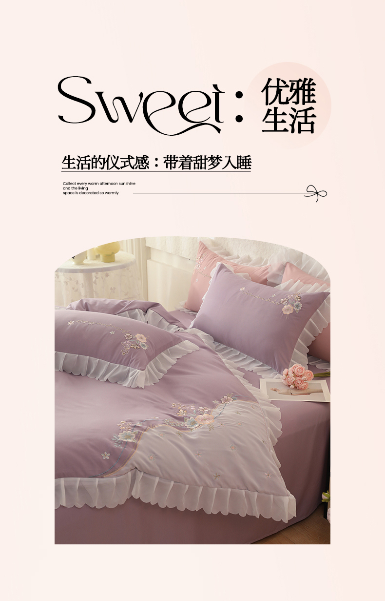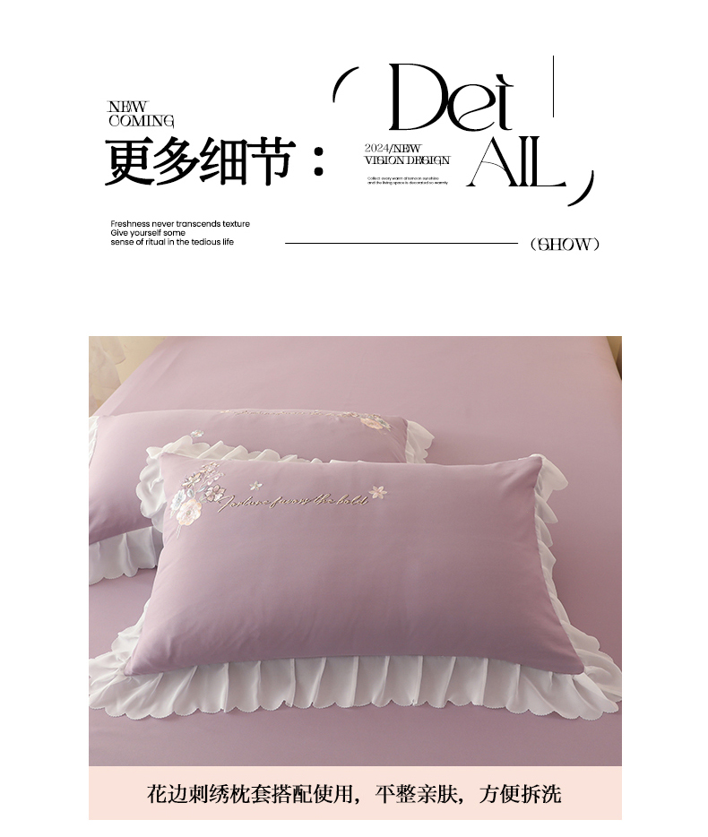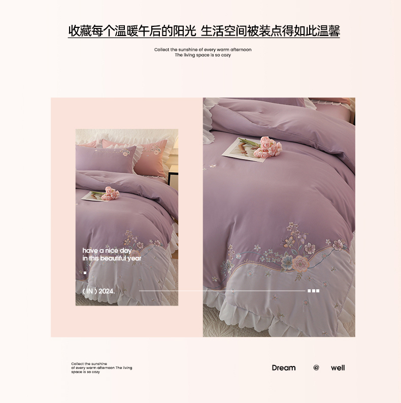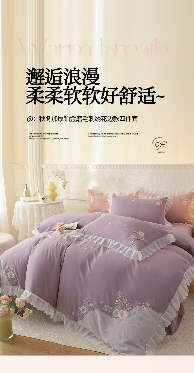商品名称:艾米家居 2025新款秋冬加厚铂金磨毛刺绣花边四件套-花涧 花涧-香芋紫