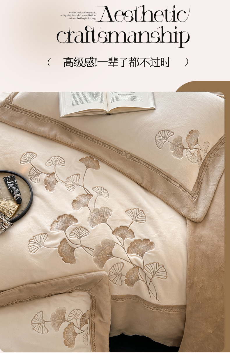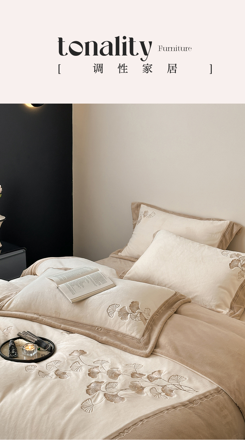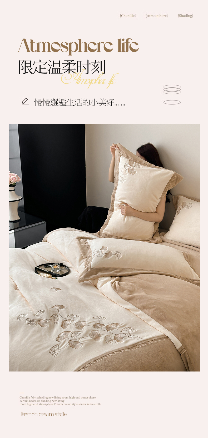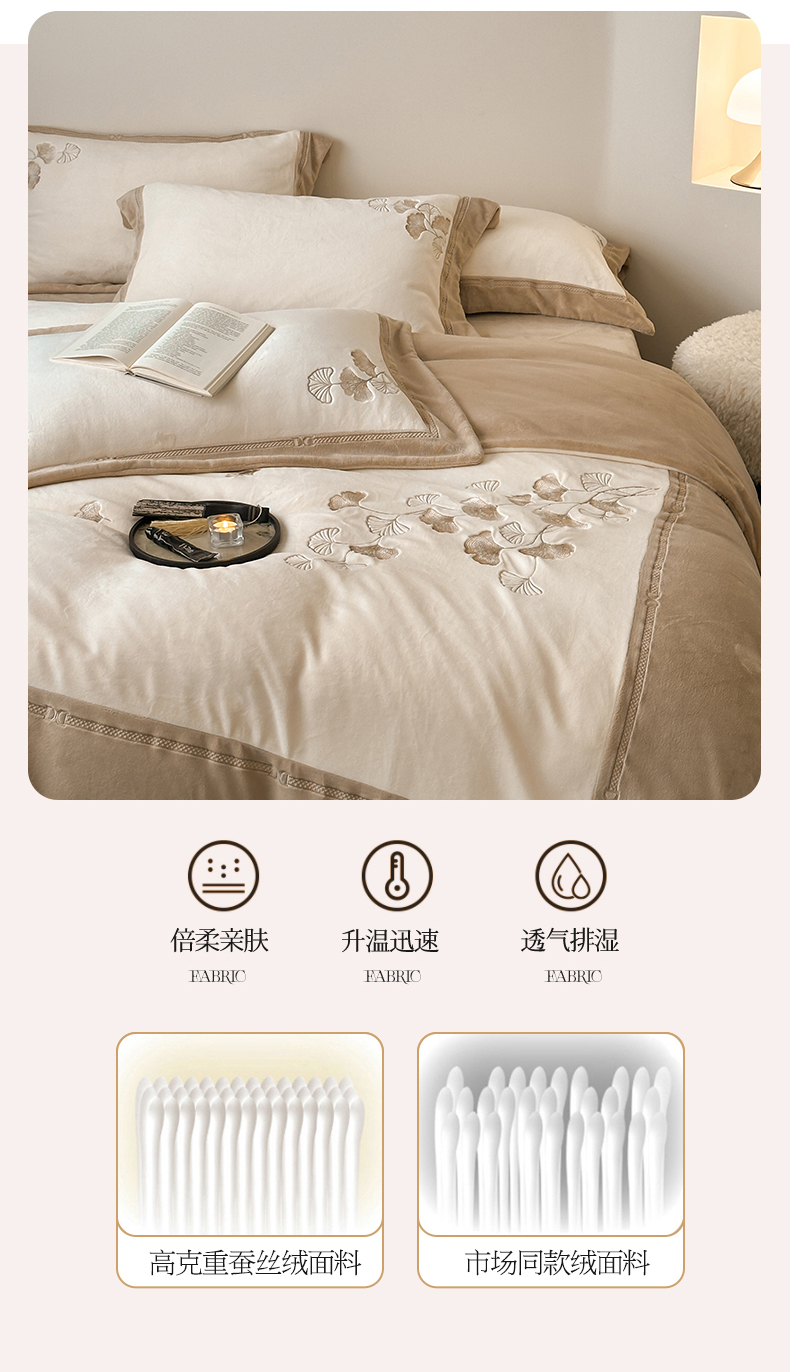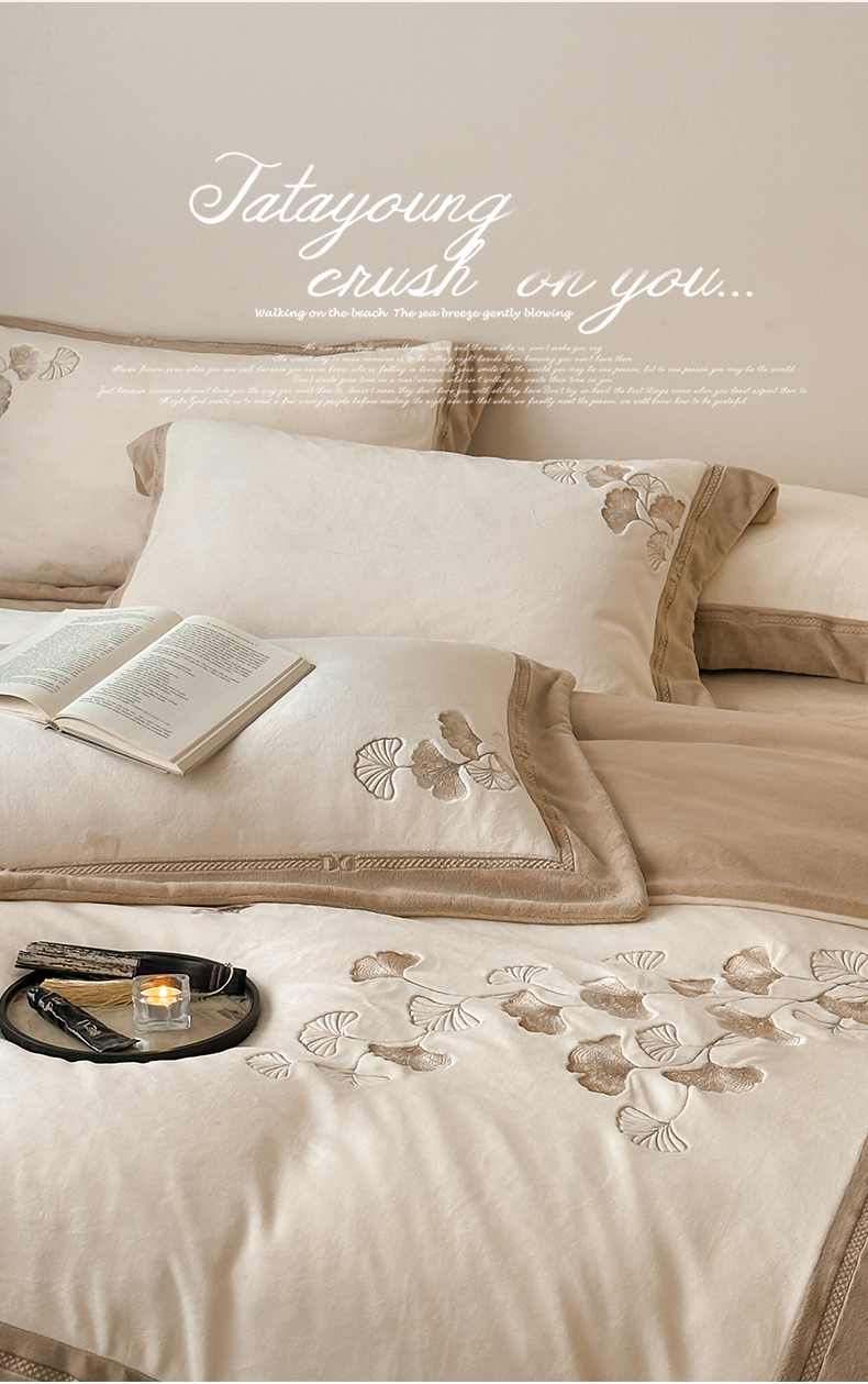 商品名称:2024新款高克重牛奶绒绣花四件套-叶起华裳 星奶油驼