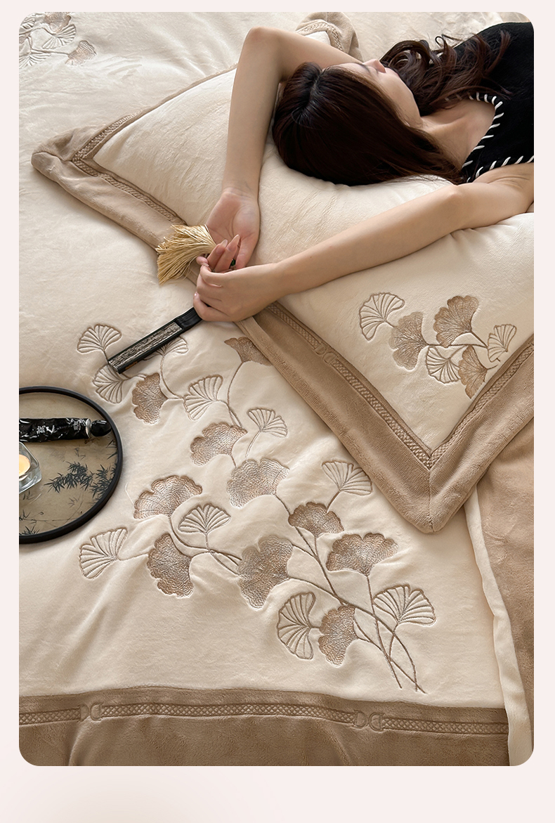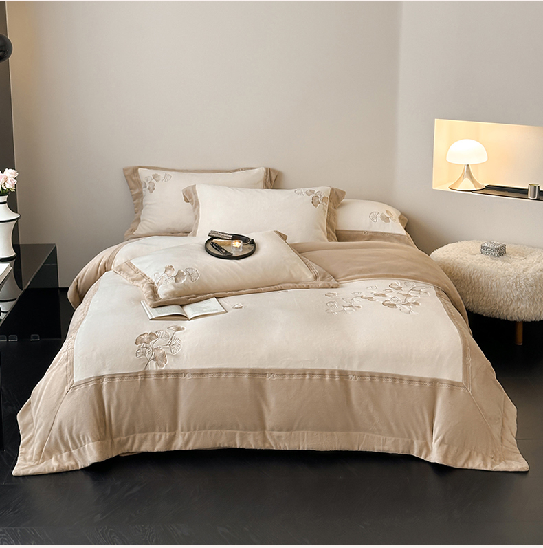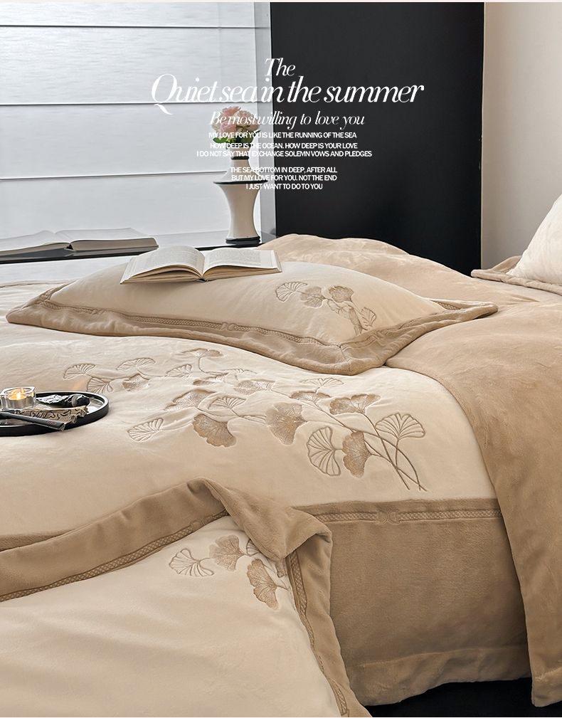 2024新款高克重牛奶绒绣花四件套-叶起华裳 星奶油驼