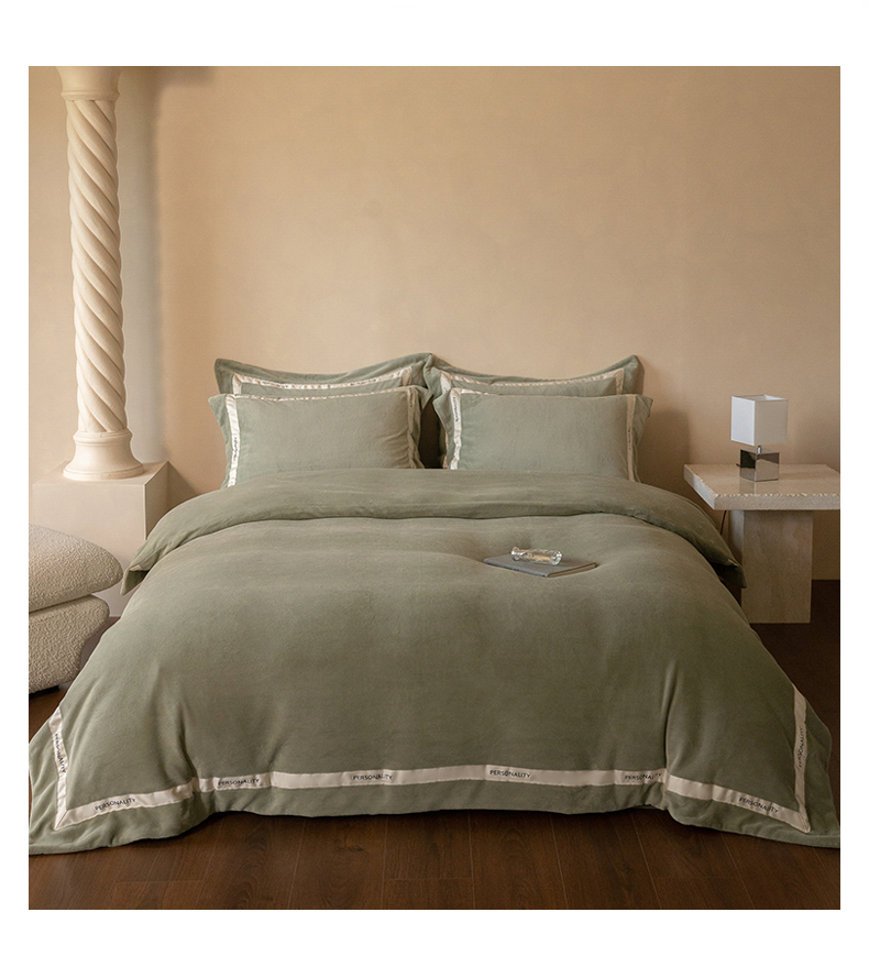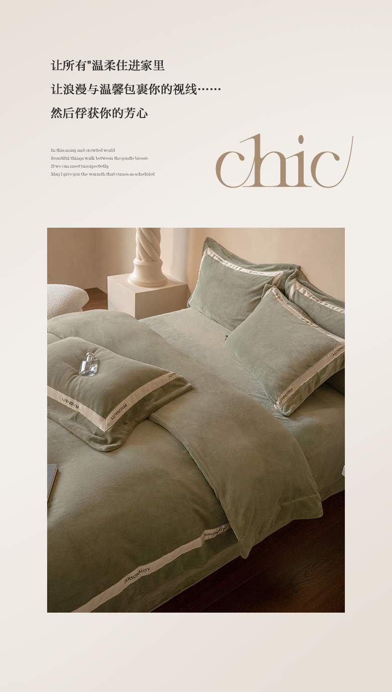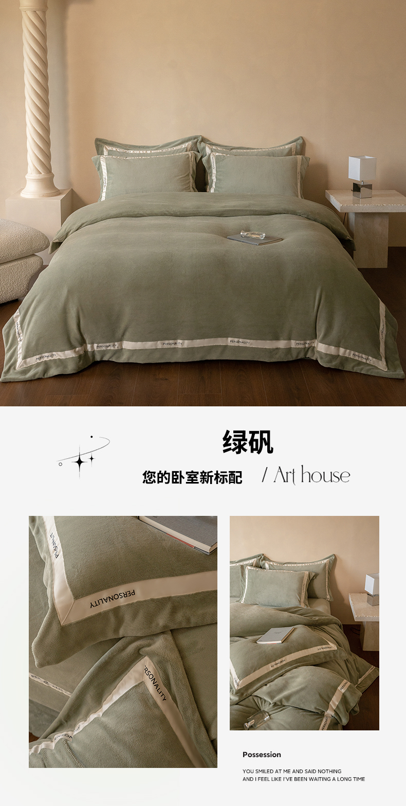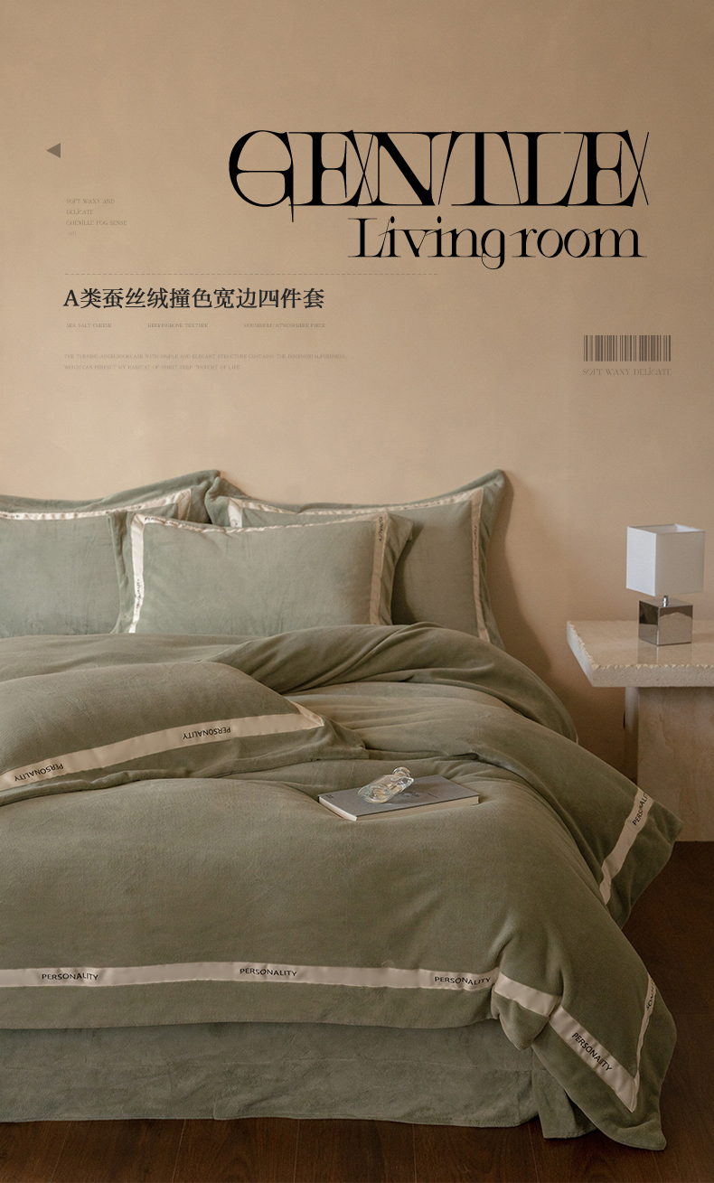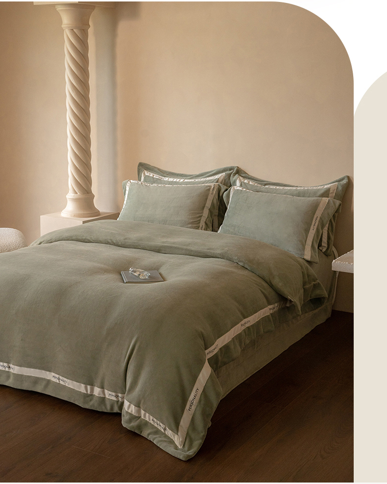 商品名称:2024新款高克重牛奶绒撞色宽边四件套-时尚格调 绿矾