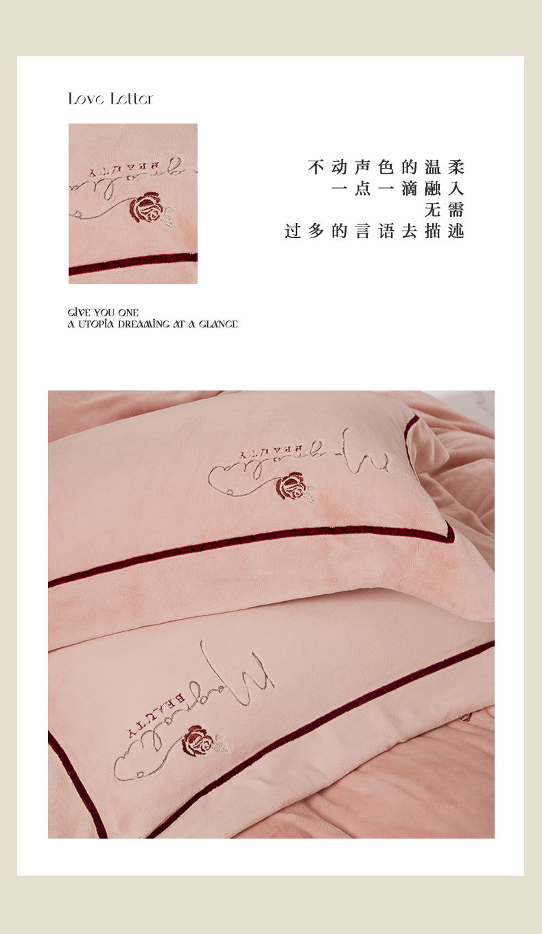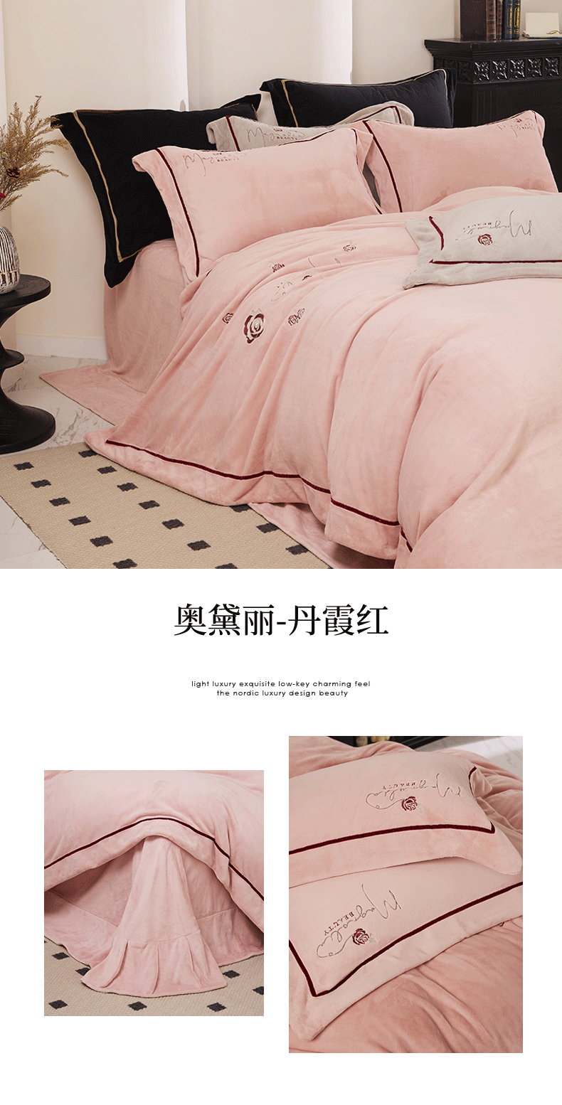 商品名称:2024新款高克重牛奶绒绣花四件套-奥黛丽 奥黛丽-丹霞红