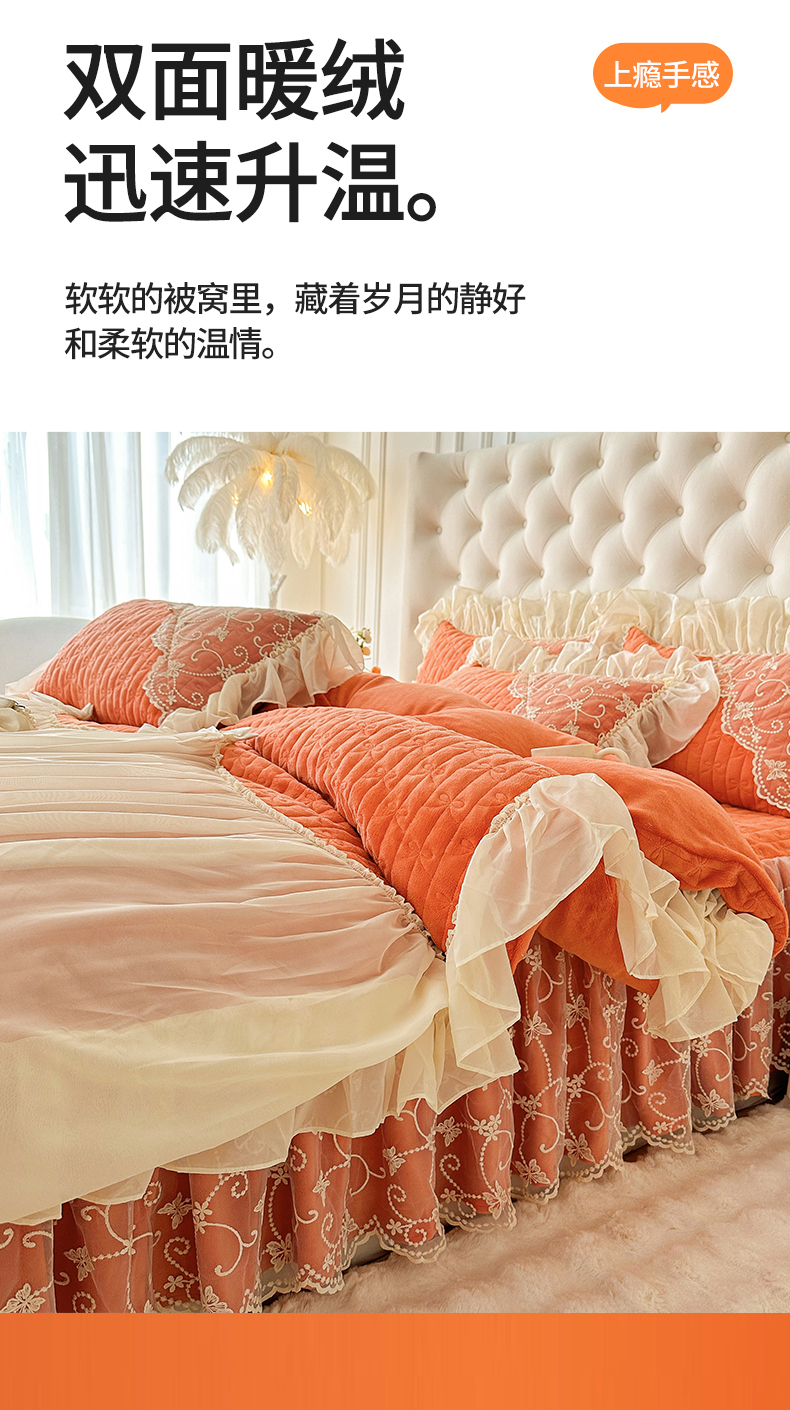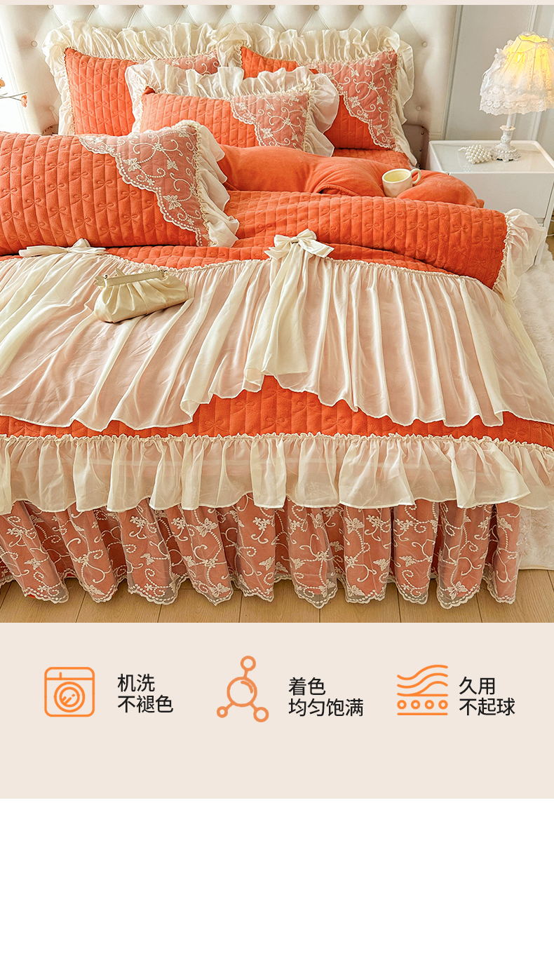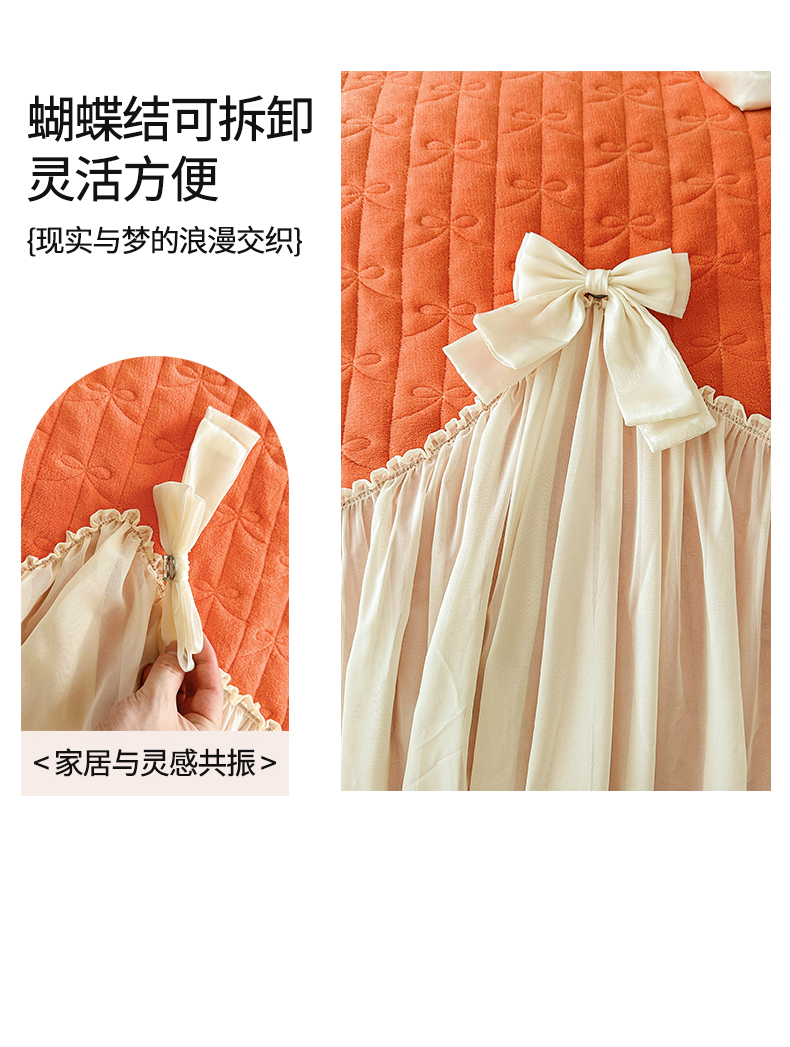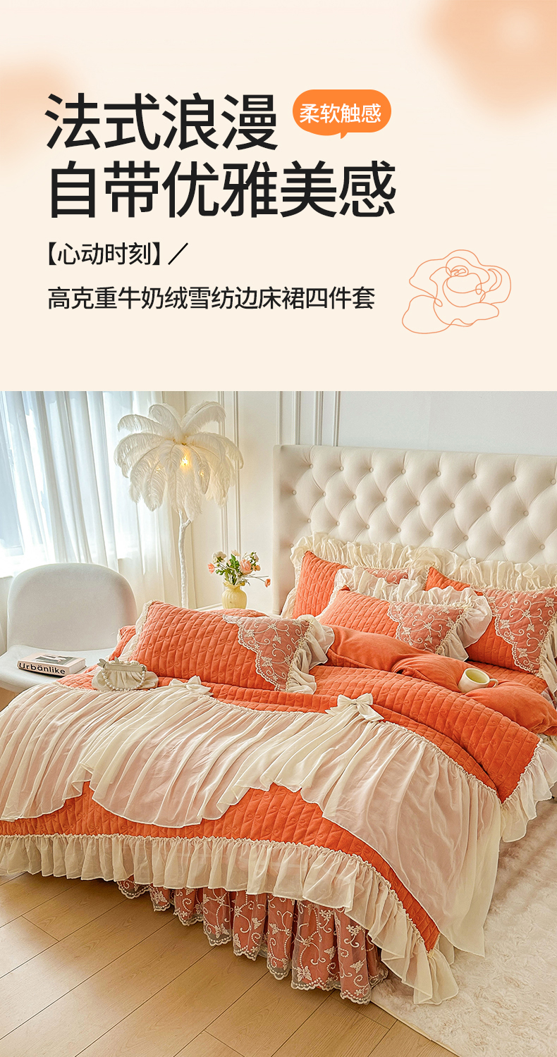 当前位置: 91家纺网 > 商品网购 > 床品套件 > 四件套 > 其它四件套 > 罗艺轩 2024新款高克重牛奶雪纺边床裙四件套-羽蝶 爱玛橙