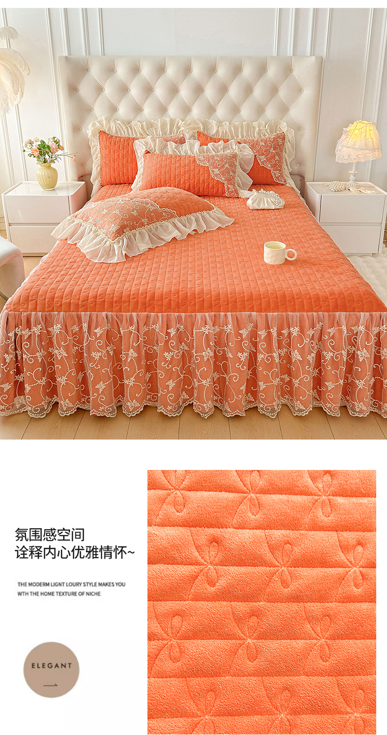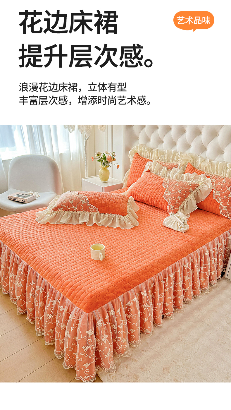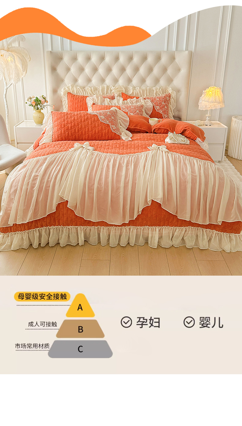 当前位置: 91家纺网 > 商品网购 > 床品套件 > 四件套 > 其它四件套 > 罗艺轩 2024新款高克重牛奶雪纺边床裙四件套-羽蝶 爱玛橙