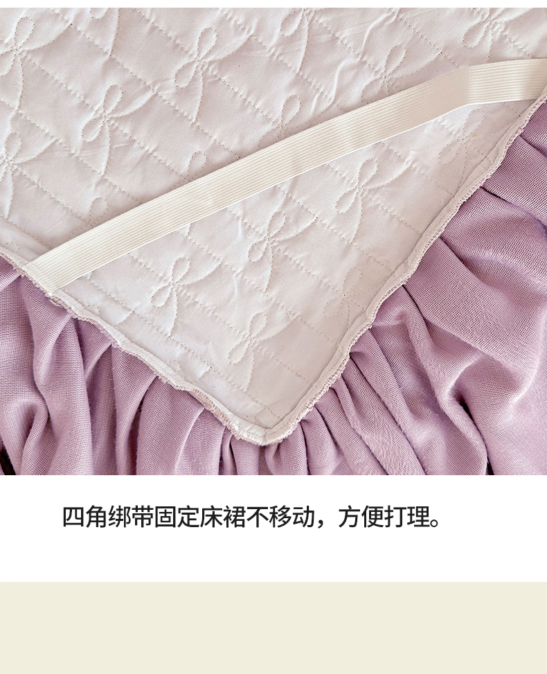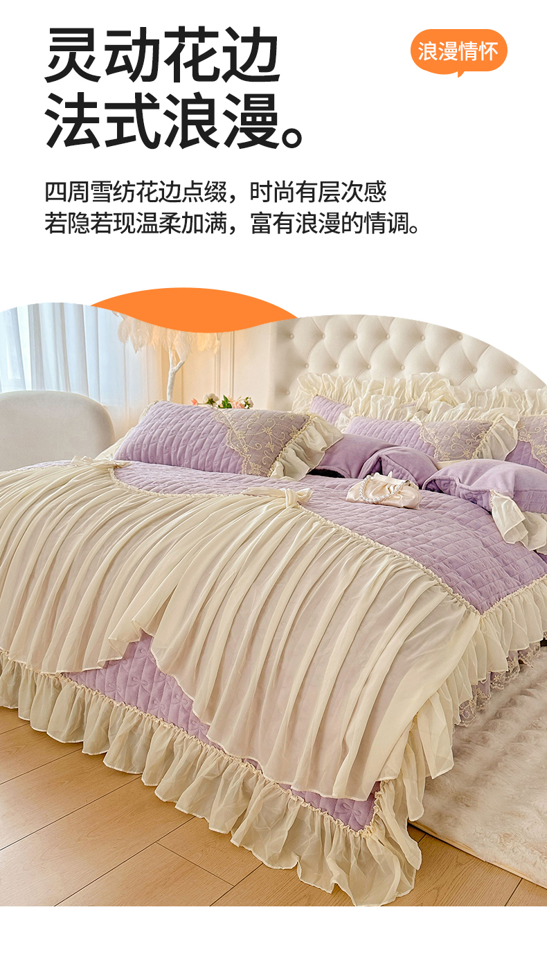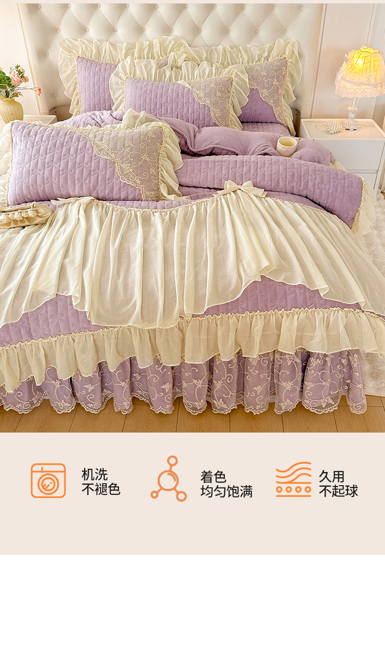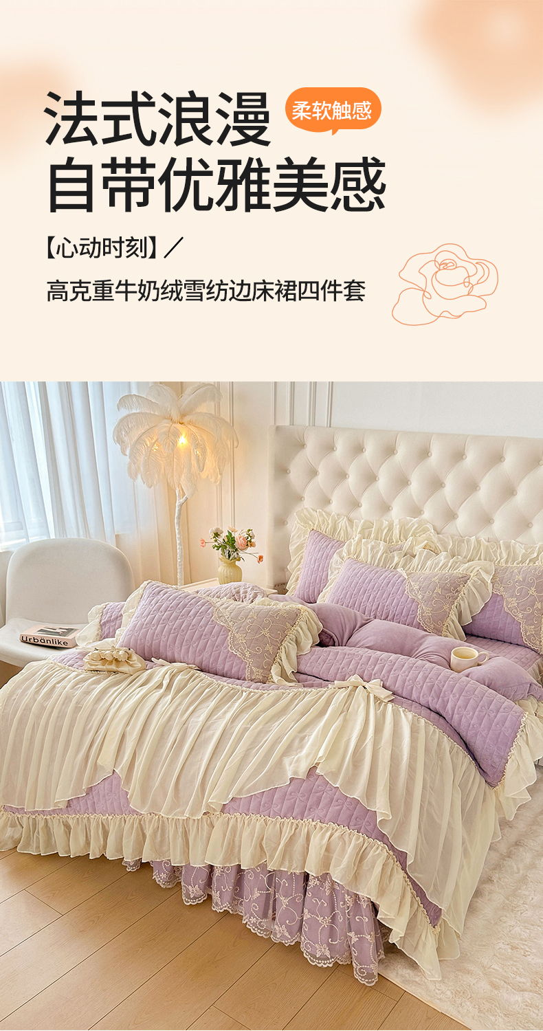 当前位置: 91家纺网 > 商品网购 > 床品套件 > 四件套 > 其它四件套 > 罗艺轩 2024新款高克重牛奶雪纺边床裙四件套-羽蝶 甜紫