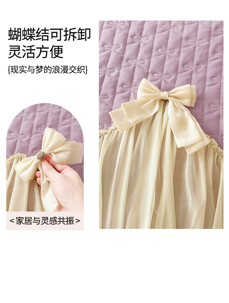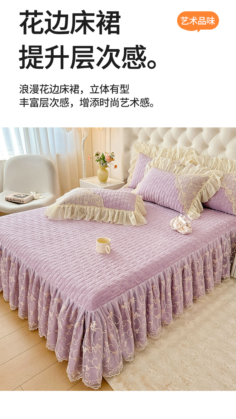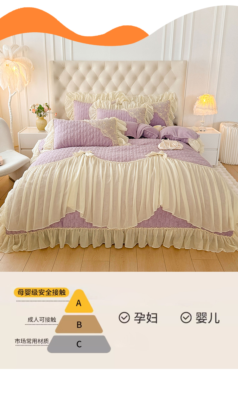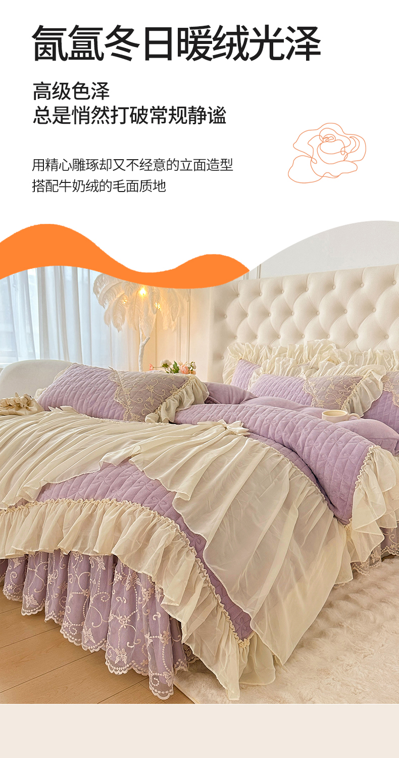 当前位置: 91家纺网 > 商品网购 > 床品套件 > 四件套 > 其它四件套 > 罗艺轩 2024新款高克重牛奶雪纺边床裙四件套-羽蝶 甜紫
