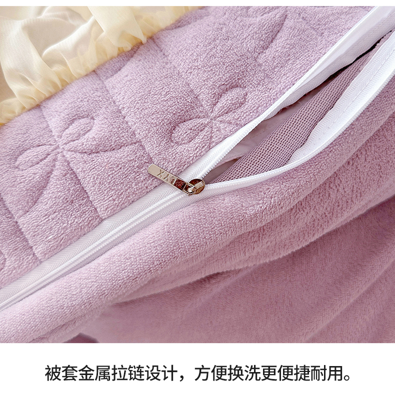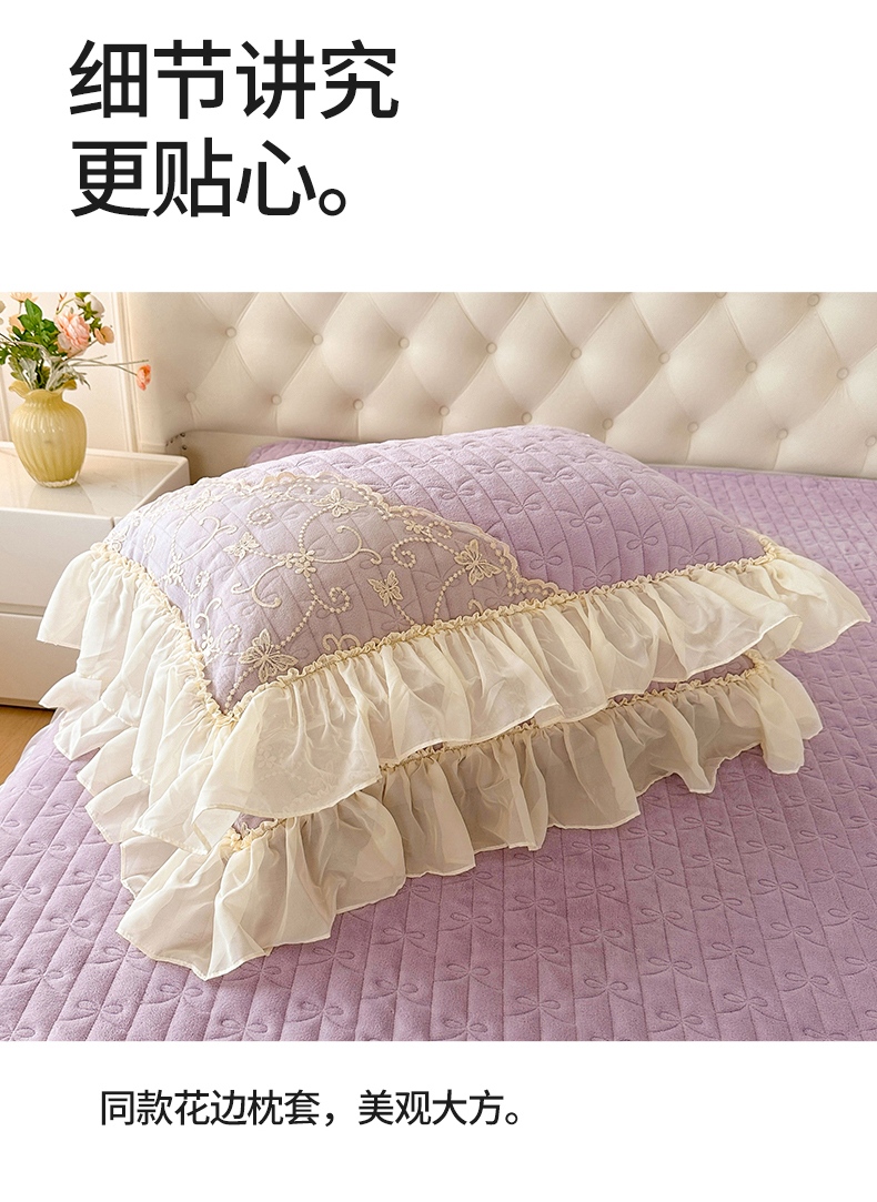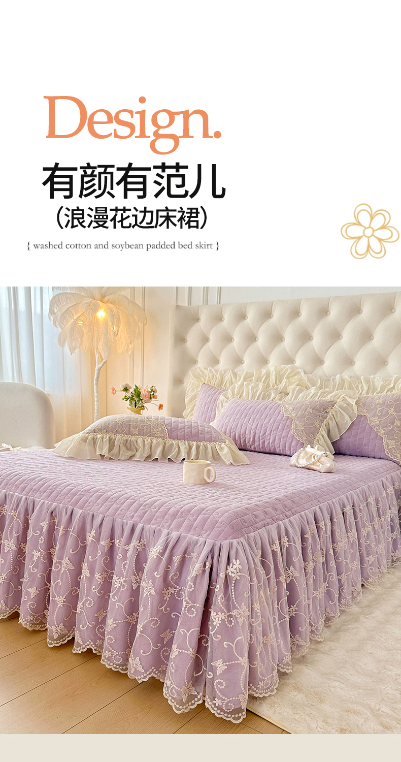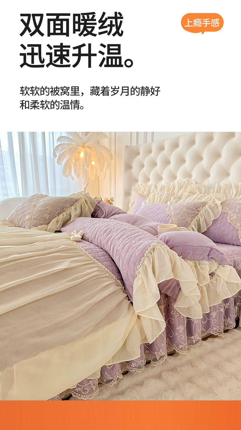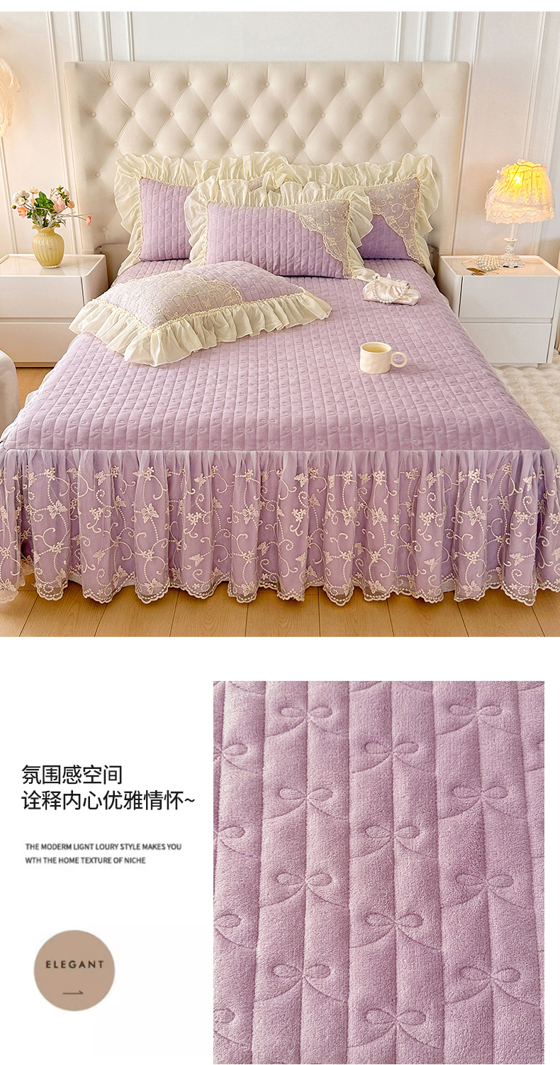 当前位置: 91家纺网 > 商品网购 > 床品套件 > 四件套 > 其它四件套 > 罗艺轩 2024新款高克重牛奶雪纺边床裙四件套-羽蝶 甜紫