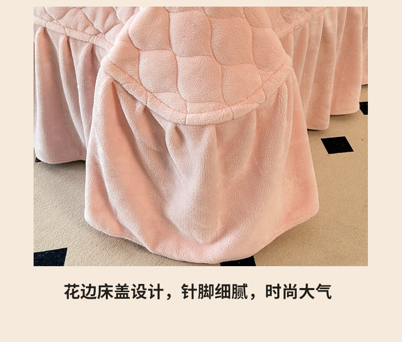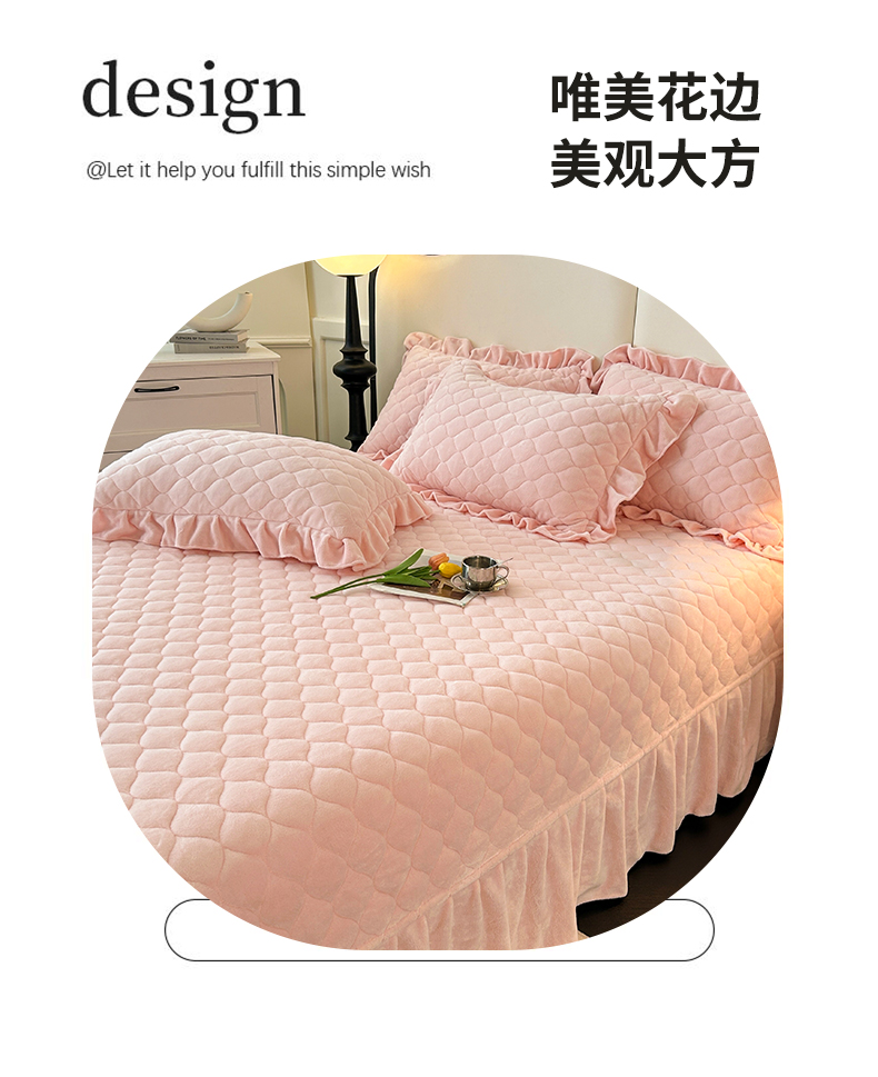 (总)屹成家纺2025新款水晶绒夹棉绗缝蕾丝床裙三件套(塞纳河畔)床裙单件起售价不低于105元,大红,豆沙,翡翠绿,粉玉,橄榄绿,蔚蓝,银灰