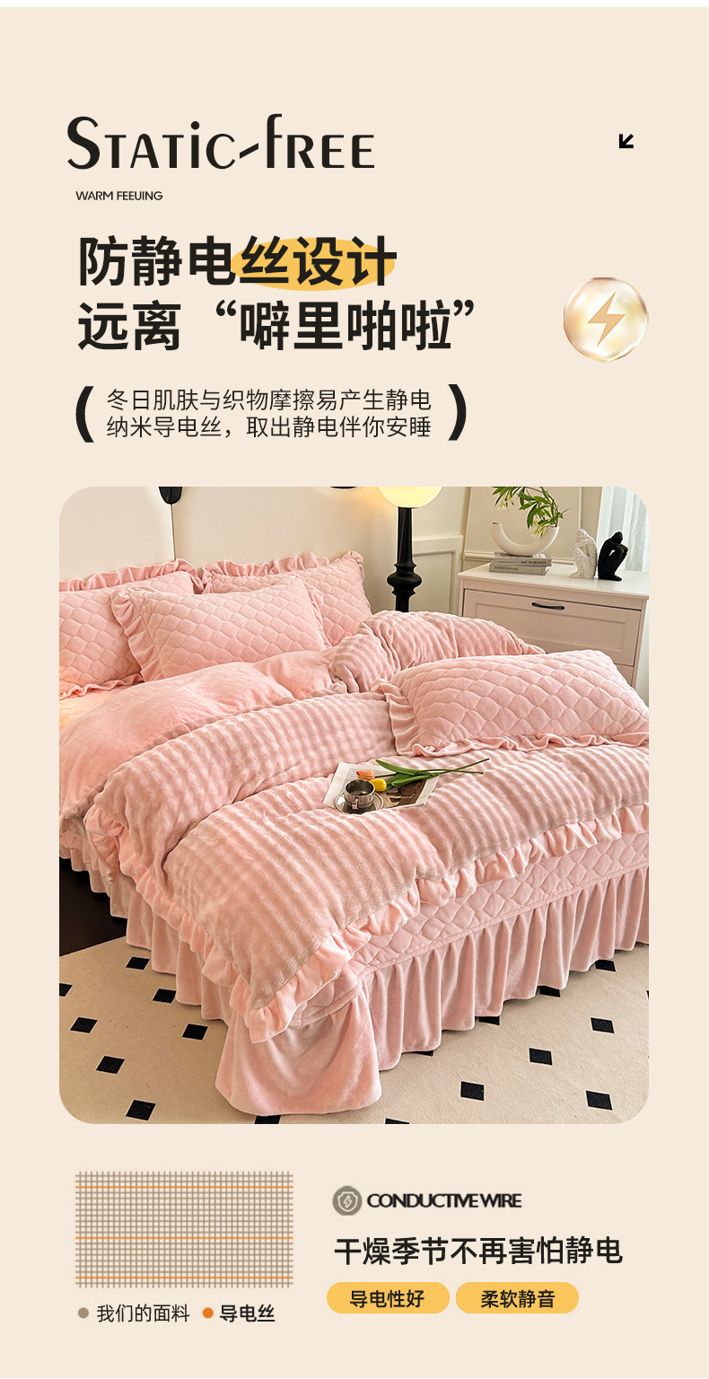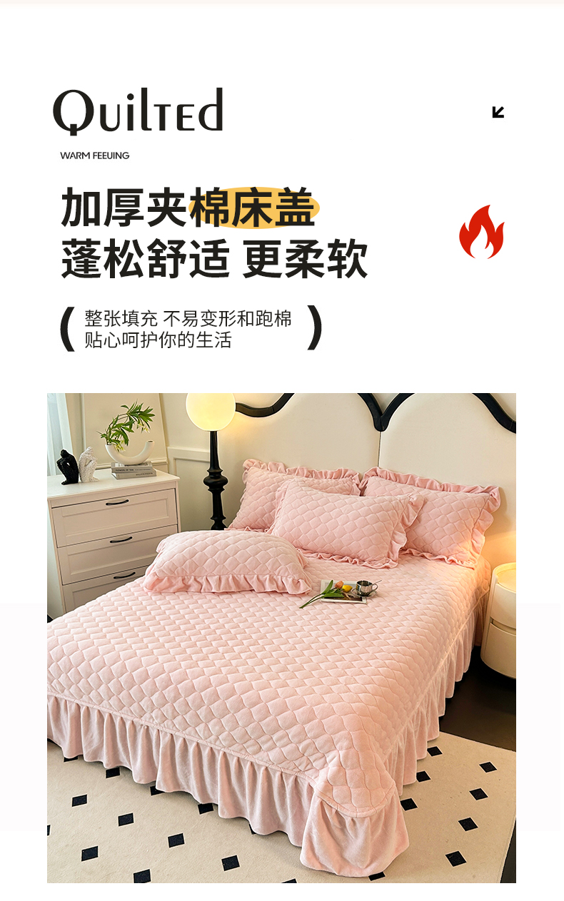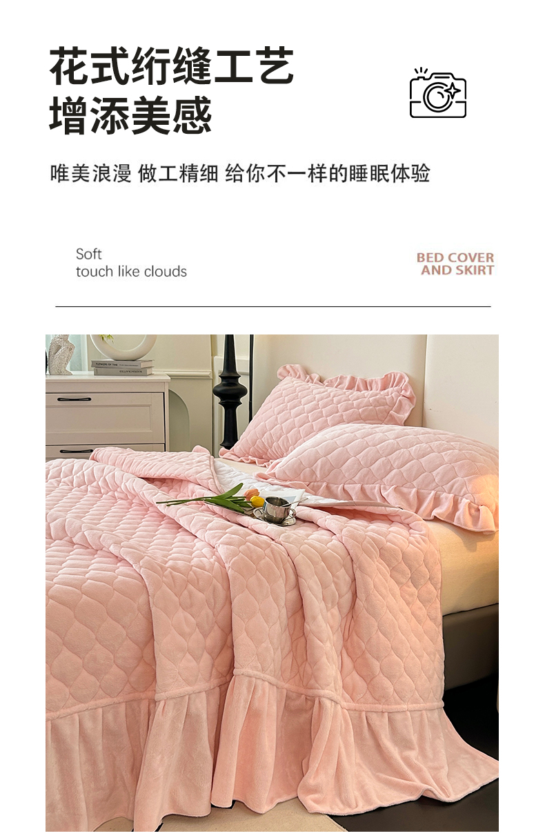 (总)屹成家纺2025新款水晶绒夹棉绗缝床裙四件套(塞纳河畔)四件套起售价不低于230元,大红,豆沙,翡翠绿,粉玉,橄榄绿,蔚蓝,银灰