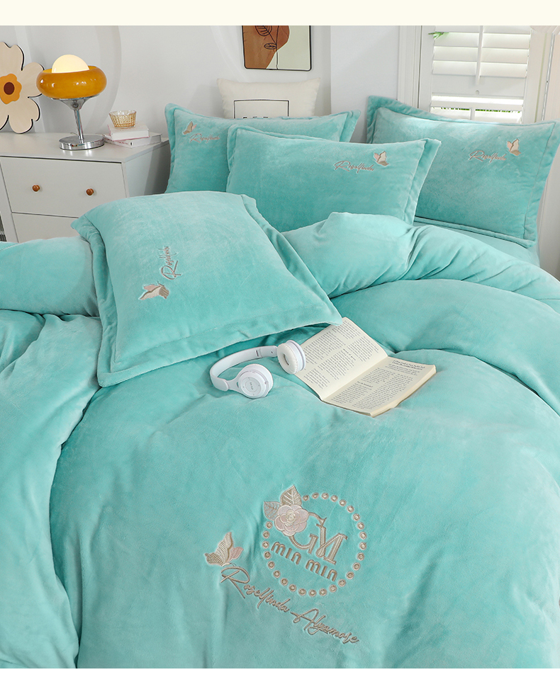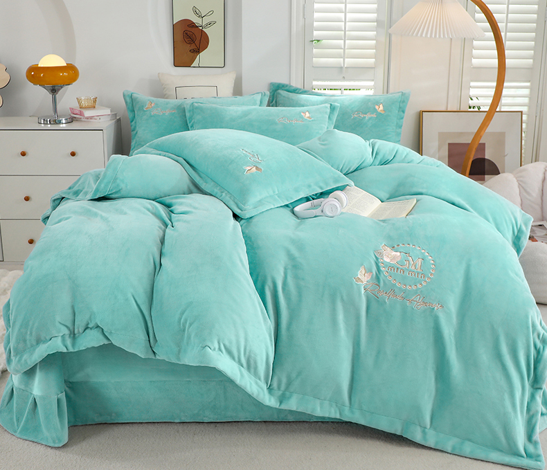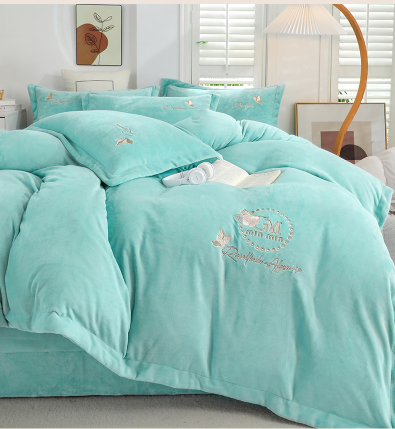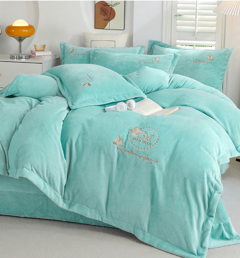 畅畅家纺 2024新款宽边高克重冬季9斤加厚牛奶绒绣花四件套 水绿色