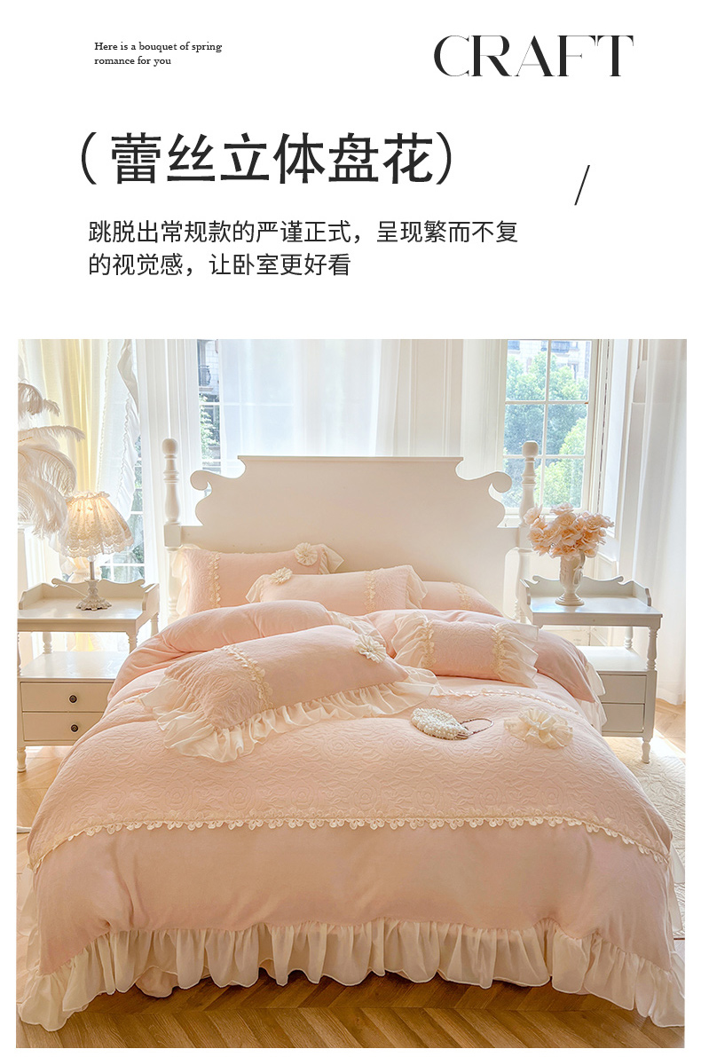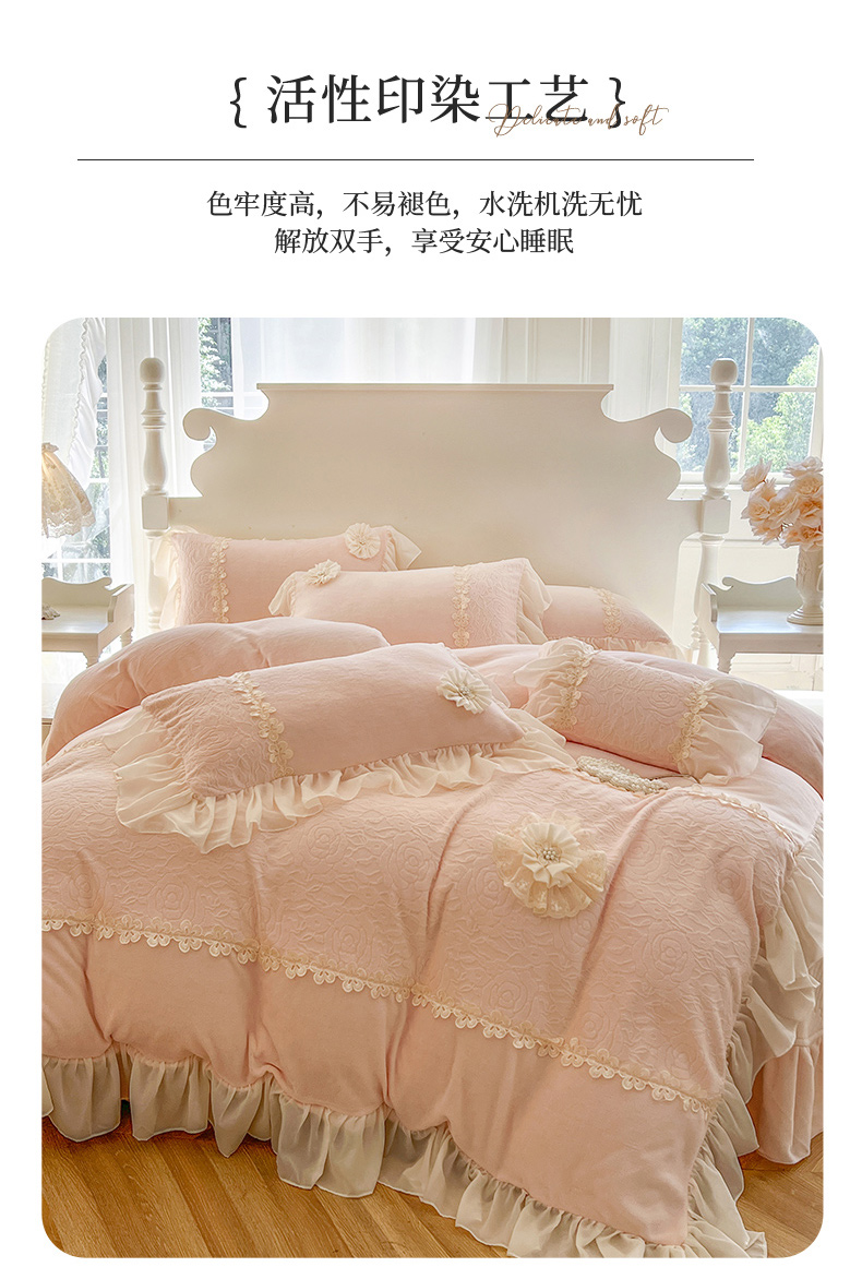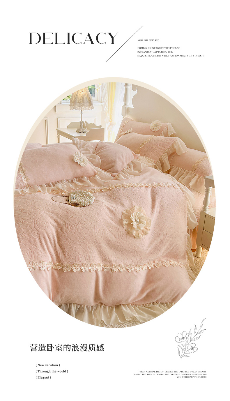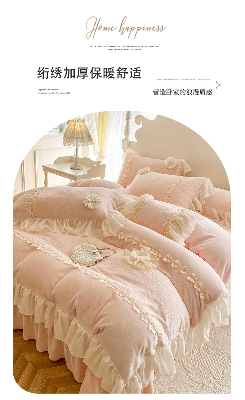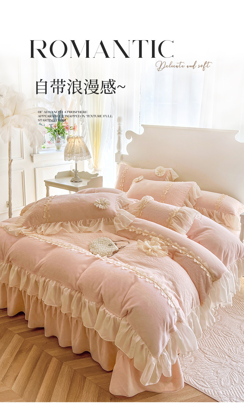 (总)乐朵家居 2025新款 南法庄园 牛奶绒 夹棉床盖四件套,粉玉,奶白