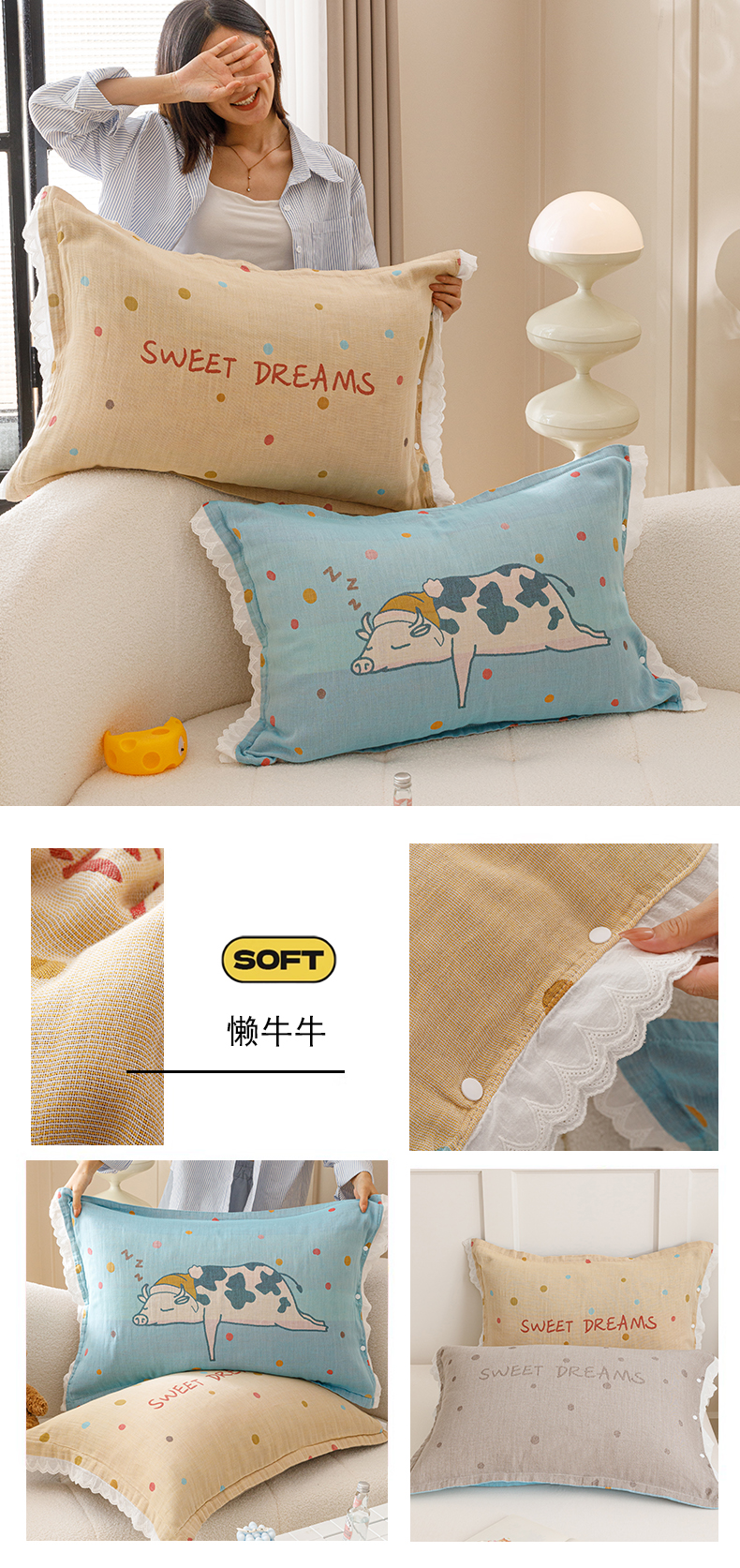 商品名称:2024新款韩系四层纱布枕套一对装花边款纯棉纽扣款枕套 懒牛牛