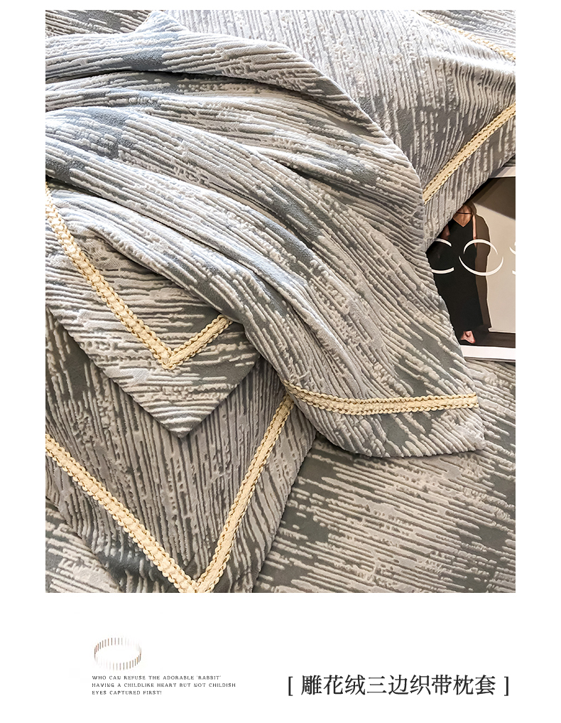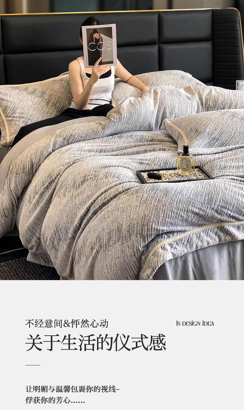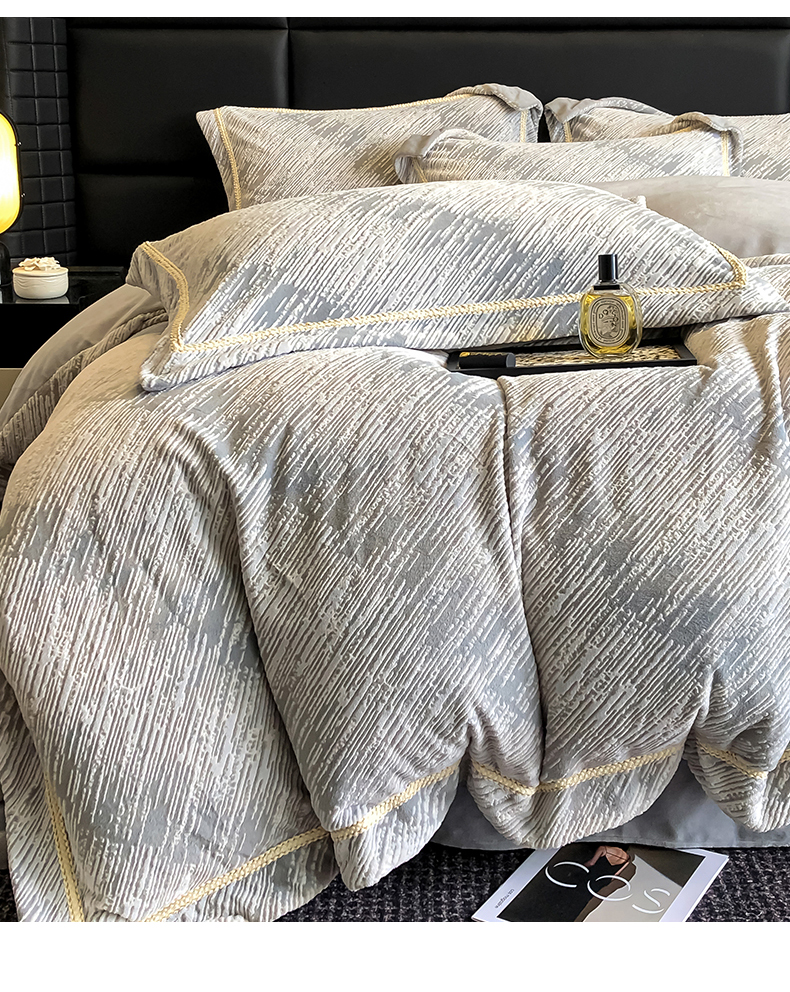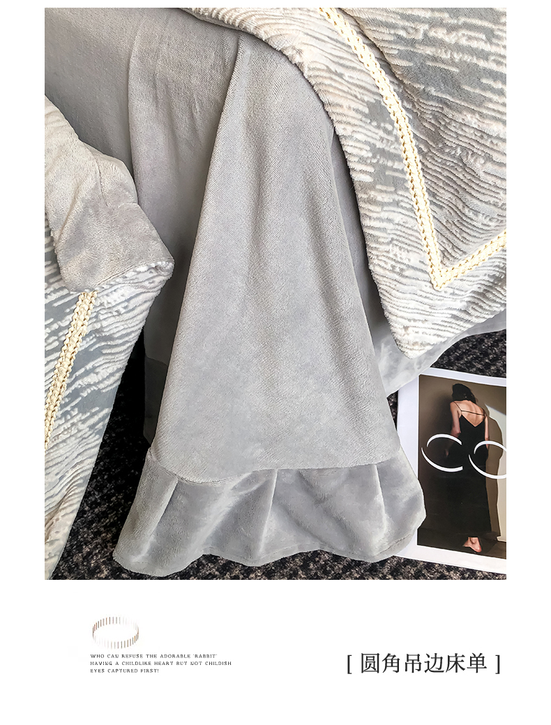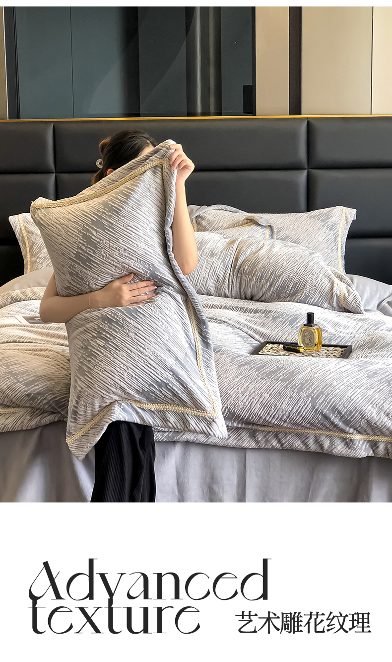 商品名称:金喜 2024新款高克重全消光牛奶绒雕花绒轻奢风四件套加厚双面牛奶绒四件套-星川鎏金梦系列 极光灰