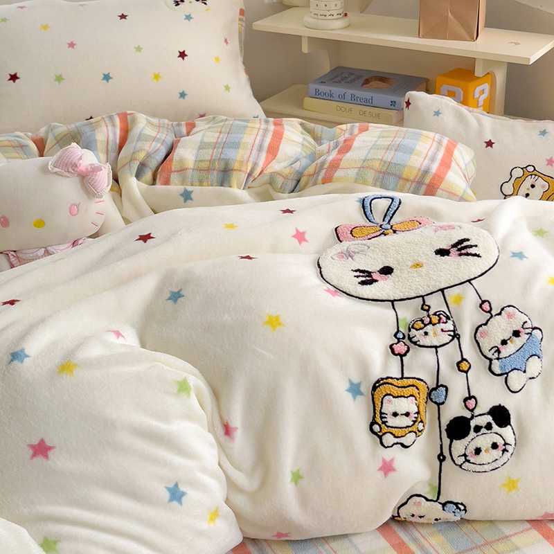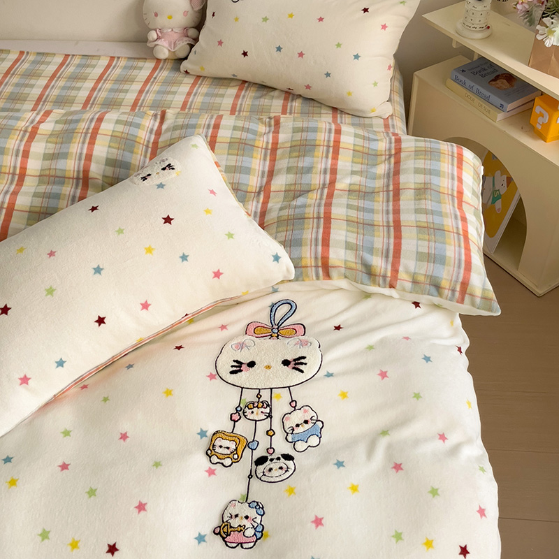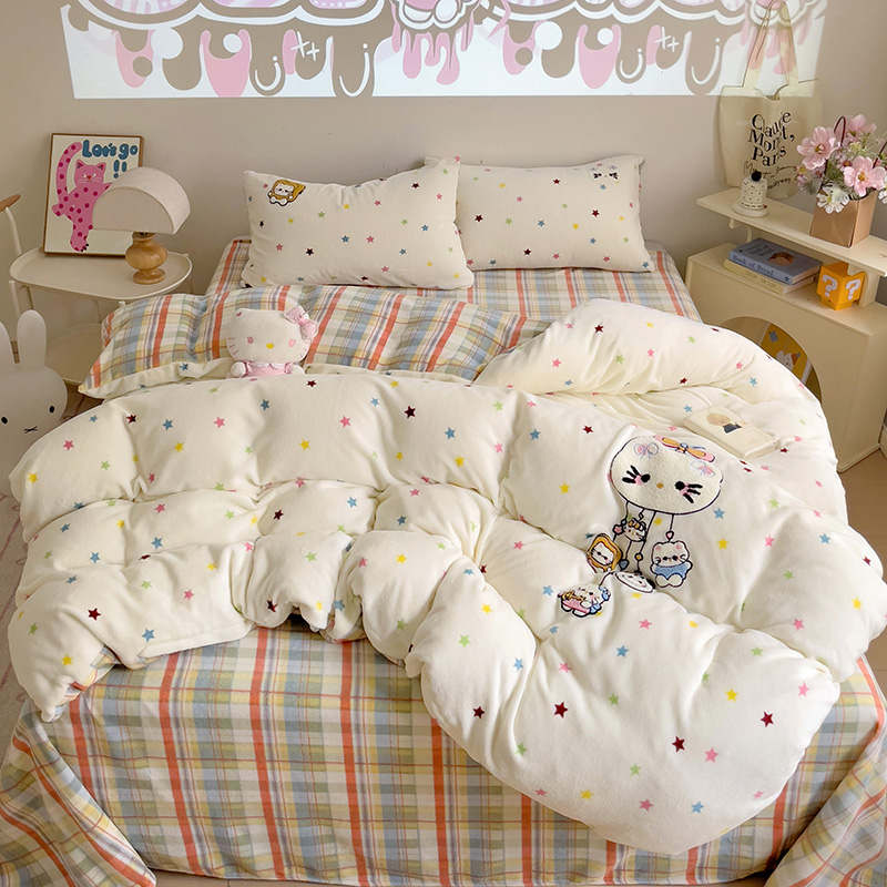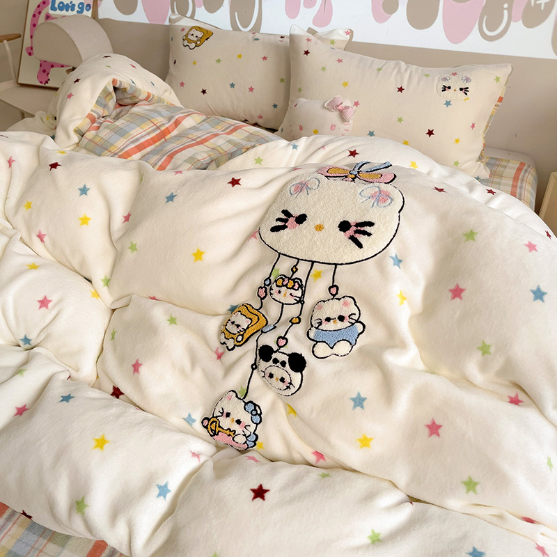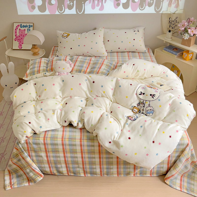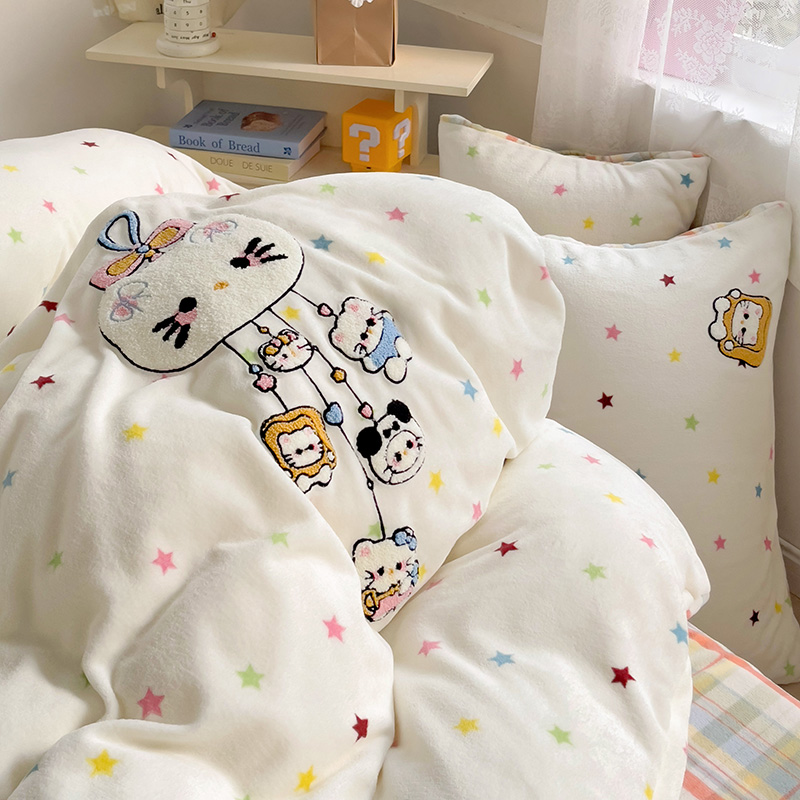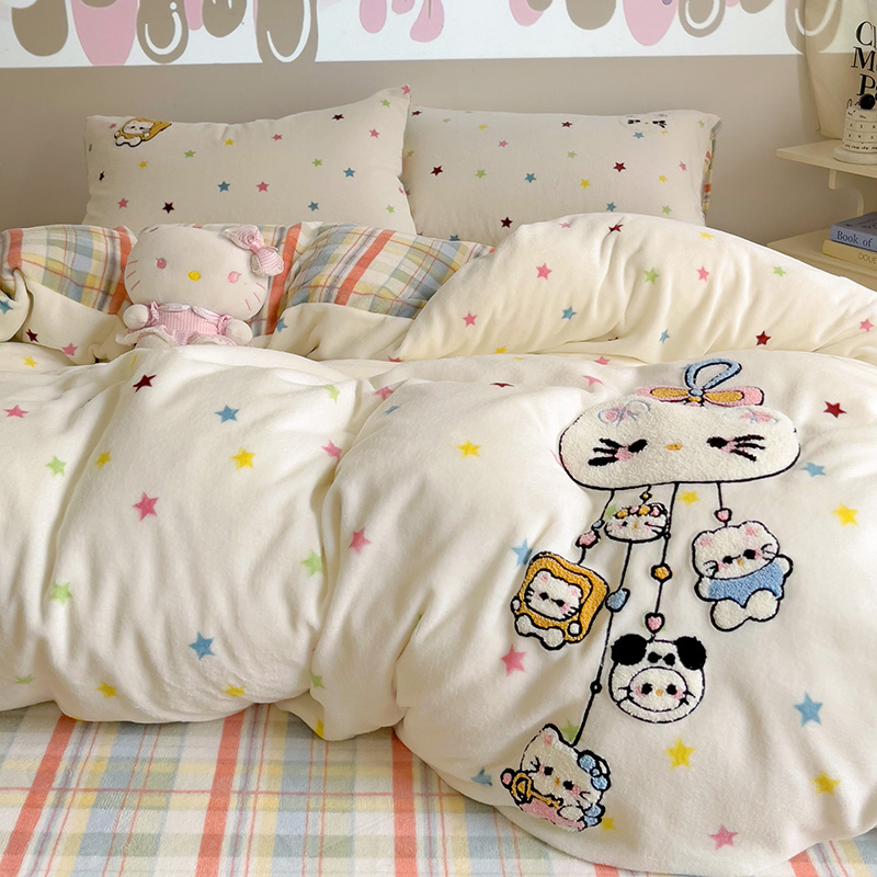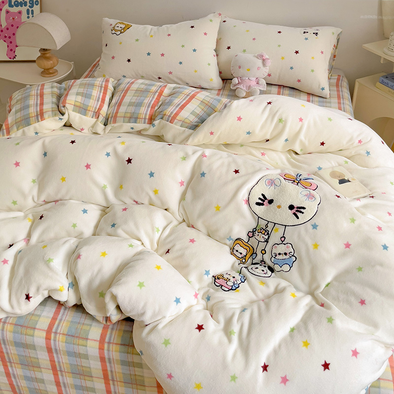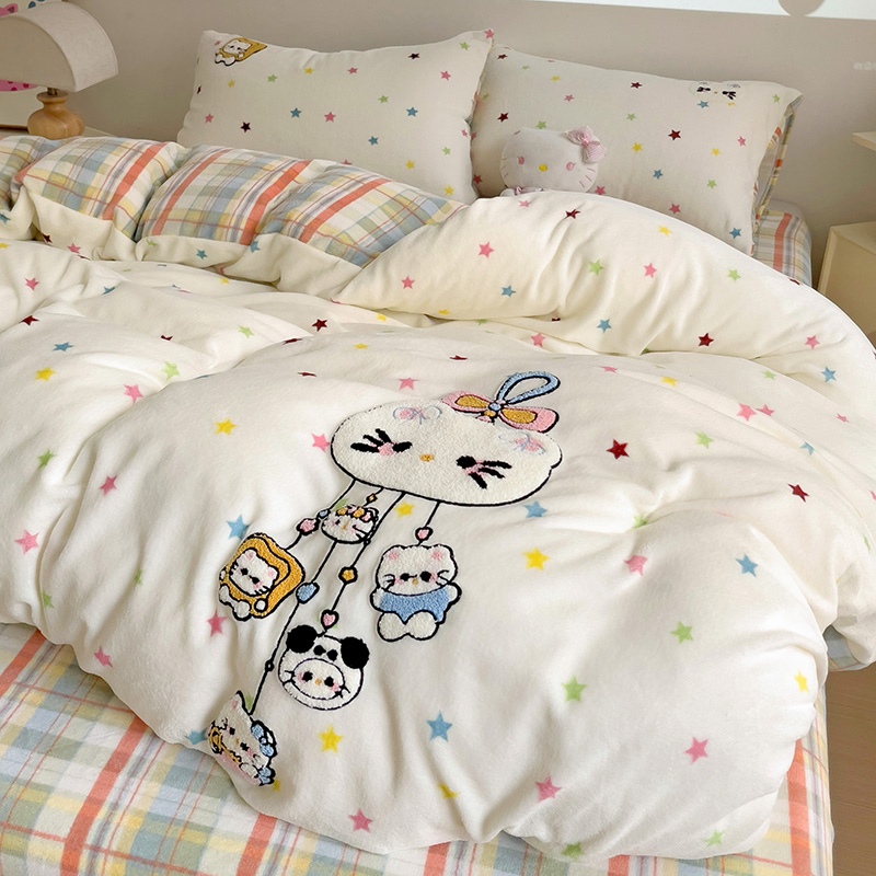 乐童家纺 2024新款高克重牛奶绒小清新印+绣系列四件套 星星风铃