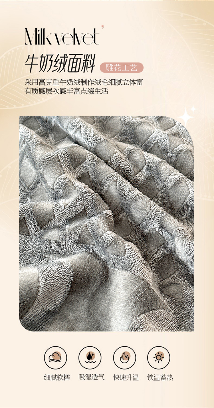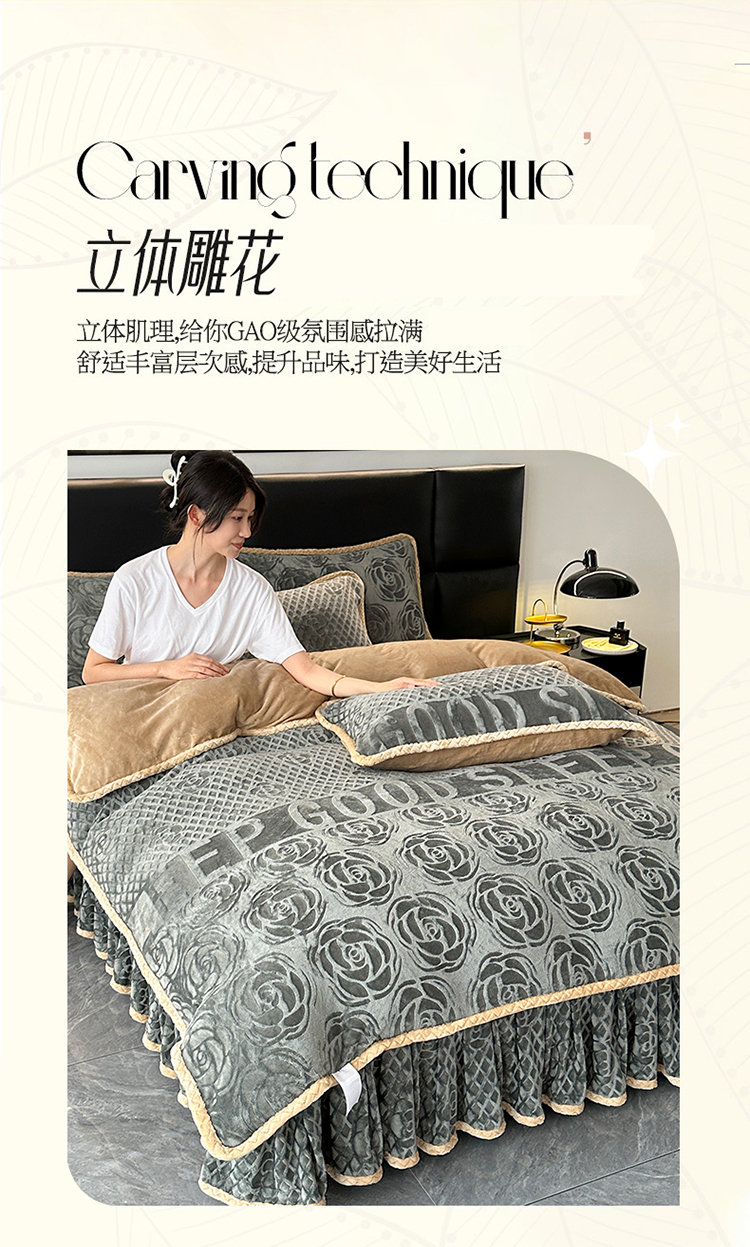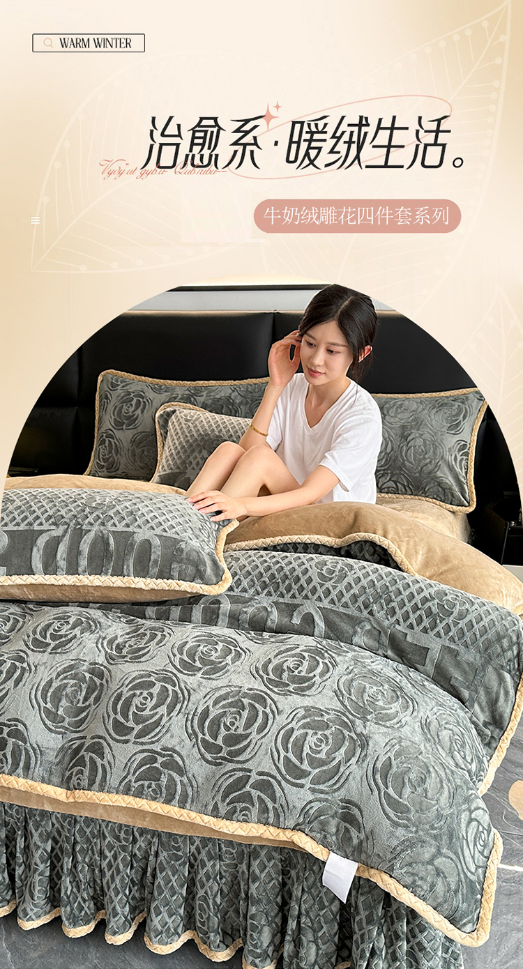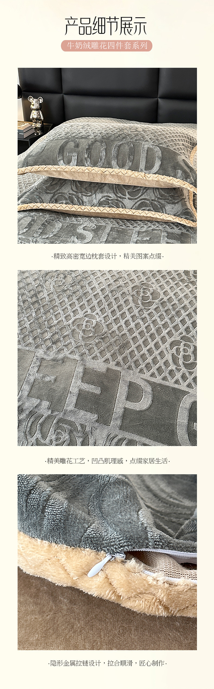 (买家秀爆款不断货)A类母婴级8D牛奶雕花绒四件套珊瑚绒四件套雪花绒四件套花卉雕花牛奶绒四件套北欧风 挚爱-经典灰