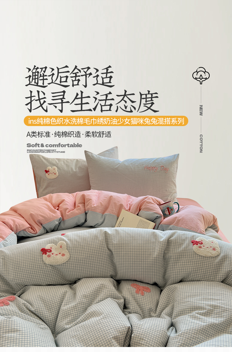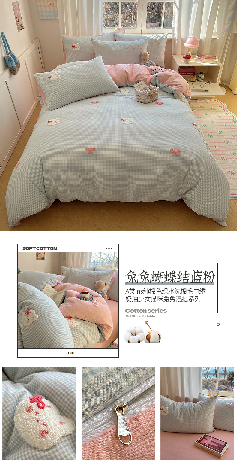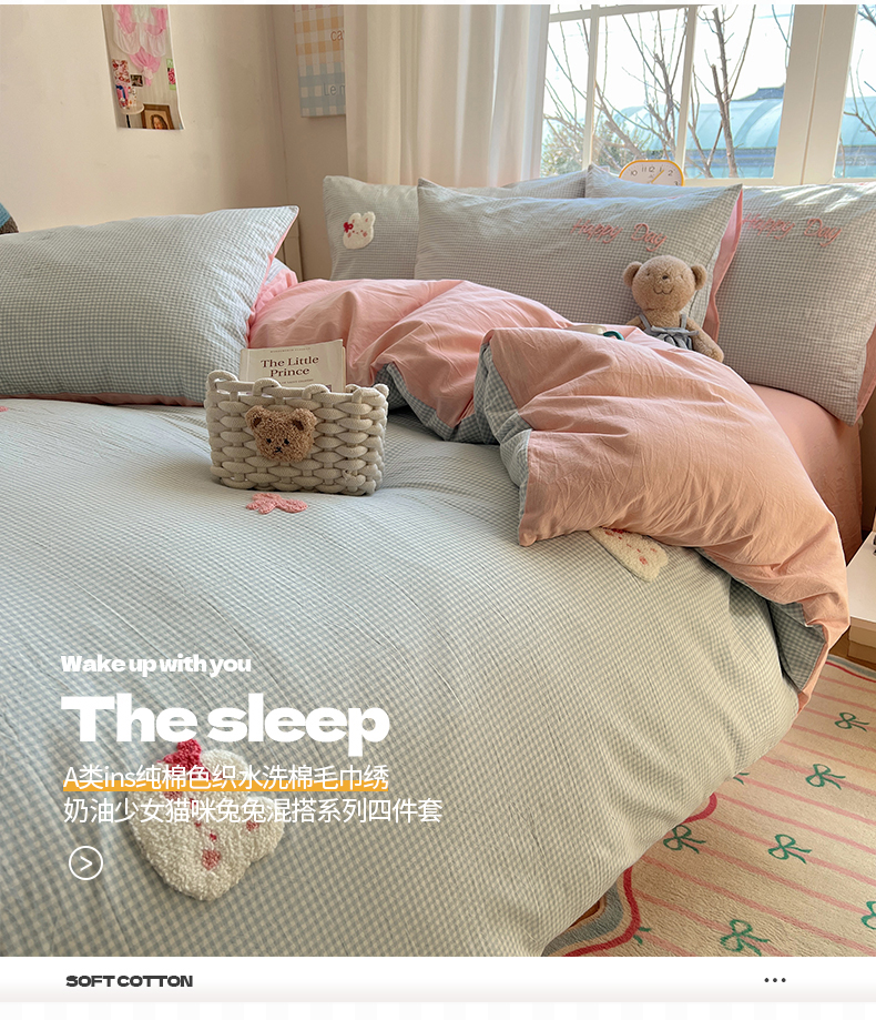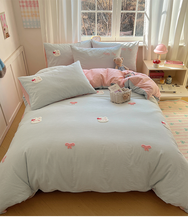 当前位置: 91家纺网 > 商品网购 > 床品套件 > 四件套 > 水洗棉四件套 > 桃子家居 2025新款A类ins纯棉色织水洗棉毛巾绣奶油少女猫咪兔兔混搭系列四件套 色织水洗棉-兔兔蝴蝶结蓝粉