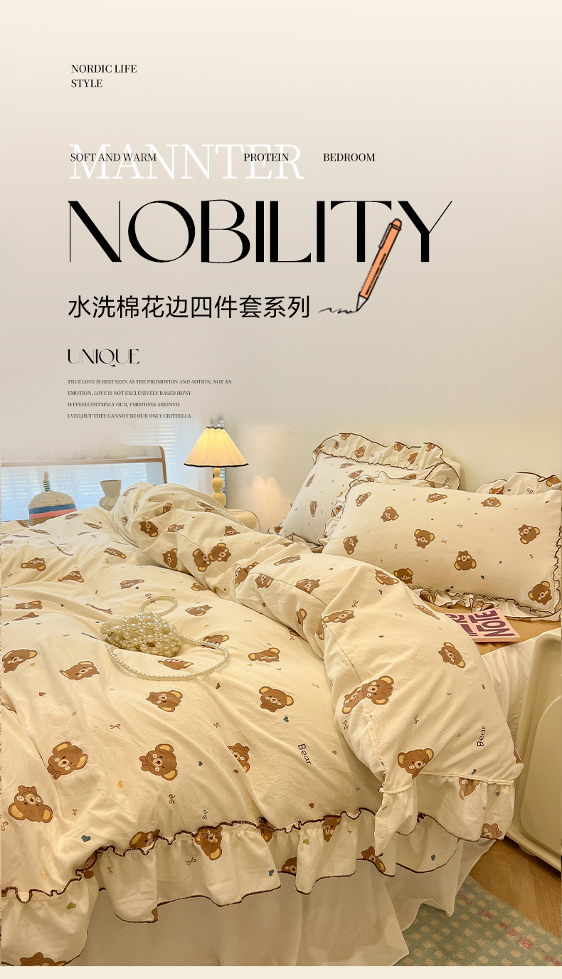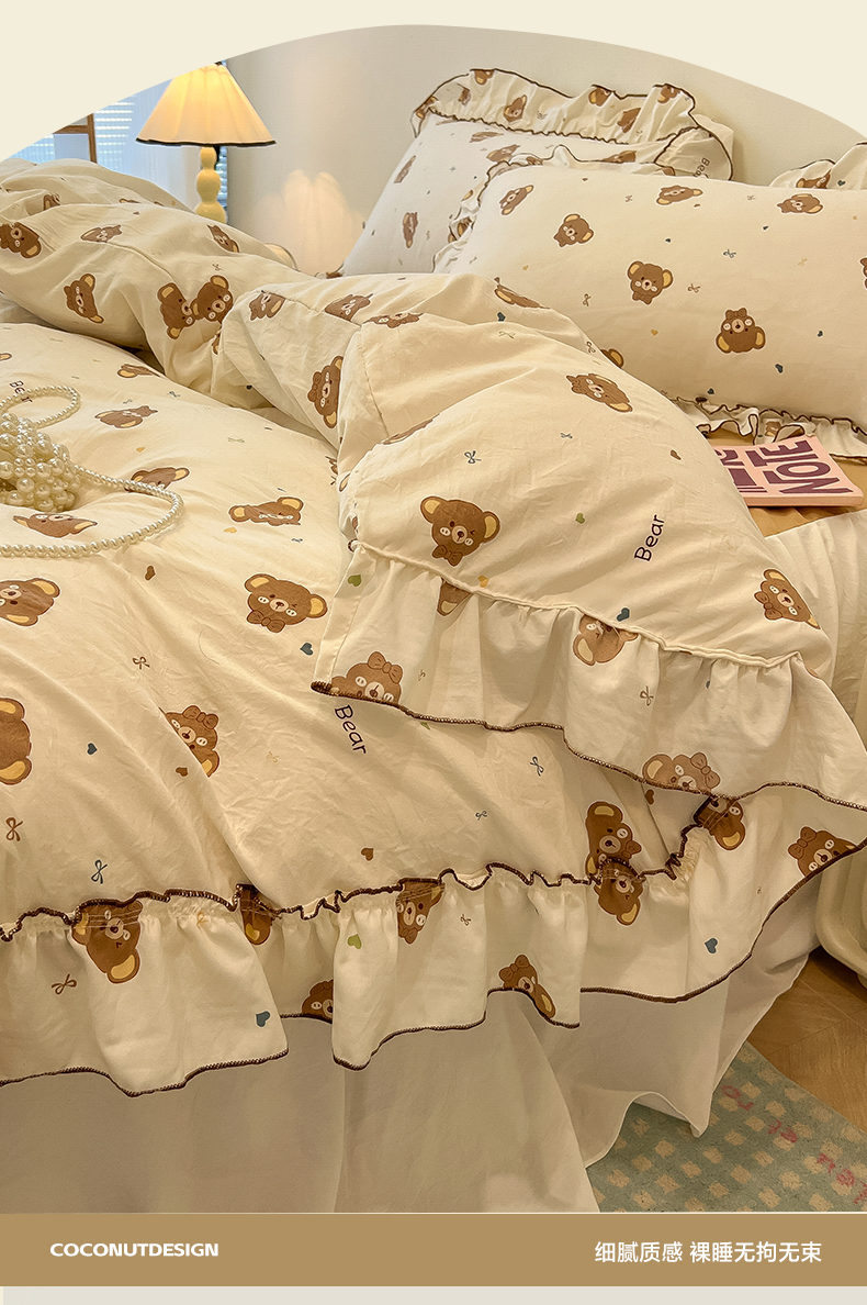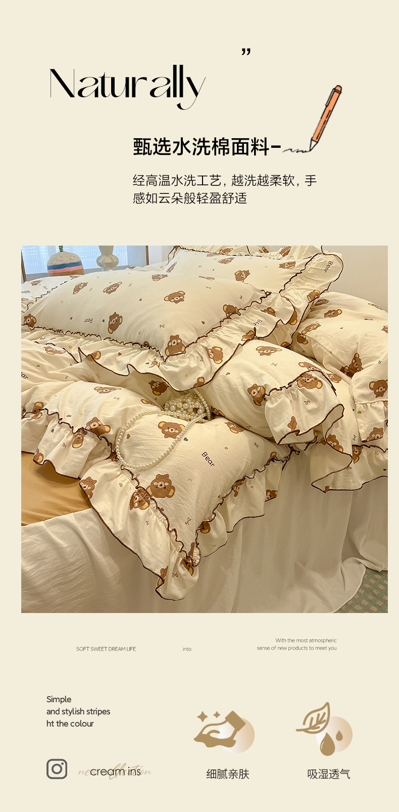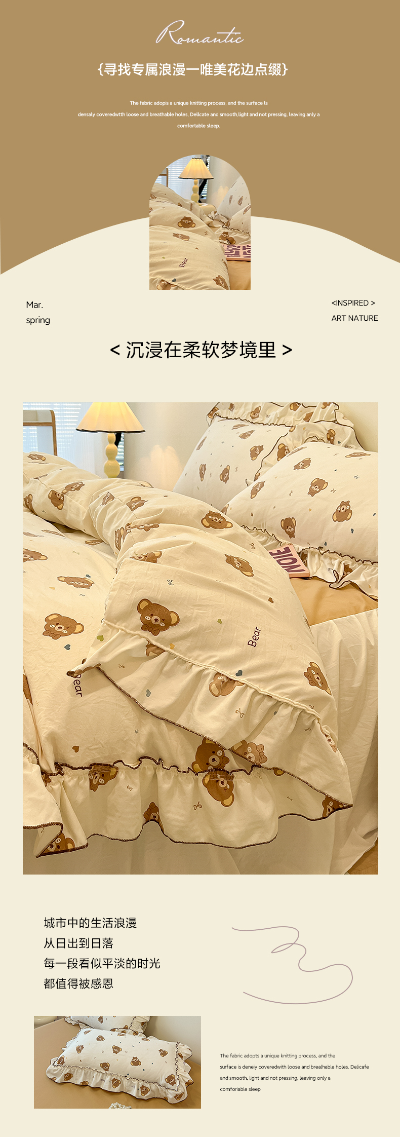 当前位置: 91家纺网 > 商品网购 > 床品套件 > 四件套 > 其它四件套 > 盼季家纺 2025新款公主风花边小清新水洗棉床上四件套床单被套床裙三件套-风格一 bear小熊