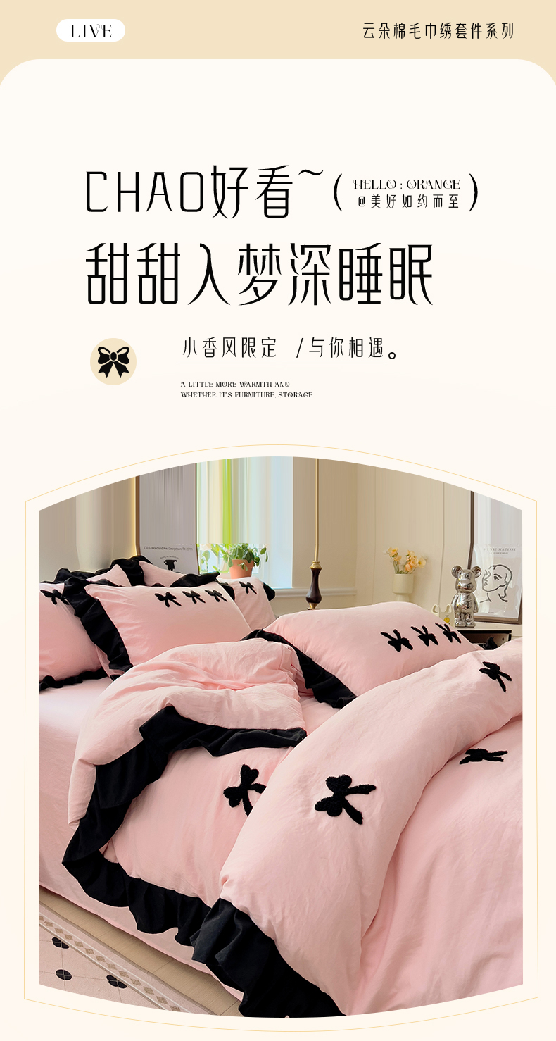 当前位置: 91家纺网 > 商品网购 > 床品套件 > 四件套 > 毛巾绣四件套 > 梦之岛 2025新款韩版小香风赫本风云朵棉毛巾绣四件套 小香风蝴蝶结-玉