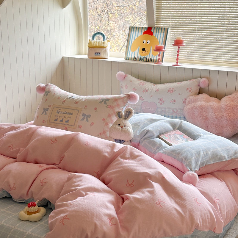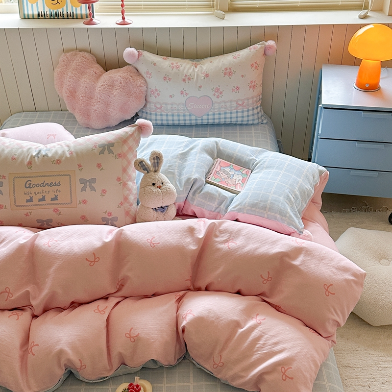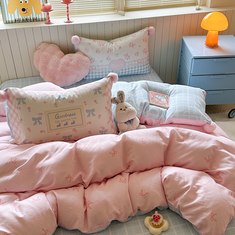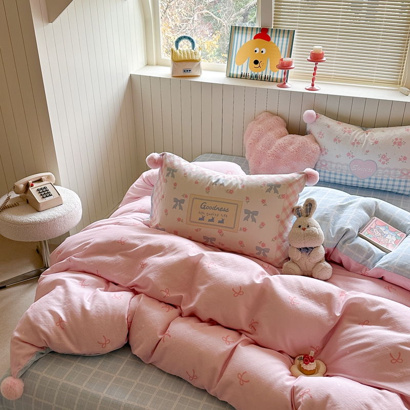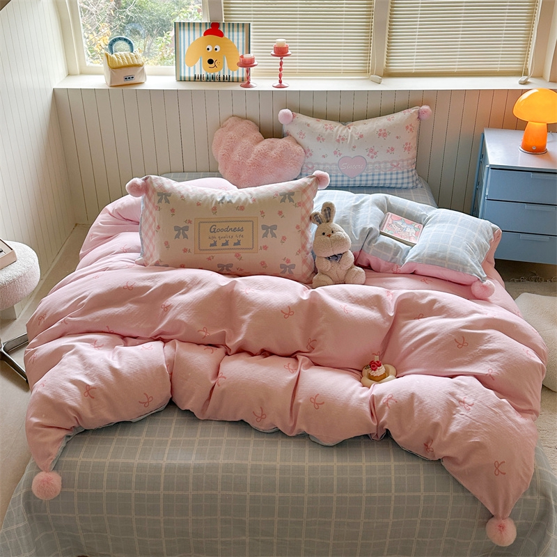 (总)柚子YOUTH 225新款全棉双层纱球球款四件套,薄荷绿条,波点霉霉,波点小丑,蓝心,芊芊结,碎花点点