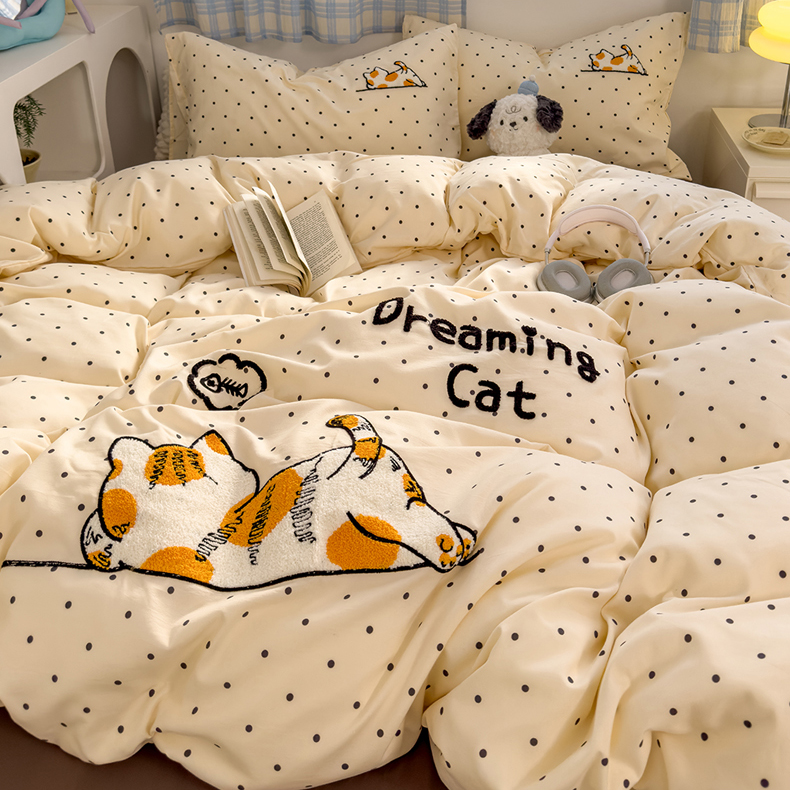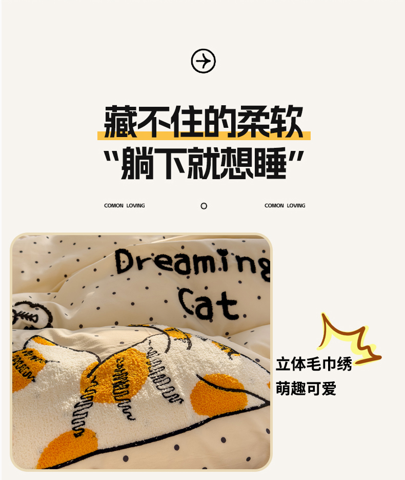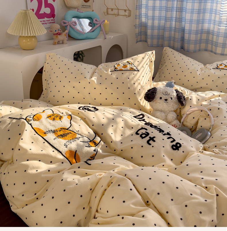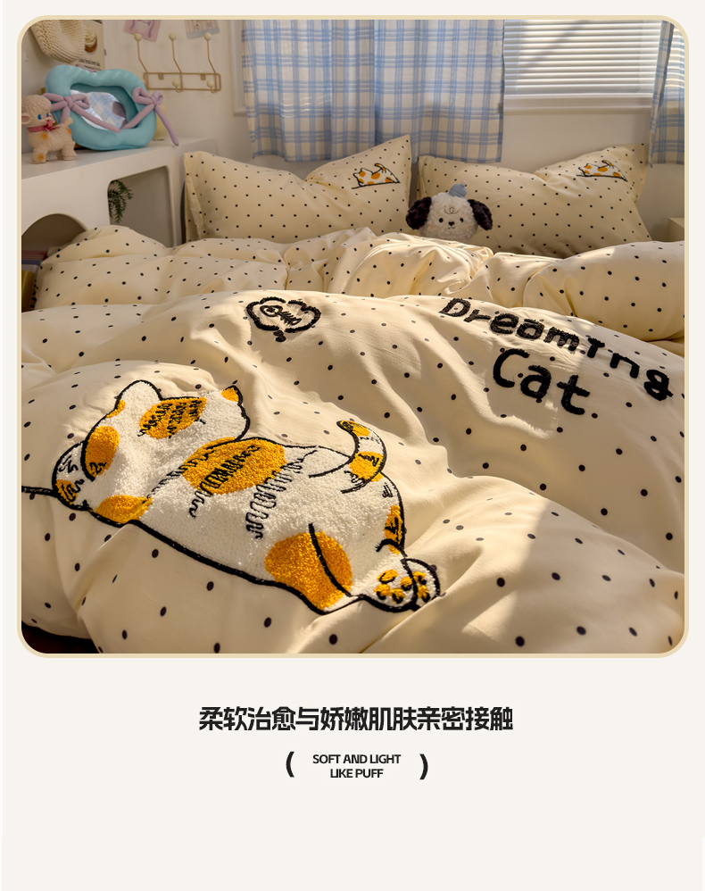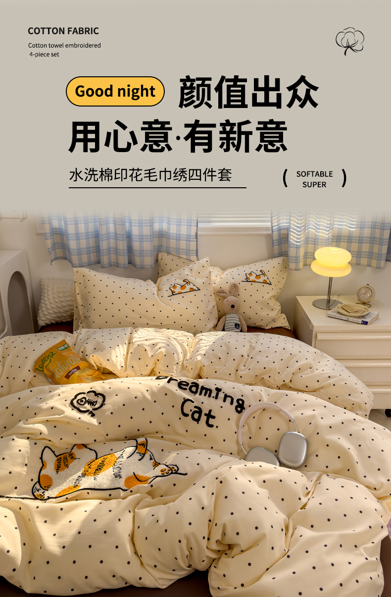 当前位置: 91家纺网 > 商品网购 > 床品套件 > 四件套 > 水洗棉四件套 > 优兰朵 2025新款亲肤卡通水洗棉毛巾绣学生床品四件套 橘猫-波点米咖