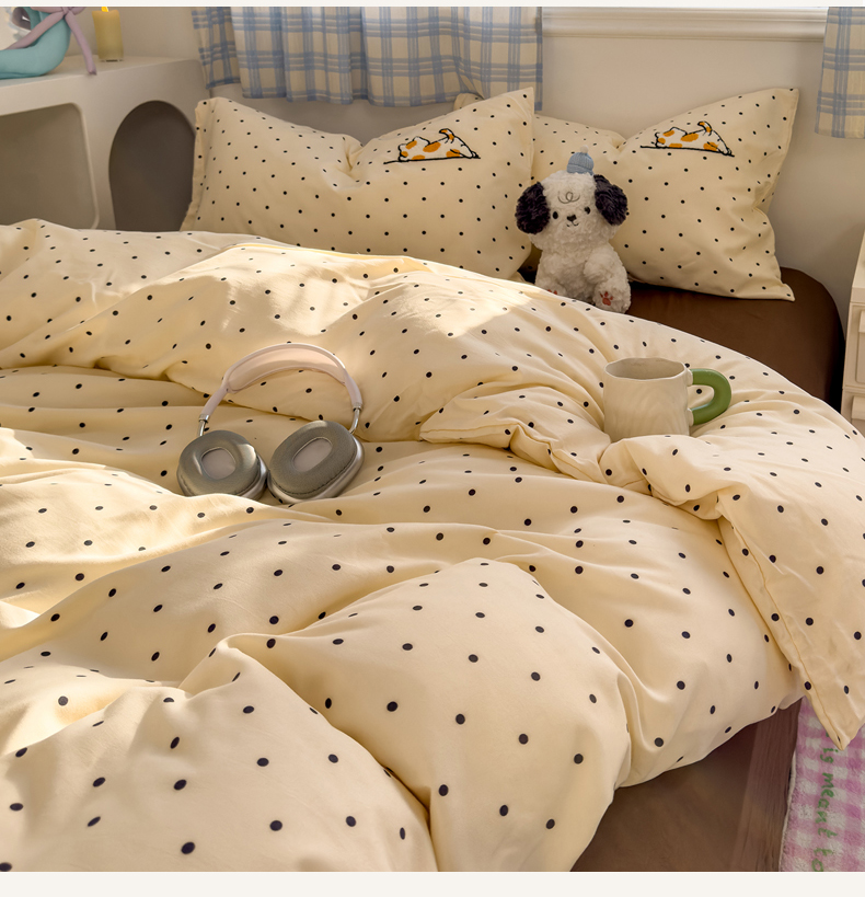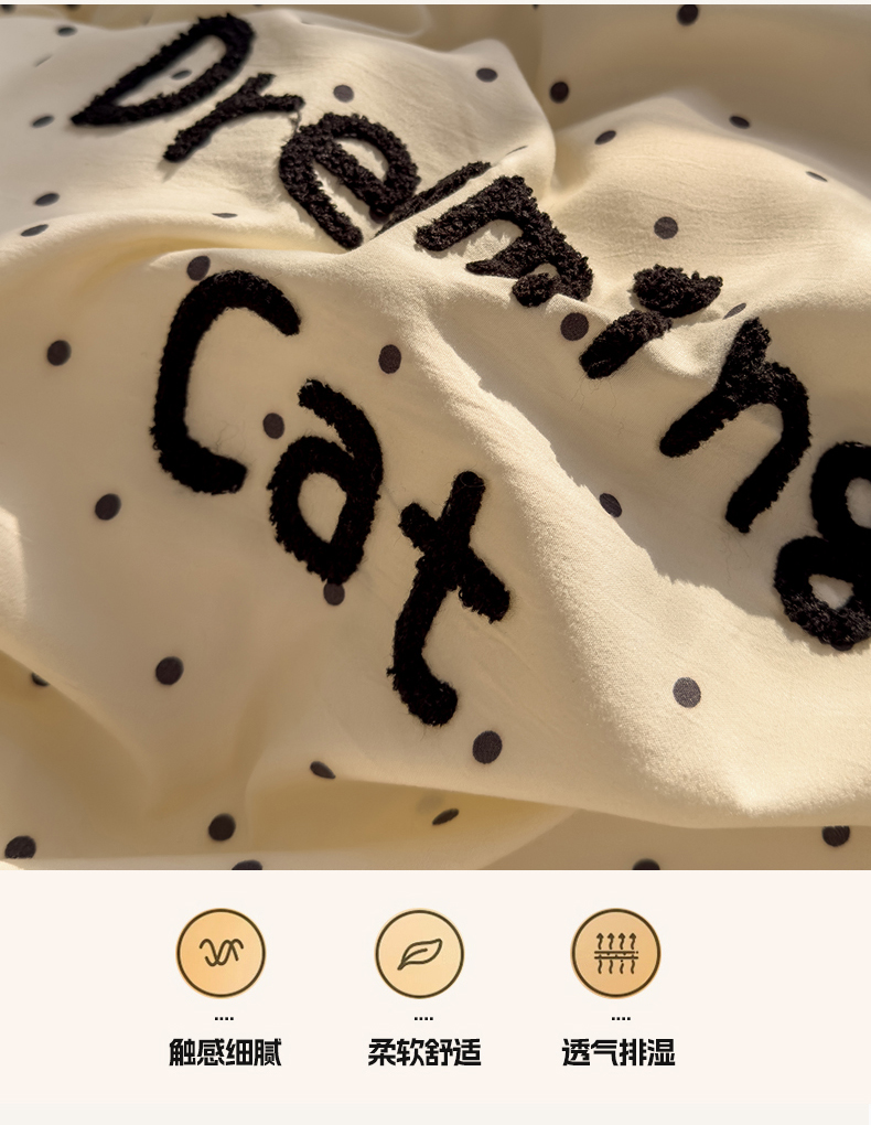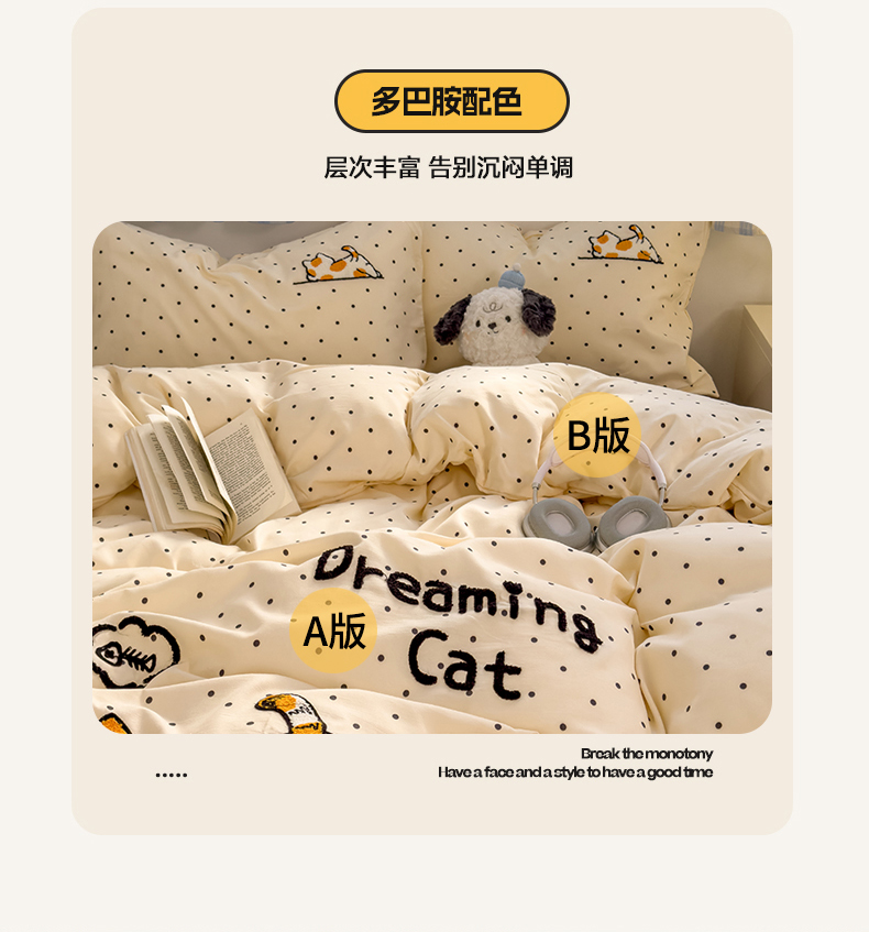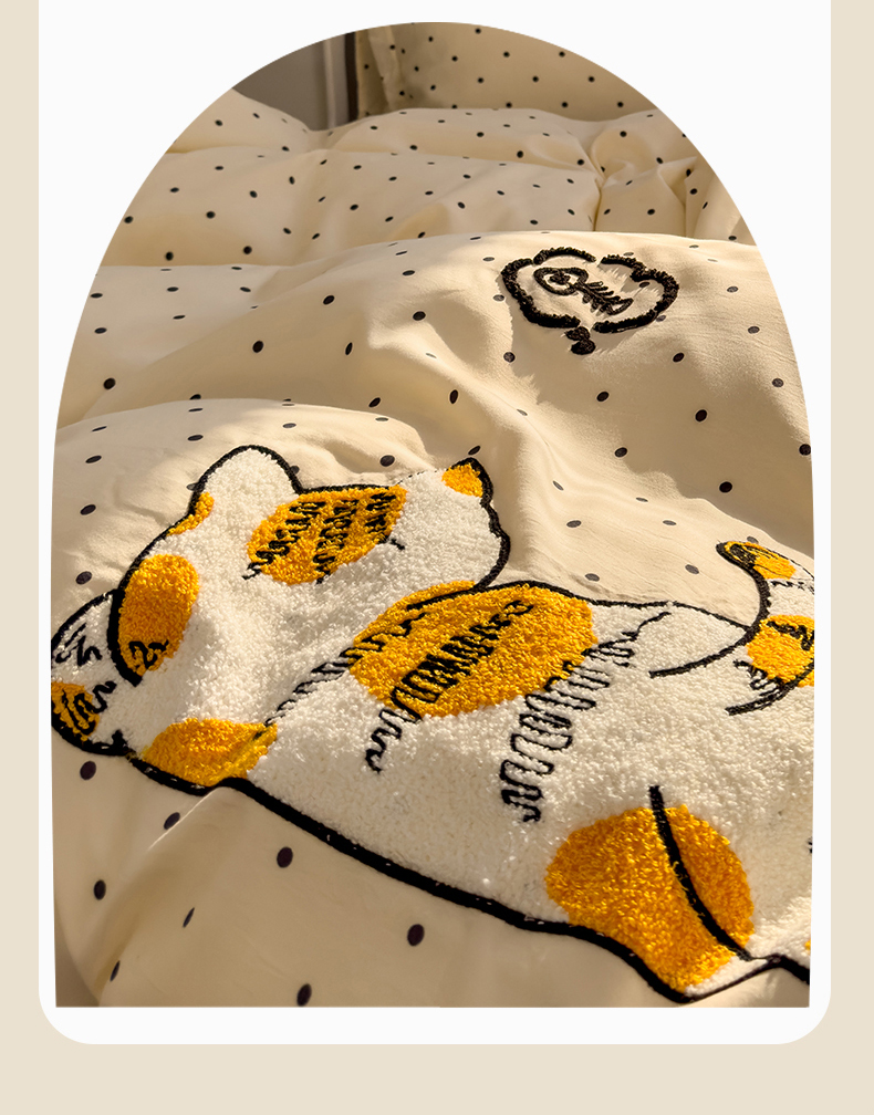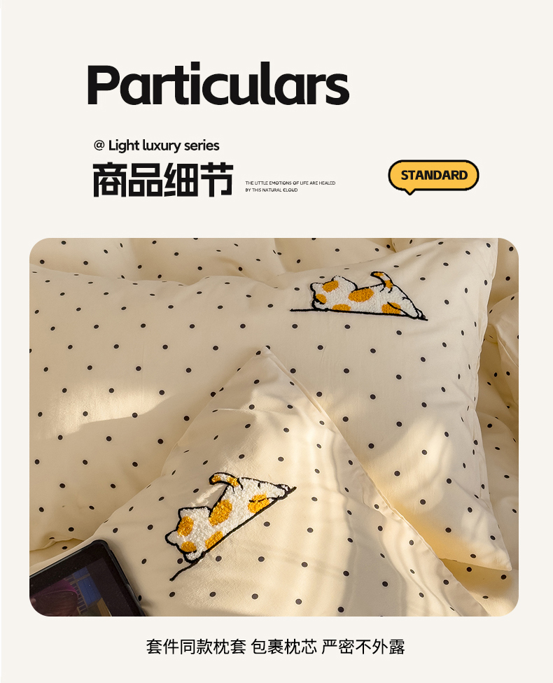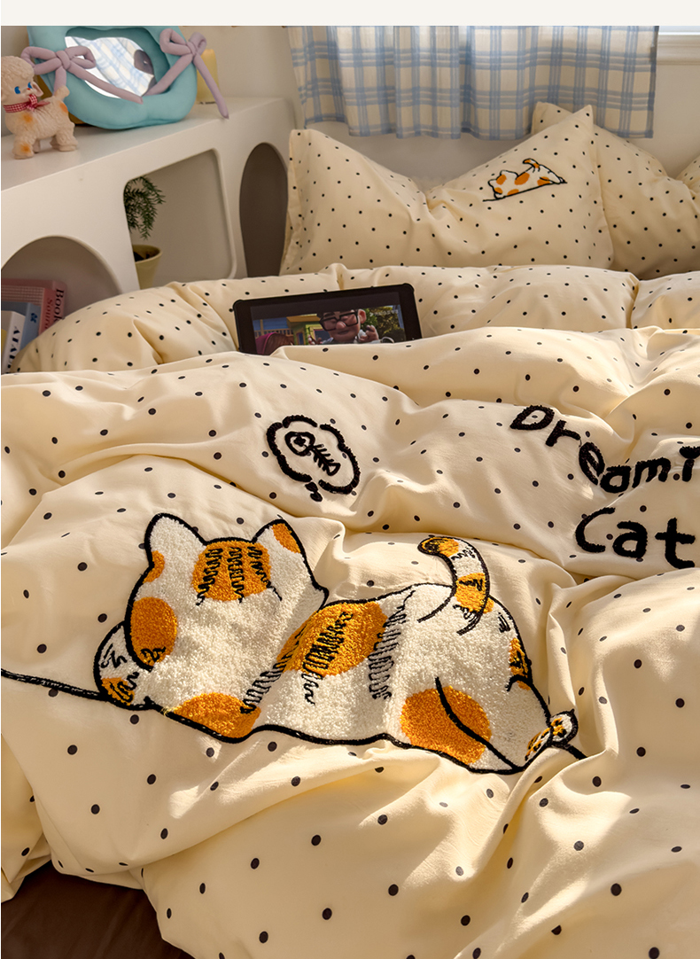 当前位置: 91家纺网 > 商品网购 > 床品套件 > 四件套 > 水洗棉四件套 > 优兰朵 2025新款亲肤卡通水洗棉毛巾绣学生床品四件套 橘猫-波点米咖