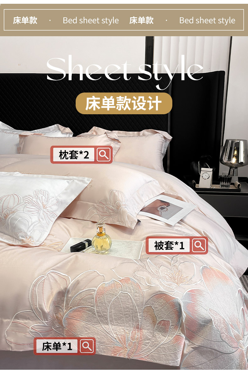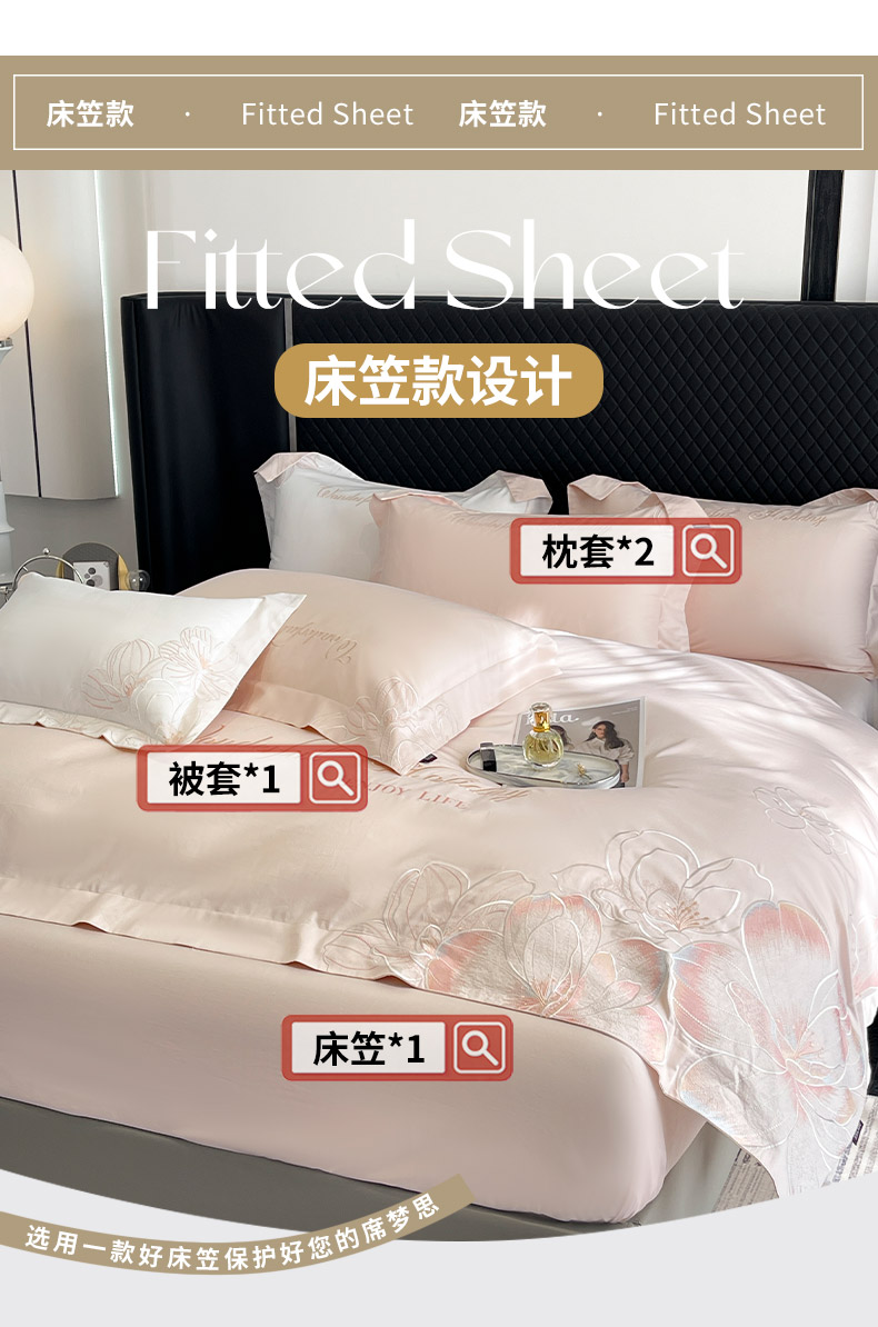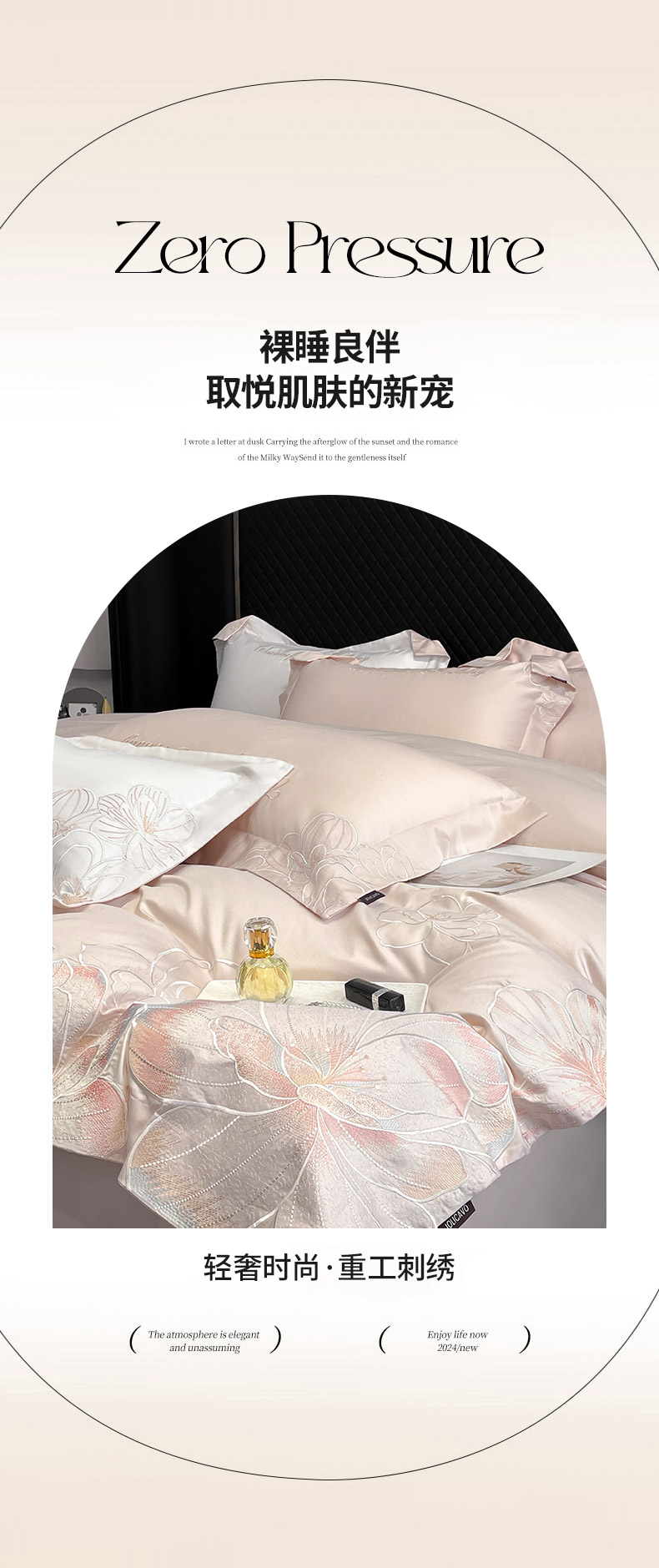 商品名称:2025新款轻奢风A类100支长绒棉四件套全棉纯棉重工刺绣床单床笠夹棉床笠床盖款高端床上用品-星慕 颜粉