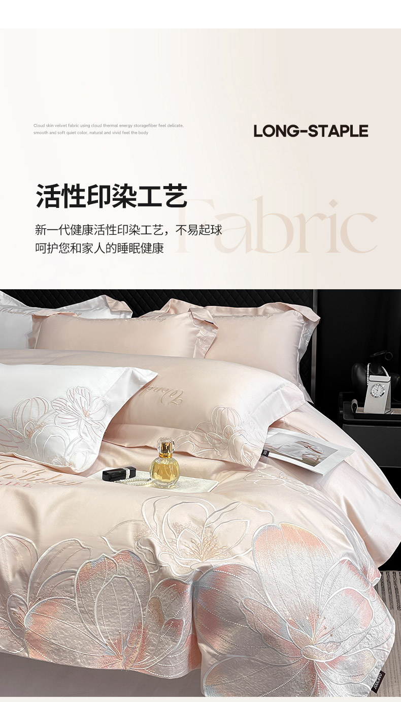 (总) 2025春夏长绒棉四件套纯棉全棉轻奢风床单被套重工刺绣床上用品,芊羽梦-白粉,芊羽梦-茶绿,芊羽梦-黛紫,芊羽梦-慕蓝,芊羽梦-颜粉
