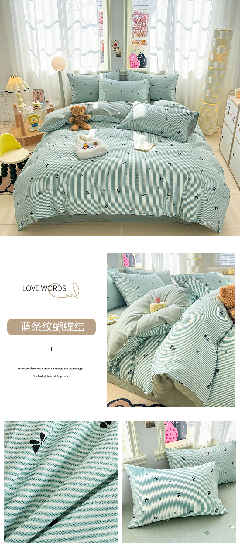 简宜家居(朝初家纺) 2025新款40支13070纯棉四件套 蓝条纹蝴蝶结
