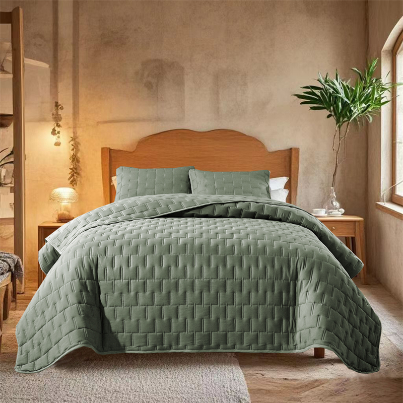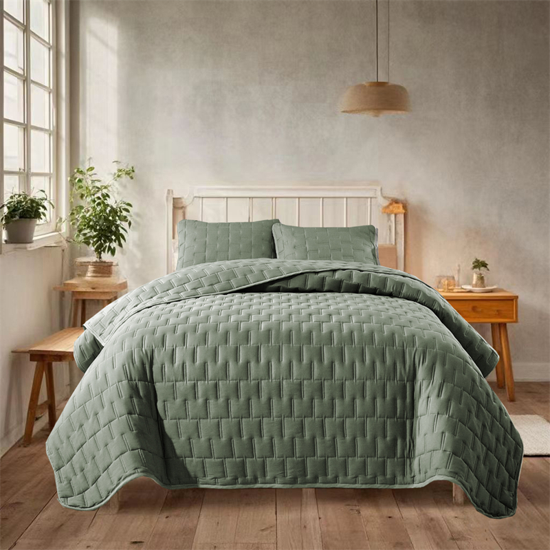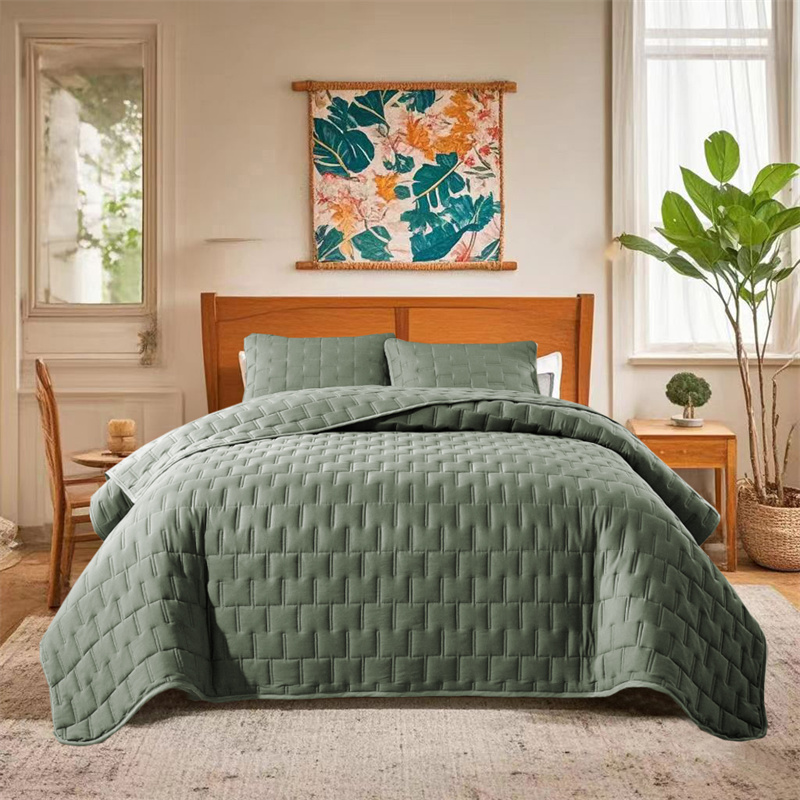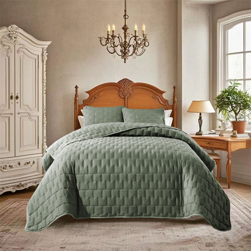 (总)温宁2025新款跨境外贸专供正方格床盖,绿色,米色,银灰