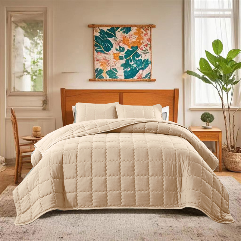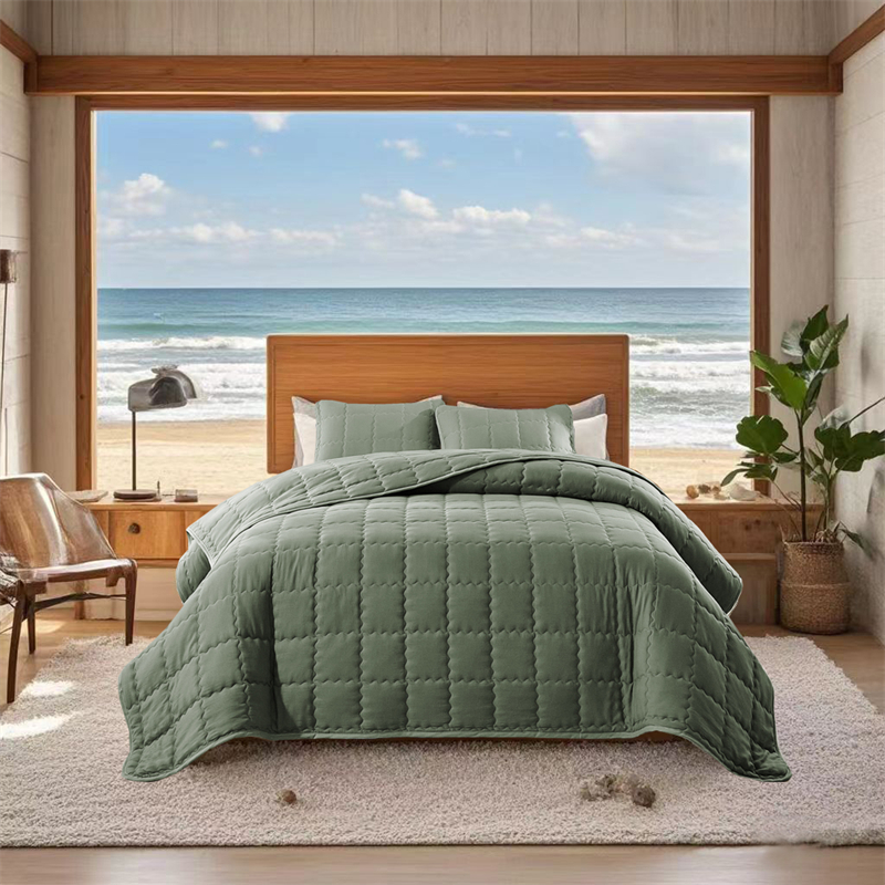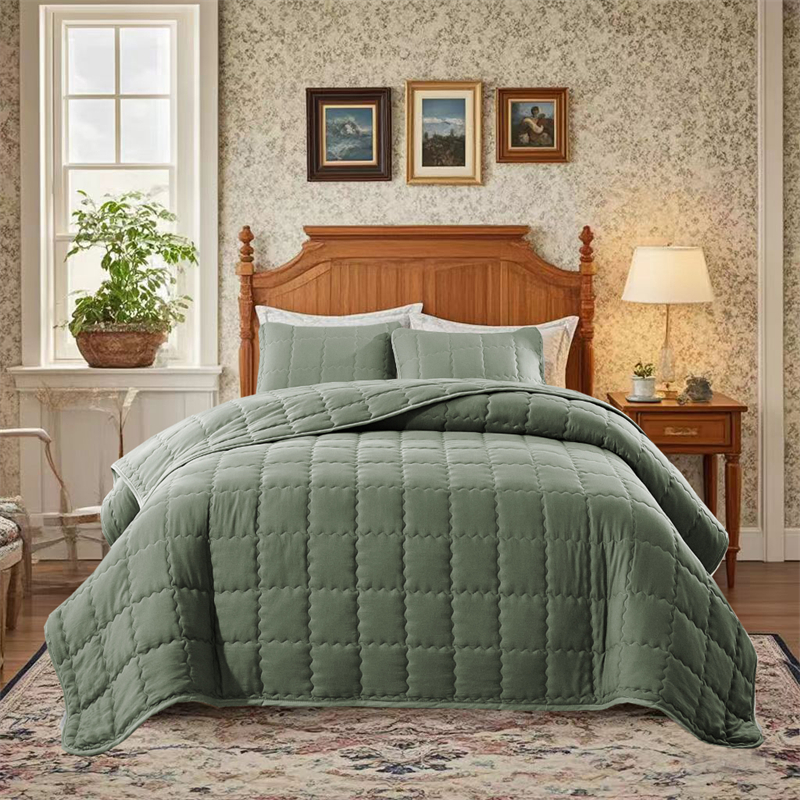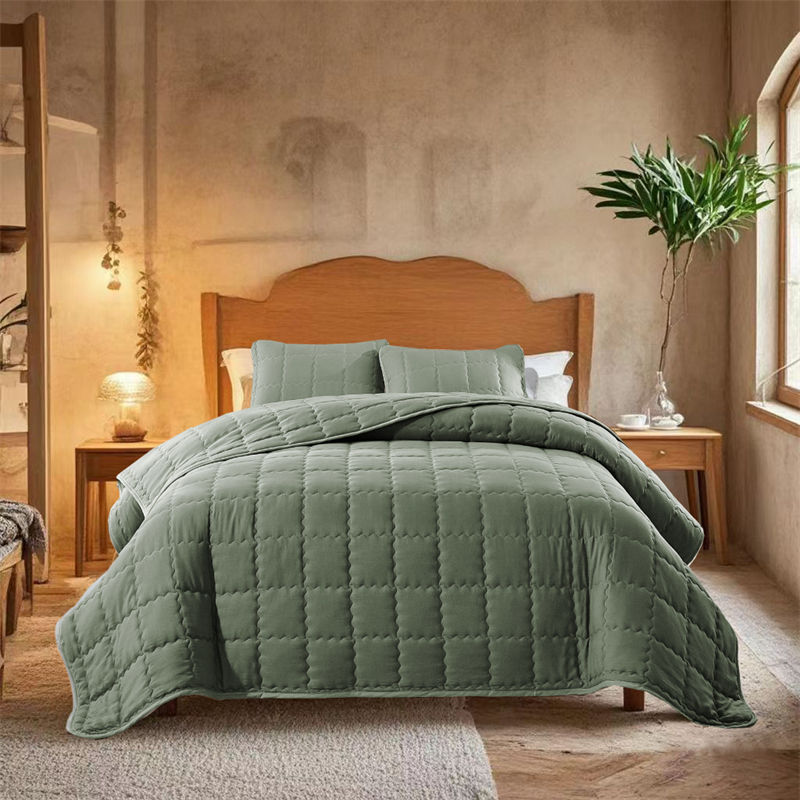 (总)温宁家纺 2025新款跨境双面化纤水洗棉小方块夹棉四季床盖(国外也当做夏被),绿色,米色,银灰