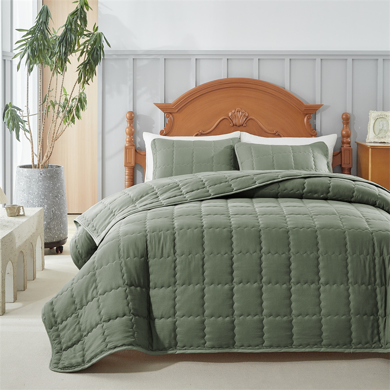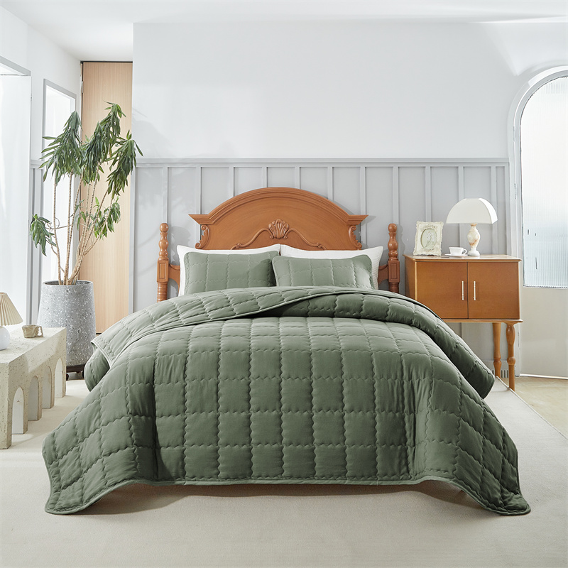 (总)温宁2025新款跨境外贸专供正方格床盖,绿色,米色,银灰