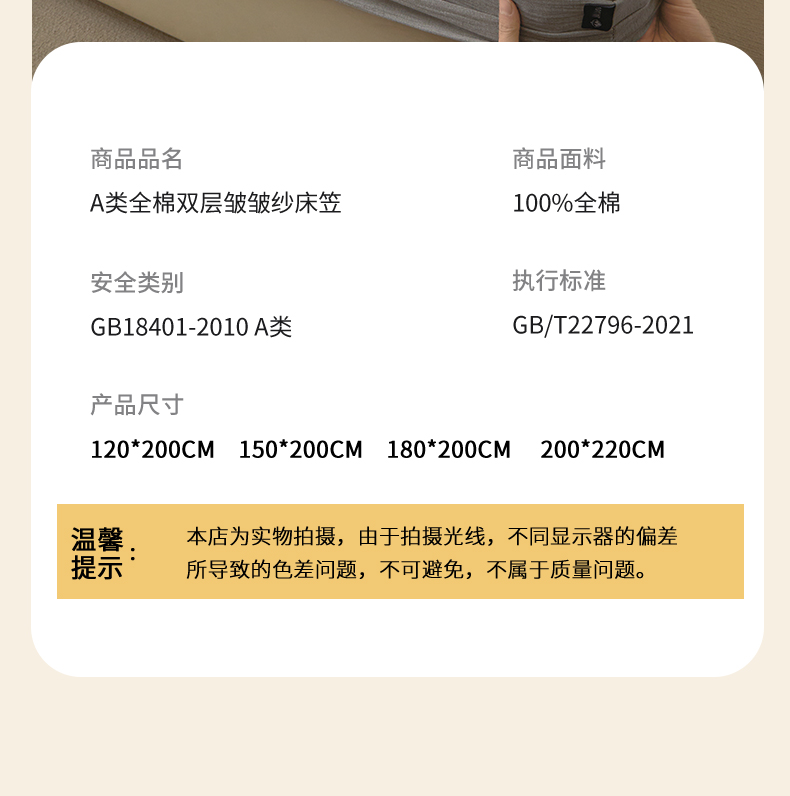 商品名称:(总)鑫钰 2025新款A类全棉双棉皱皱纱床笠