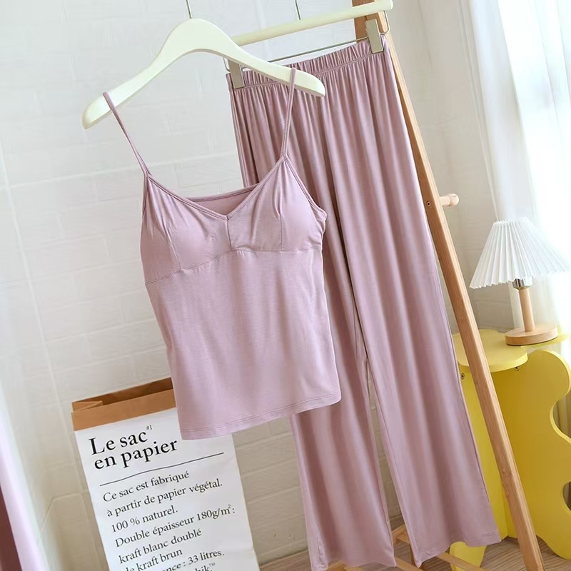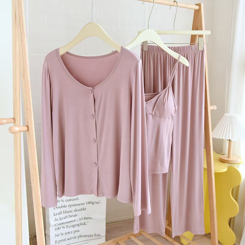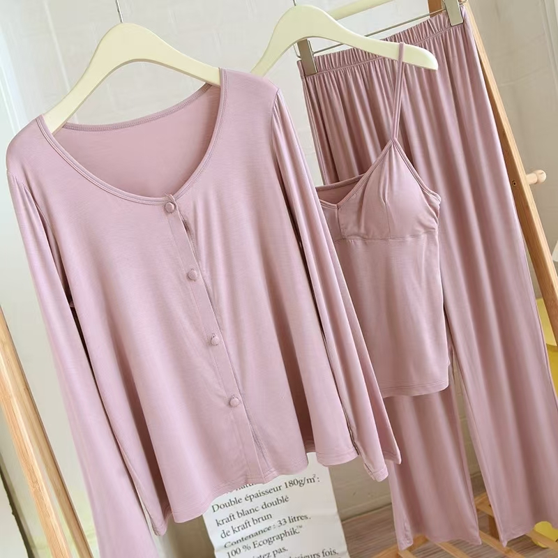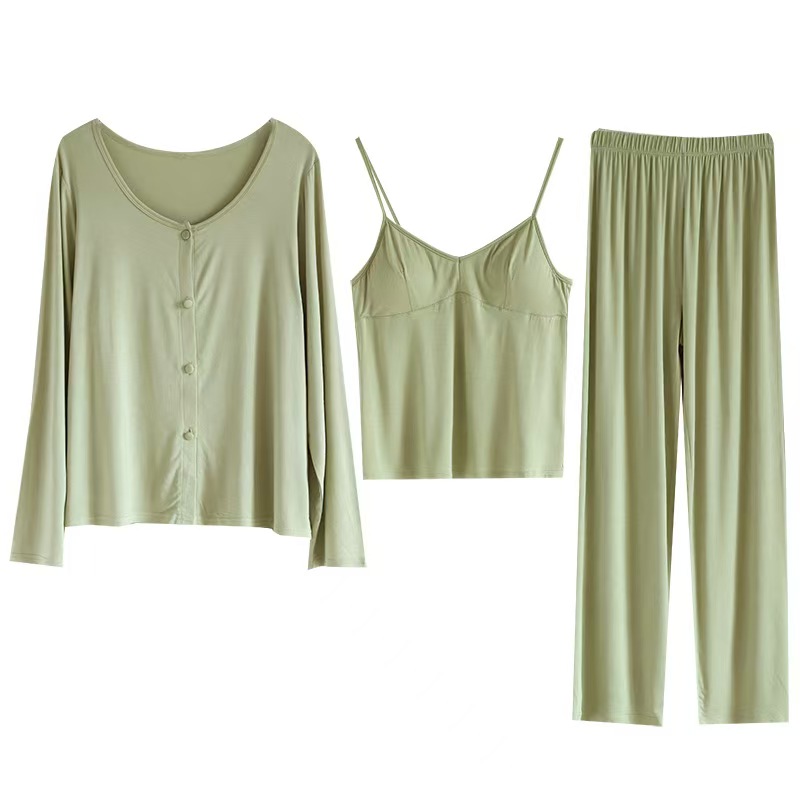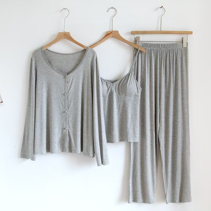 商品名称:洛兰沙家居馆【只代发】【只代发】 2025新款外贸欧美风淑女风莫代尔睡衣女春夏秋开衫短袖吊带三件套长裤家居服 三件套灰色