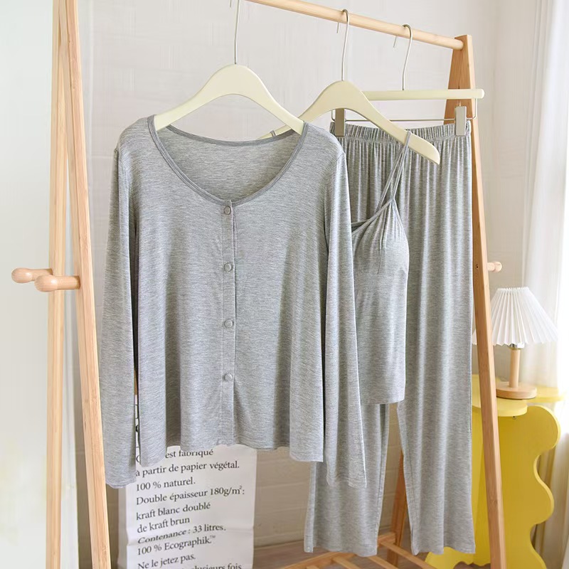 洛兰沙家居馆【只代发】【只代发】 2025新款外贸欧美风淑女风莫代尔睡衣女春夏秋开衫短袖吊带三件套长裤家居服 三件套灰色
