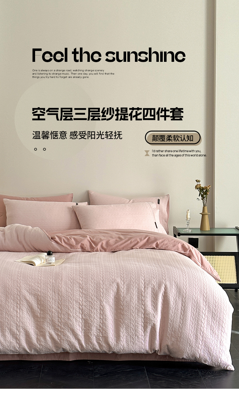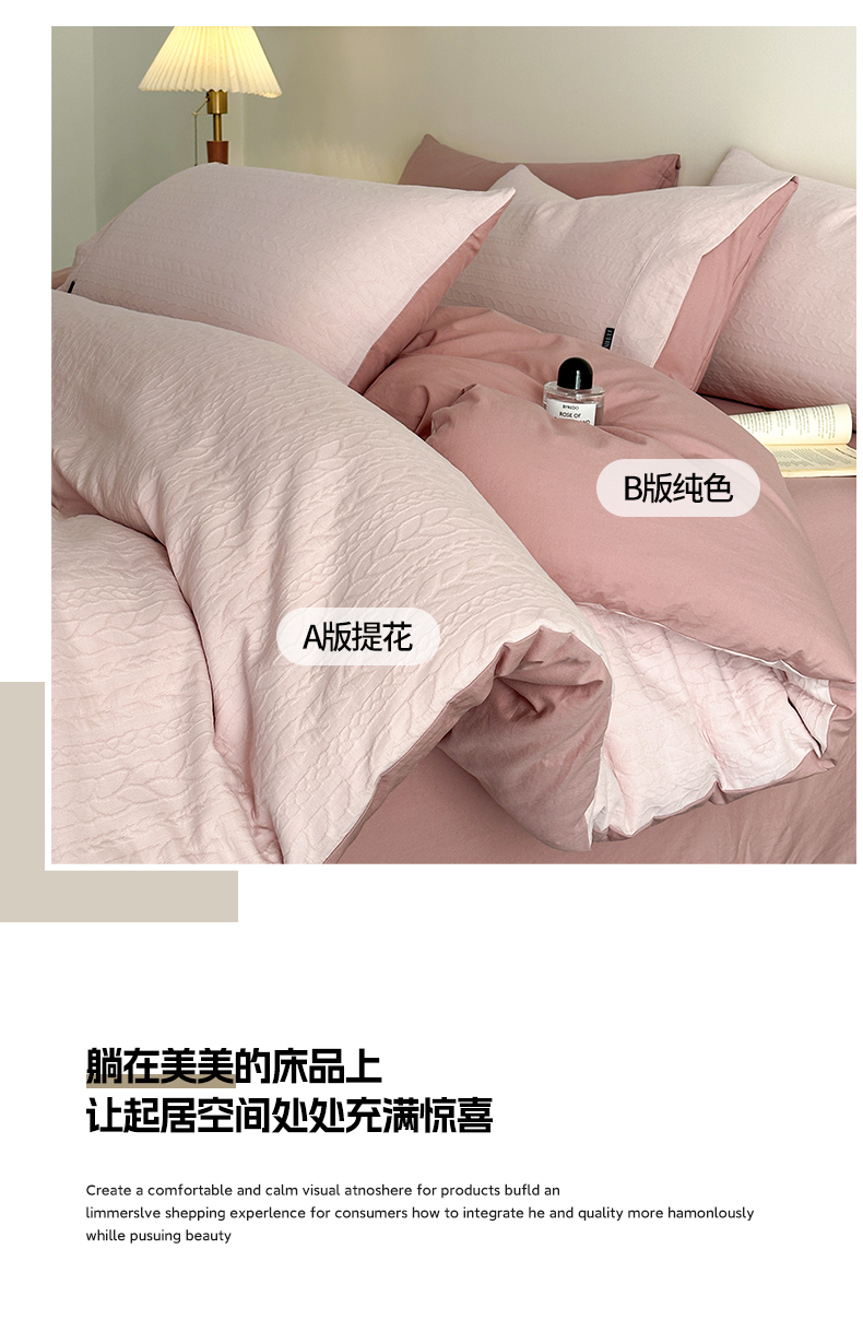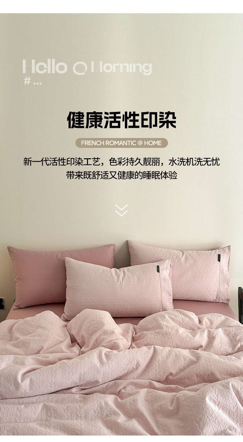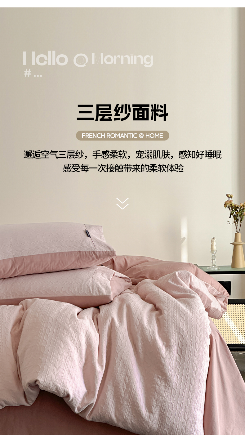 当前位置: 91家纺网 > 商品网购 > 床品套件 > 四件套 > 其它四件套 > 卡巴伦家纺 2025全棉A类空气层三层纱提花四件套 幸福-藕粉