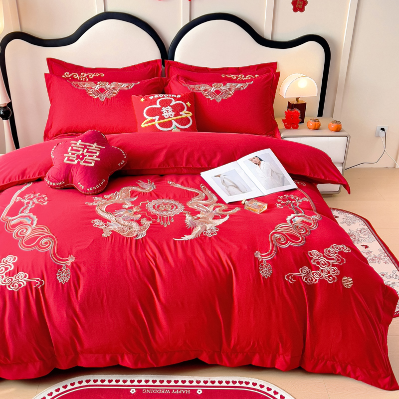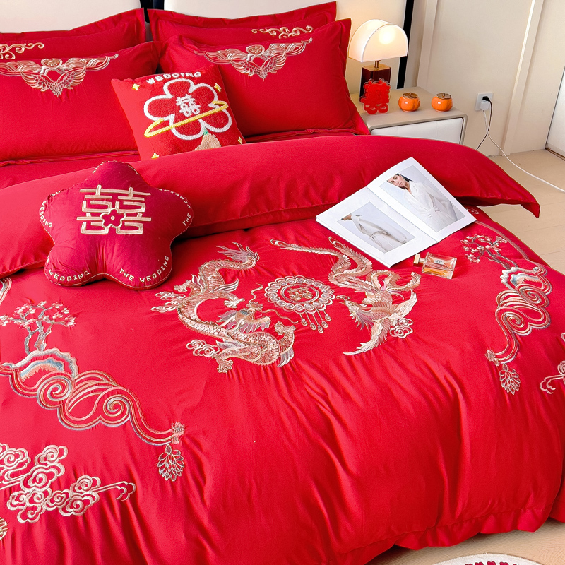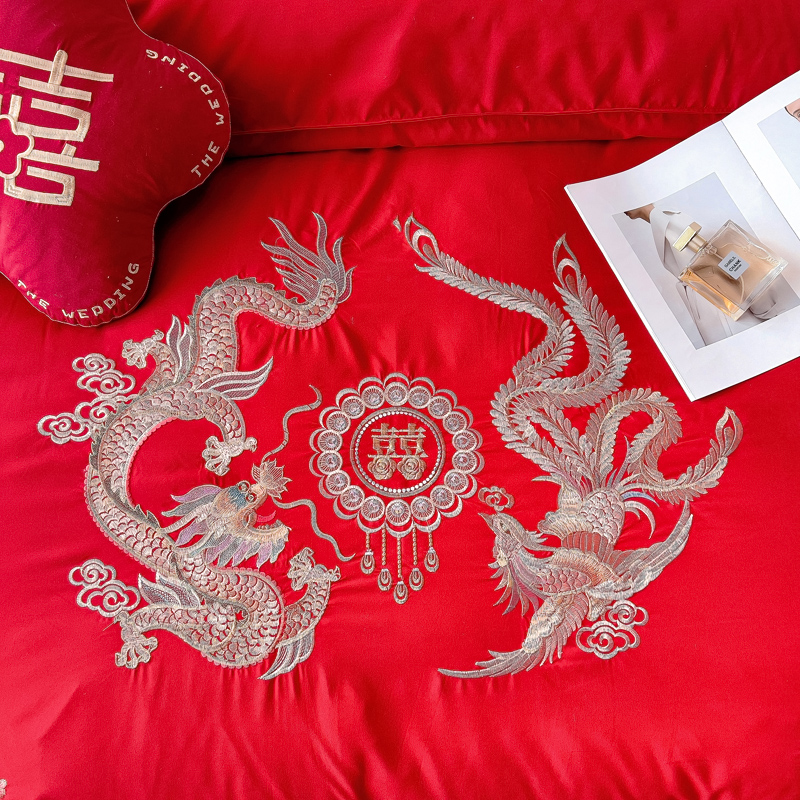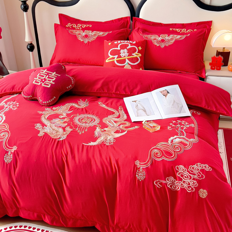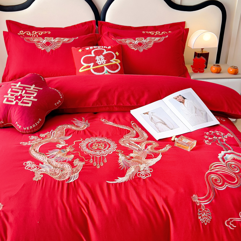 2025新款100支150克双面长绒棉婚庆绣花四件套 龙腾凤跃