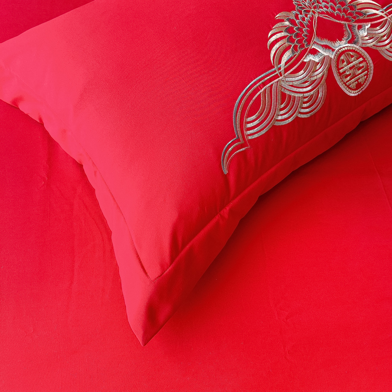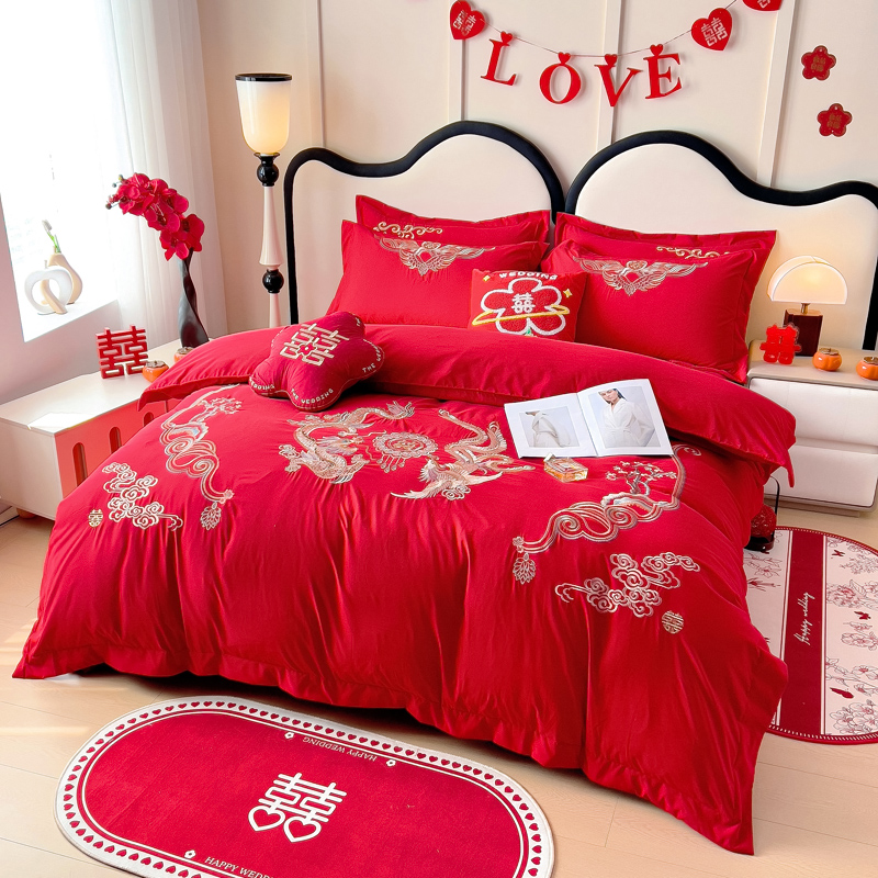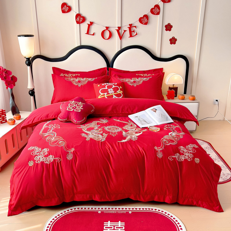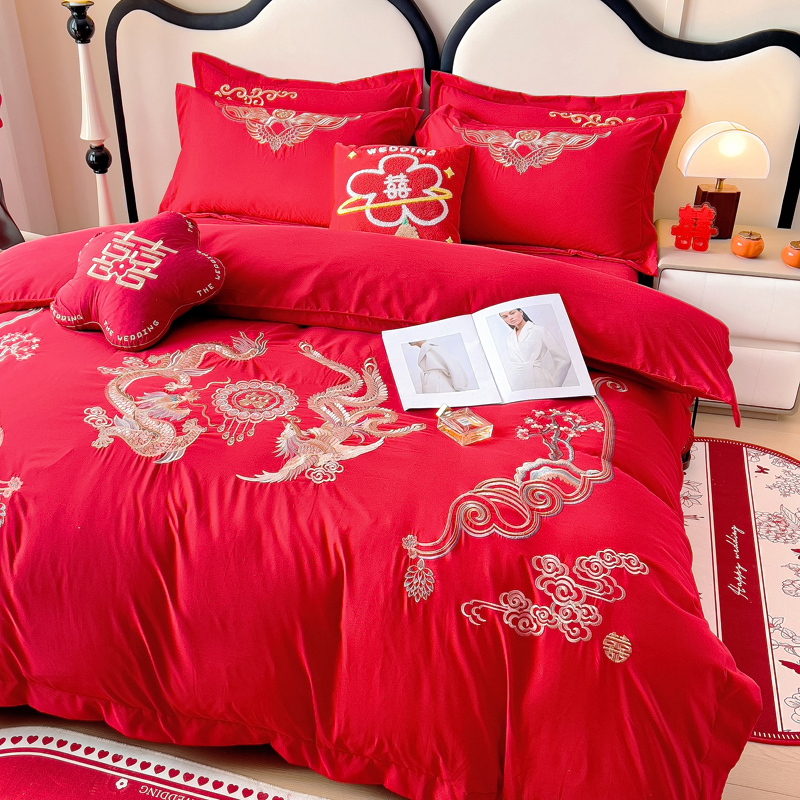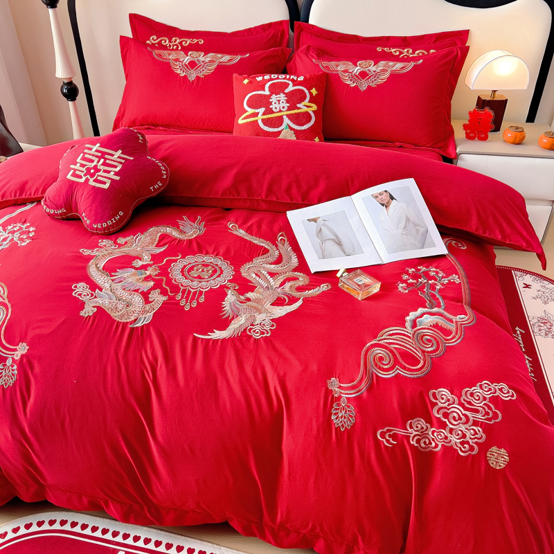2025新款100支150克双面长绒棉婚庆绣花四件套 龙腾凤跃