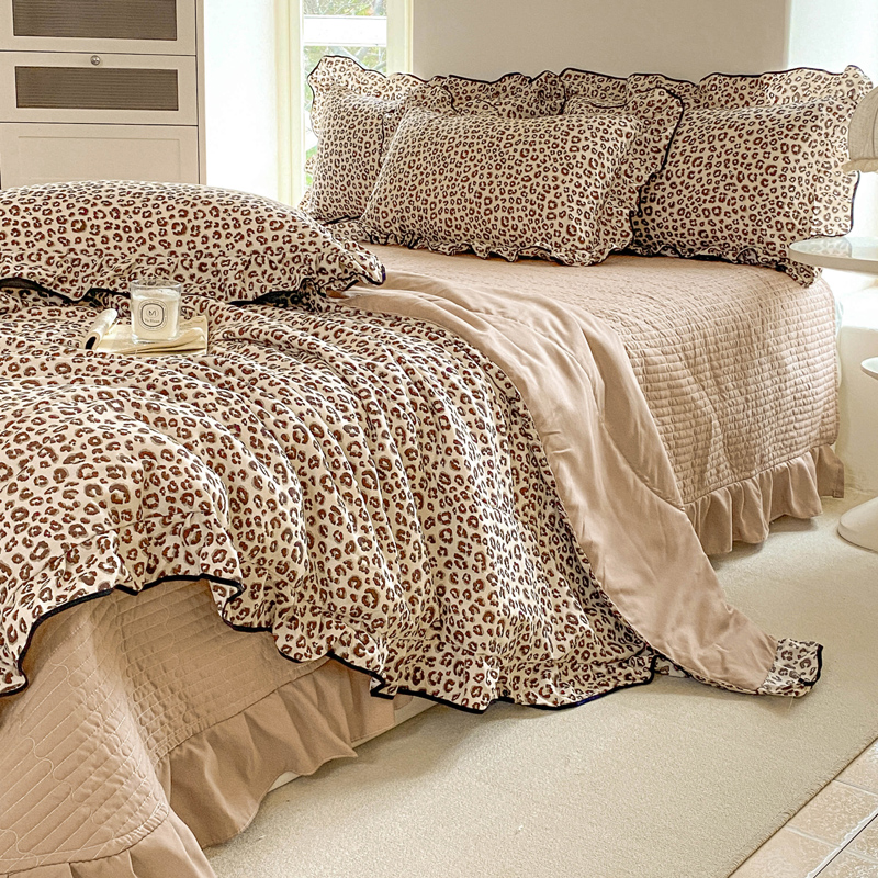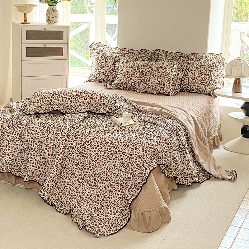 仟网汇 2025新款赫本针织双层纱夏被夏凉被空调被床盖四件套单夏被单床盖单品 奶咖豹纹