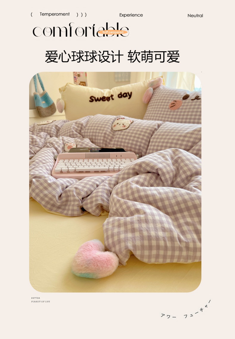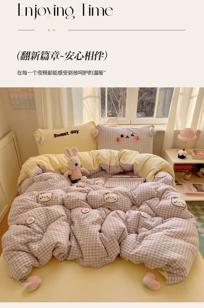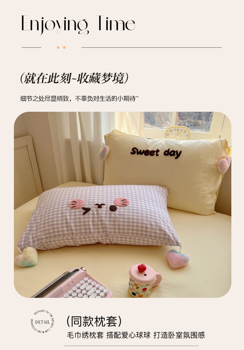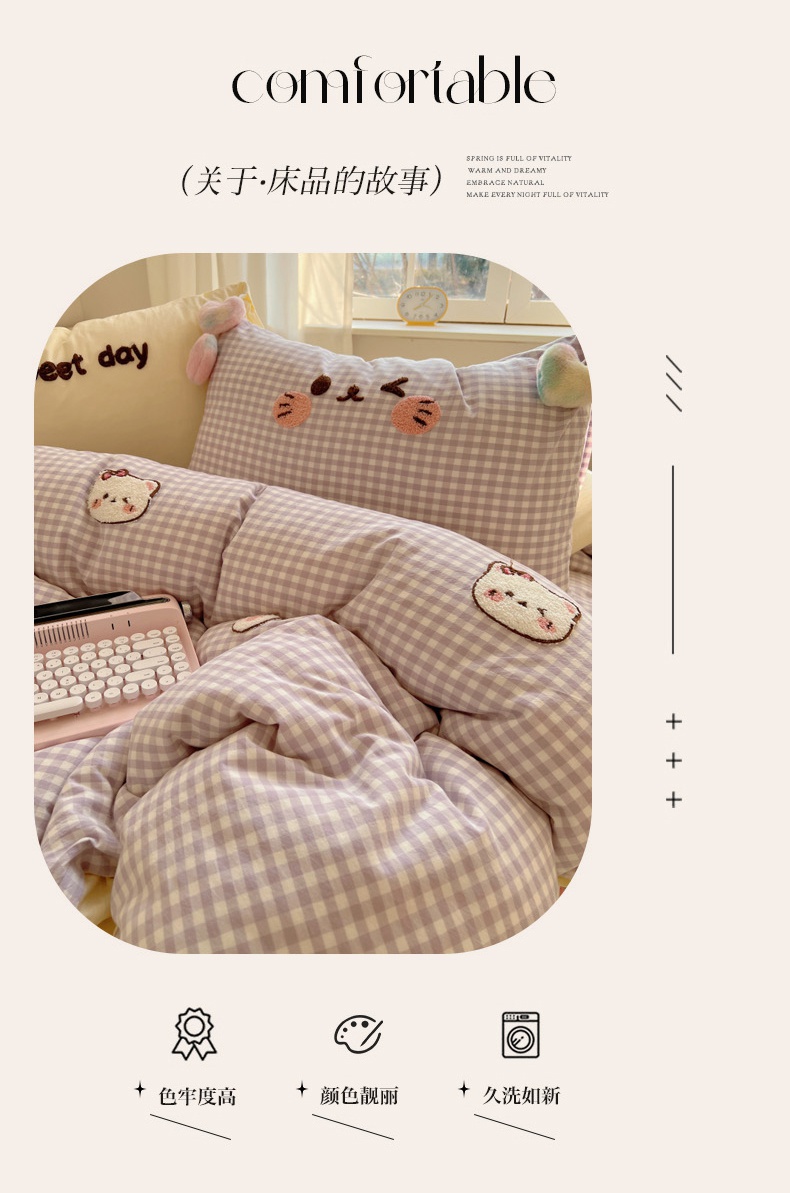 当前位置: 91家纺网 > 商品网购 > 床品套件 > 四件套 > 全棉普通四件套 > 丽涵家纺 2025新款色织水洗棉毛巾绣四件套-甜心小猫系列 甜心小猫-紫格-毛球款