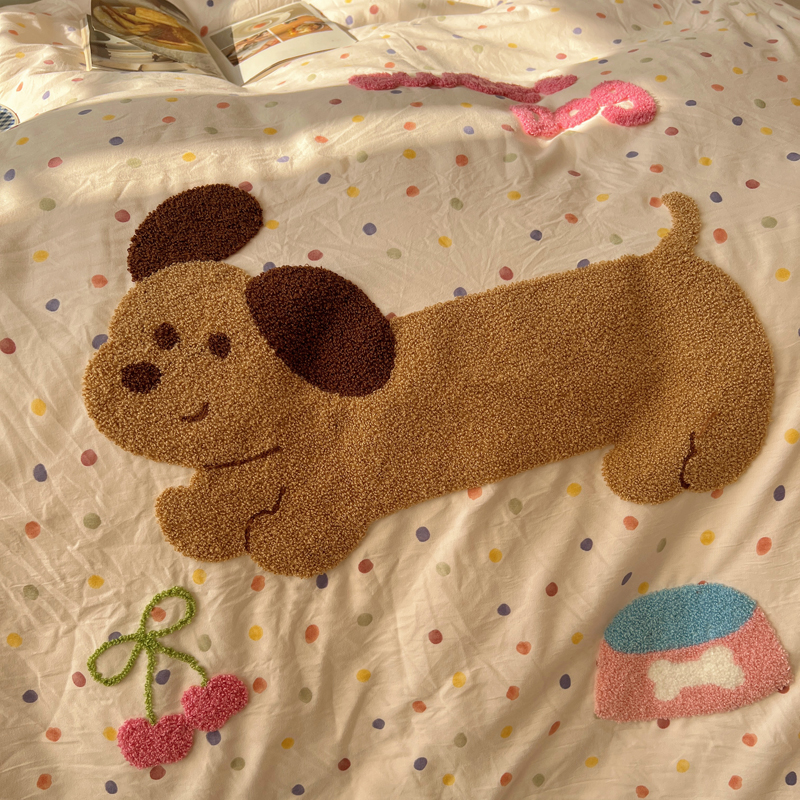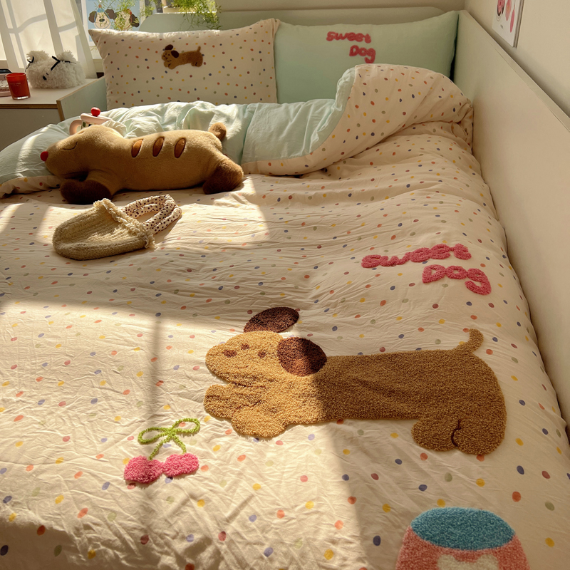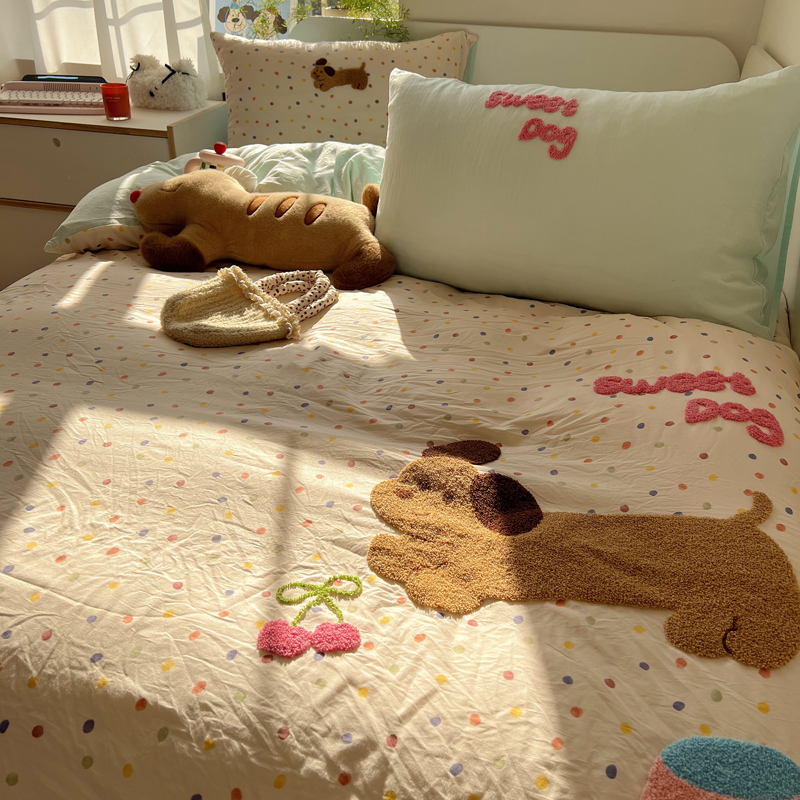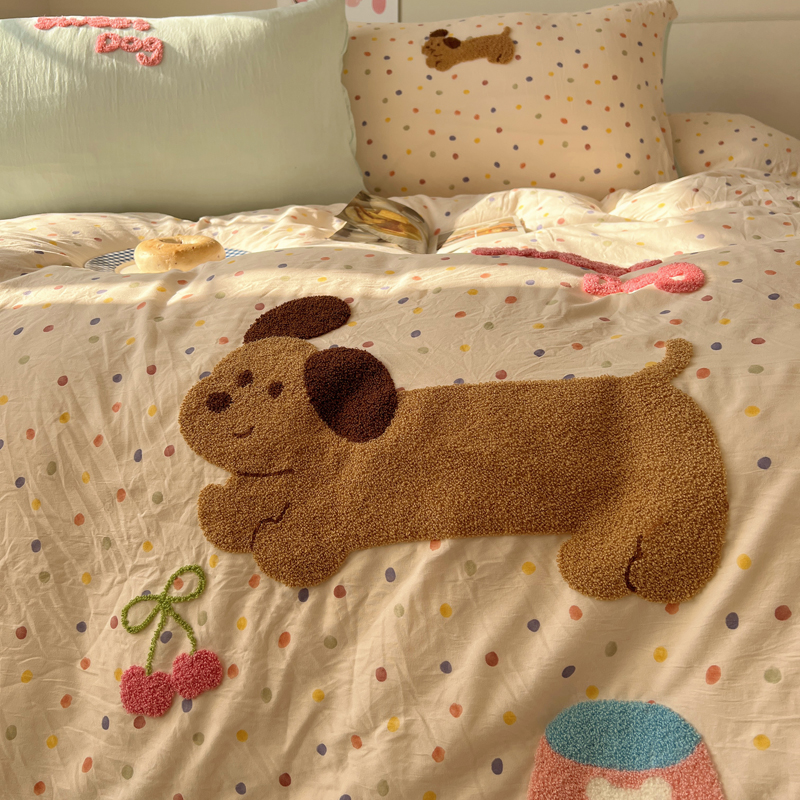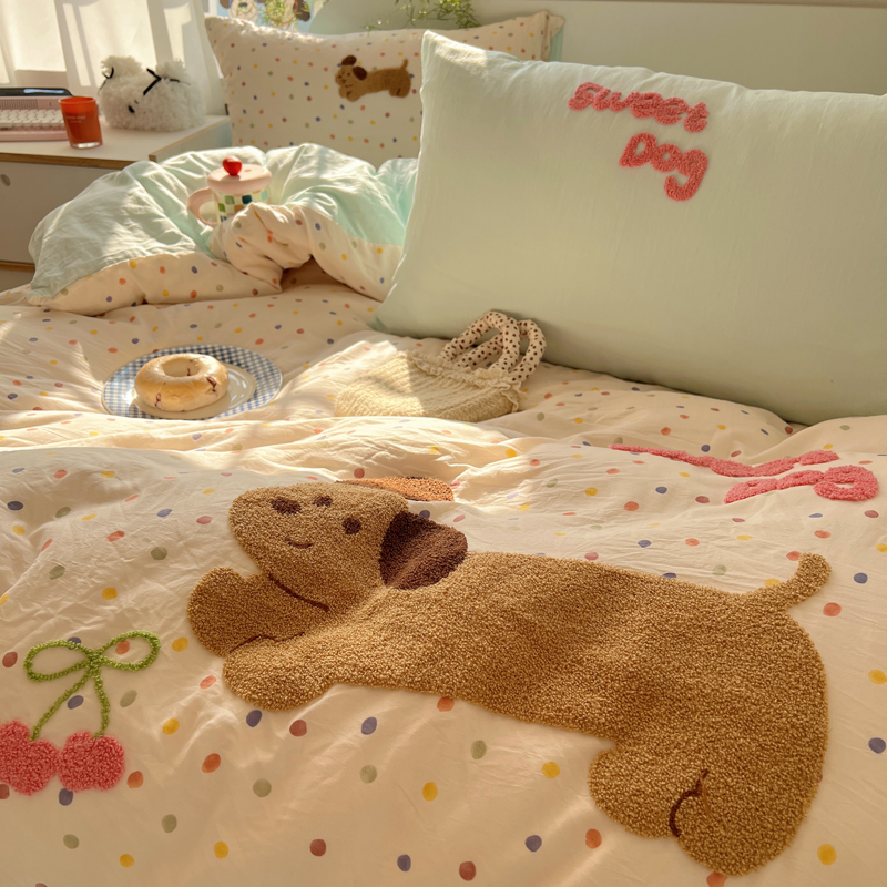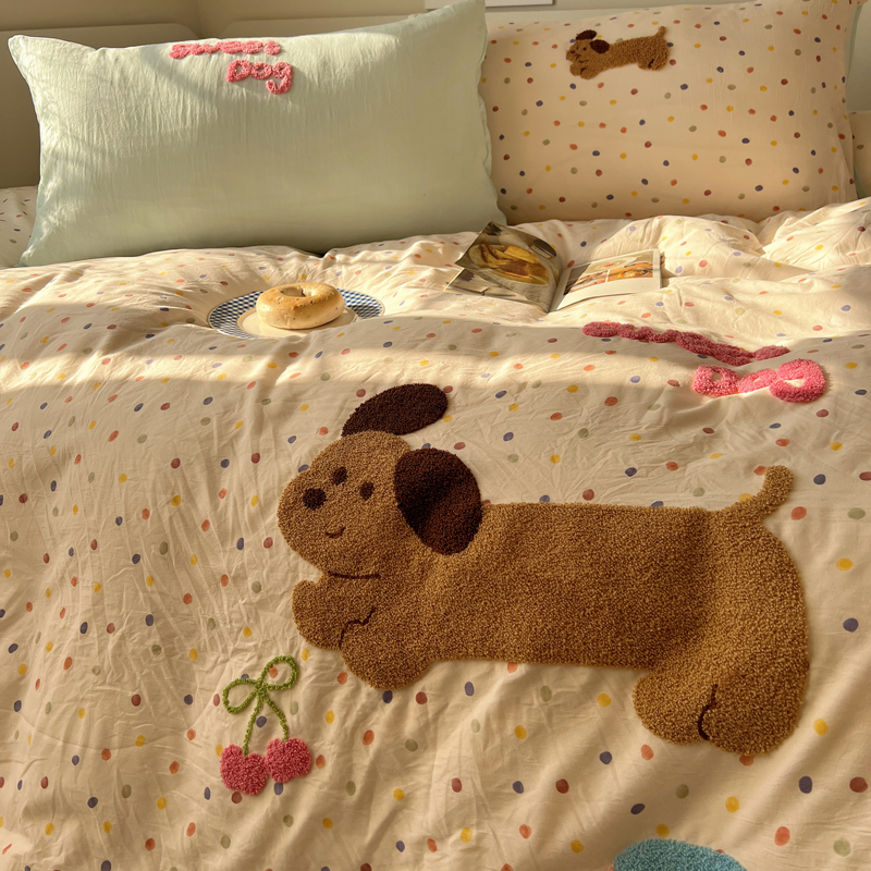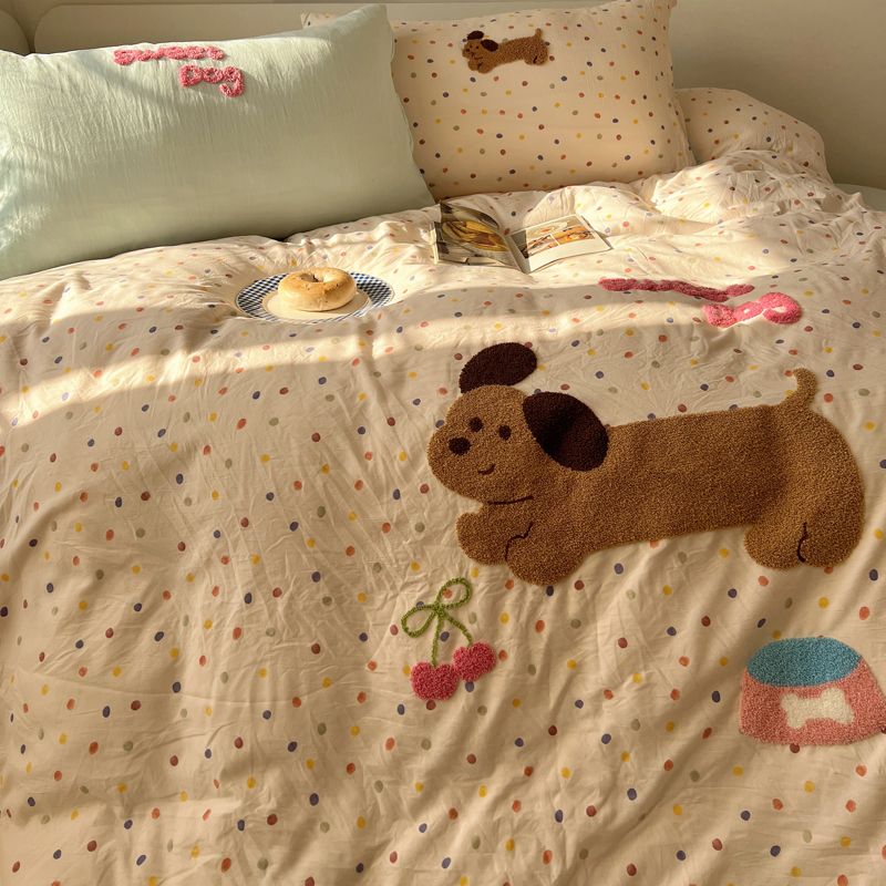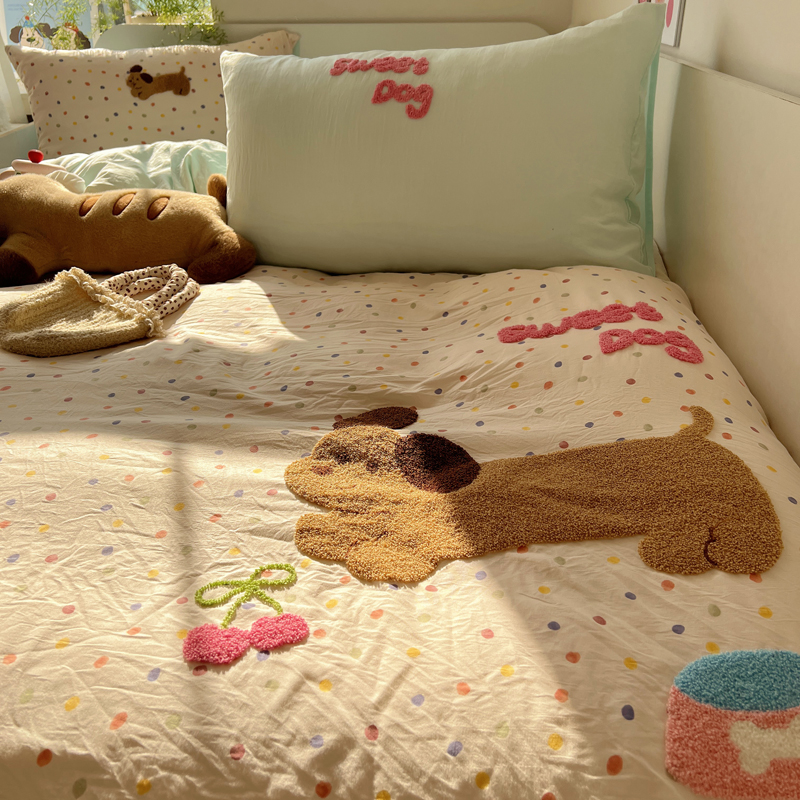 商品名称:顾里家纺 2025新款ins韩系童趣毛巾绣云朵棉四件套 彩色腊肠狗