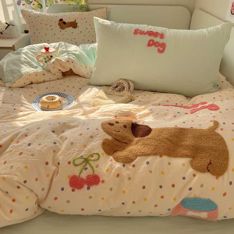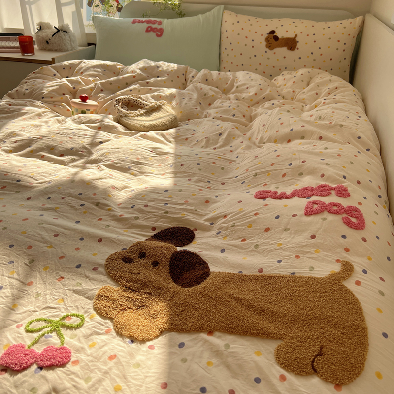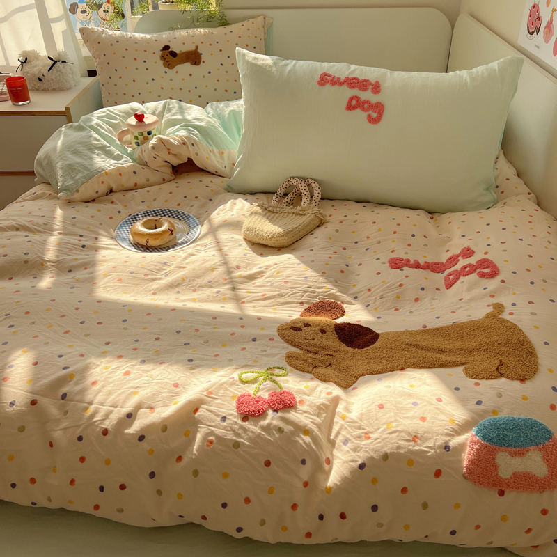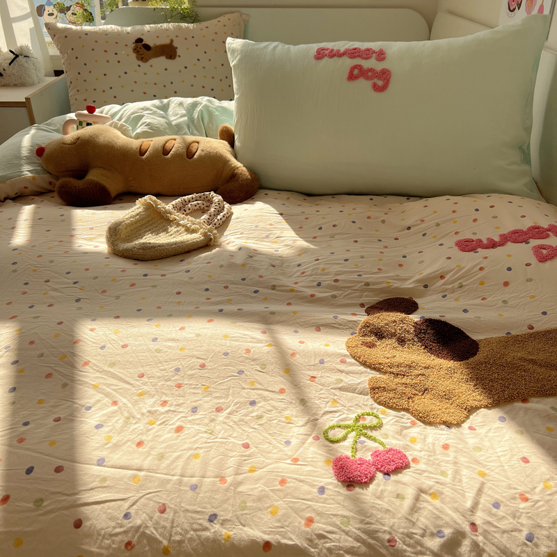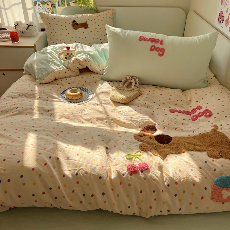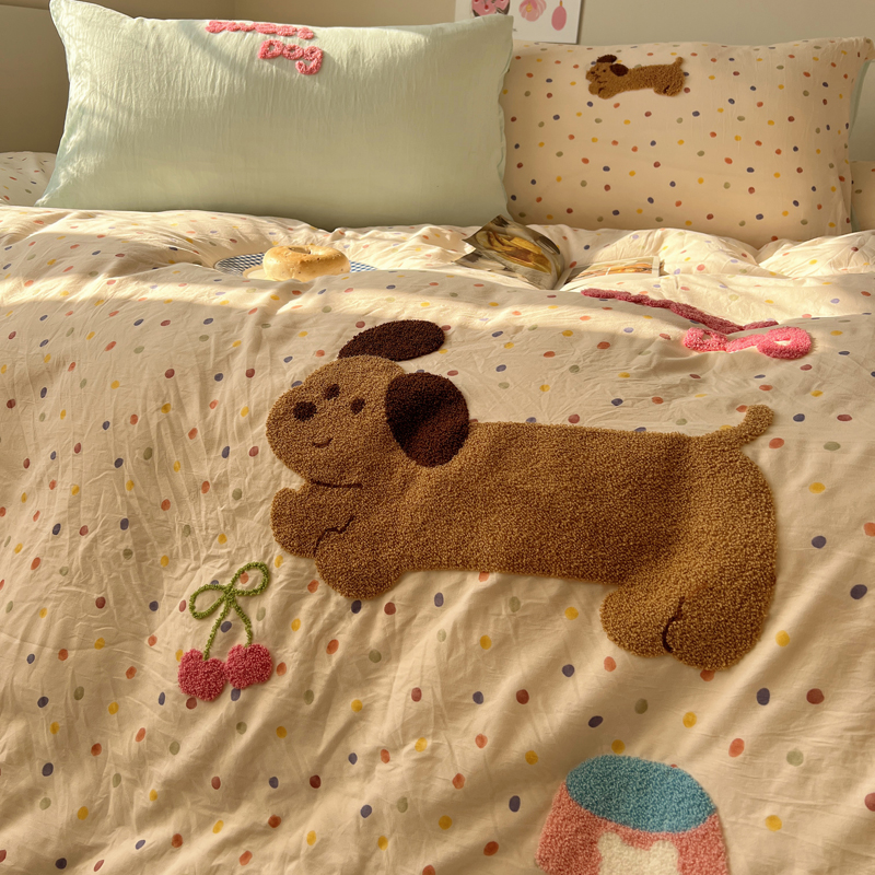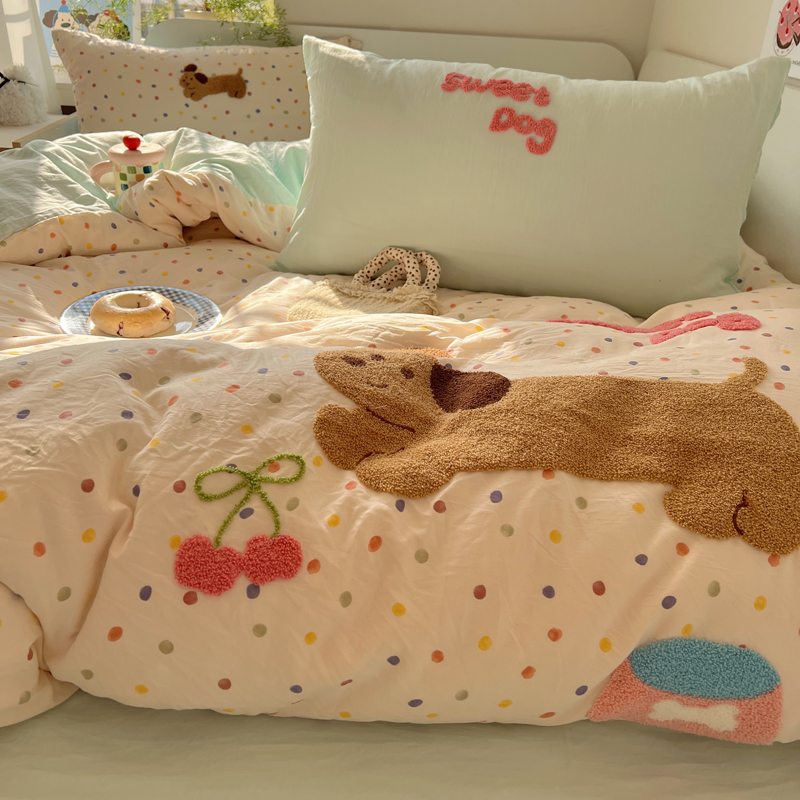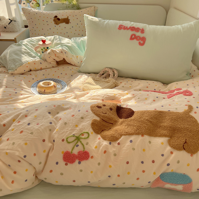 商品名称:顾里家纺 2025新款ins韩系童趣毛巾绣云朵棉四件套 彩色腊肠狗
