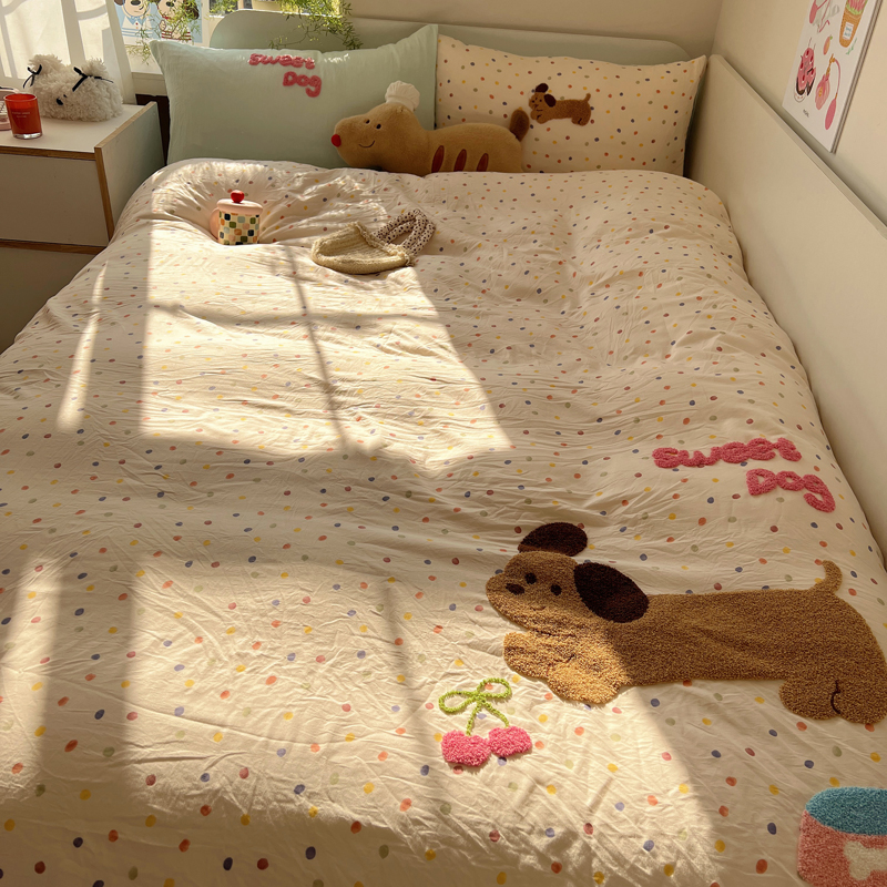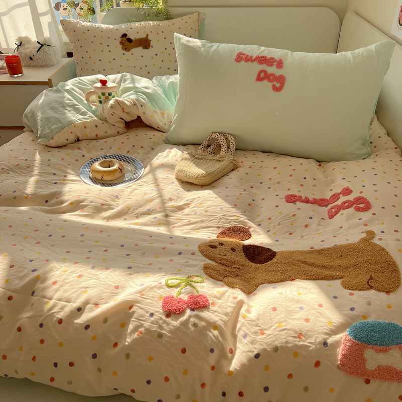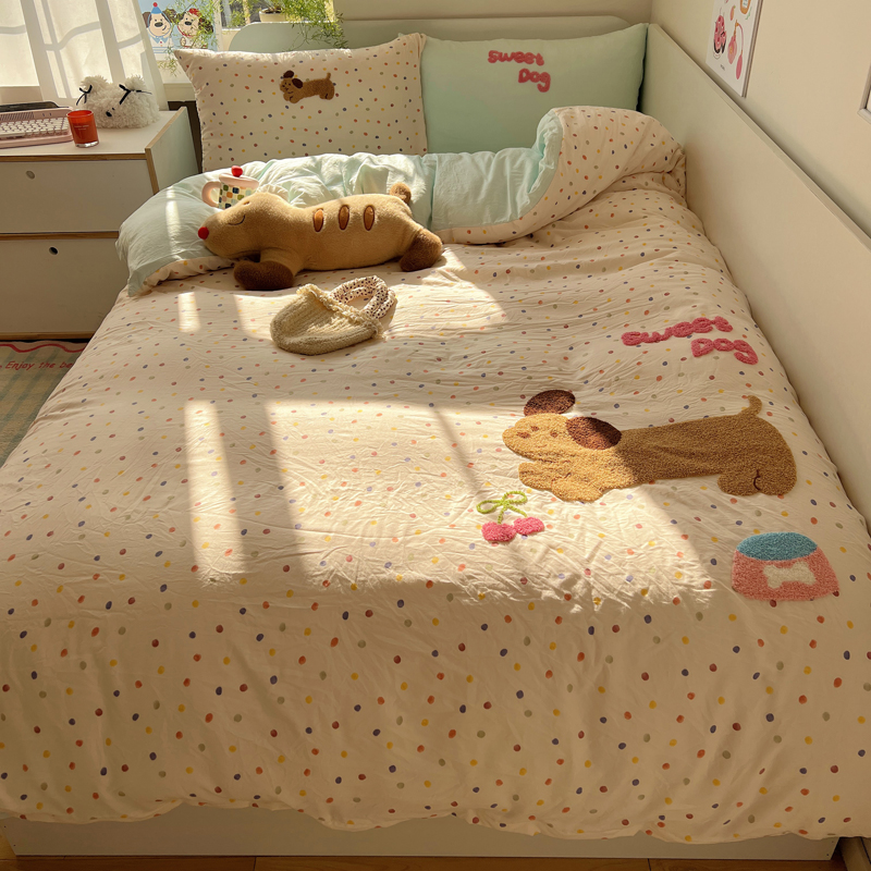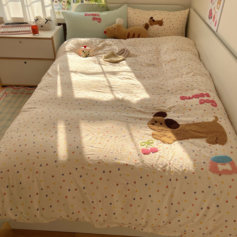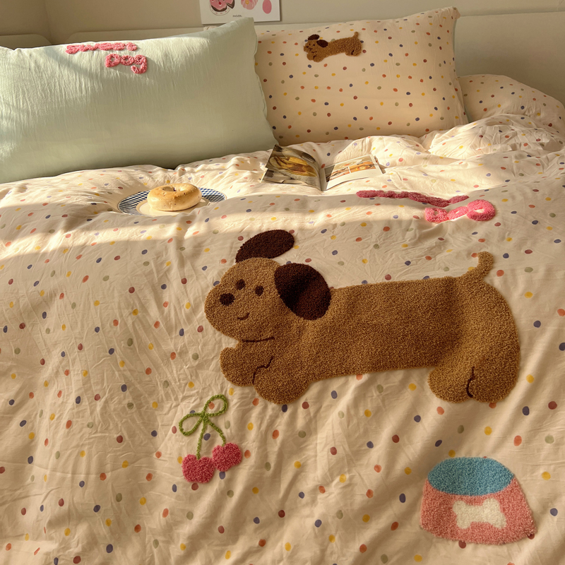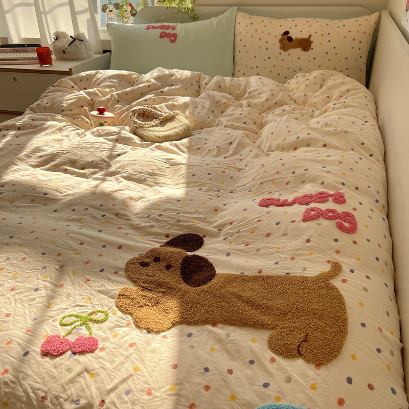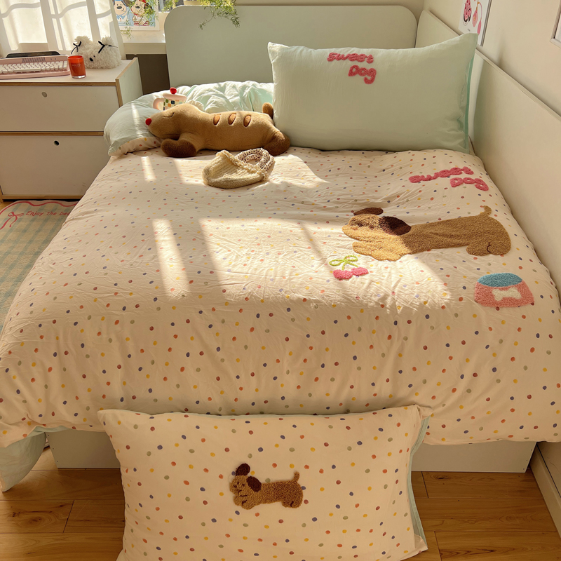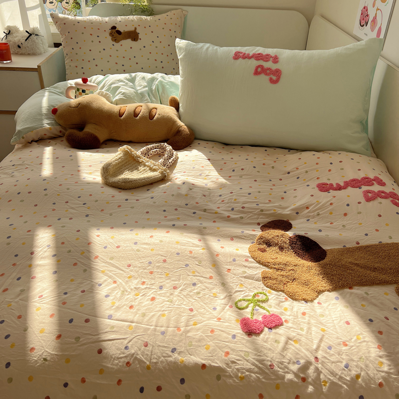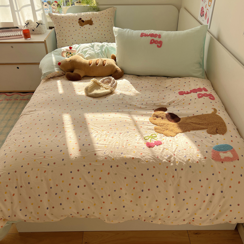 商品名称:顾里家纺 2025新款ins韩系童趣毛巾绣云朵棉四件套 彩色腊肠狗