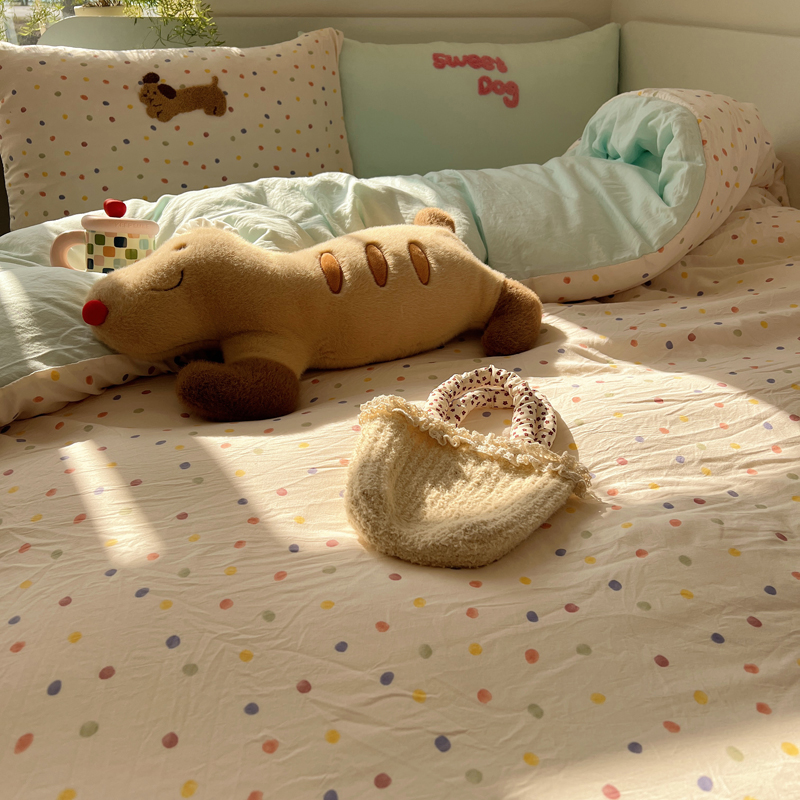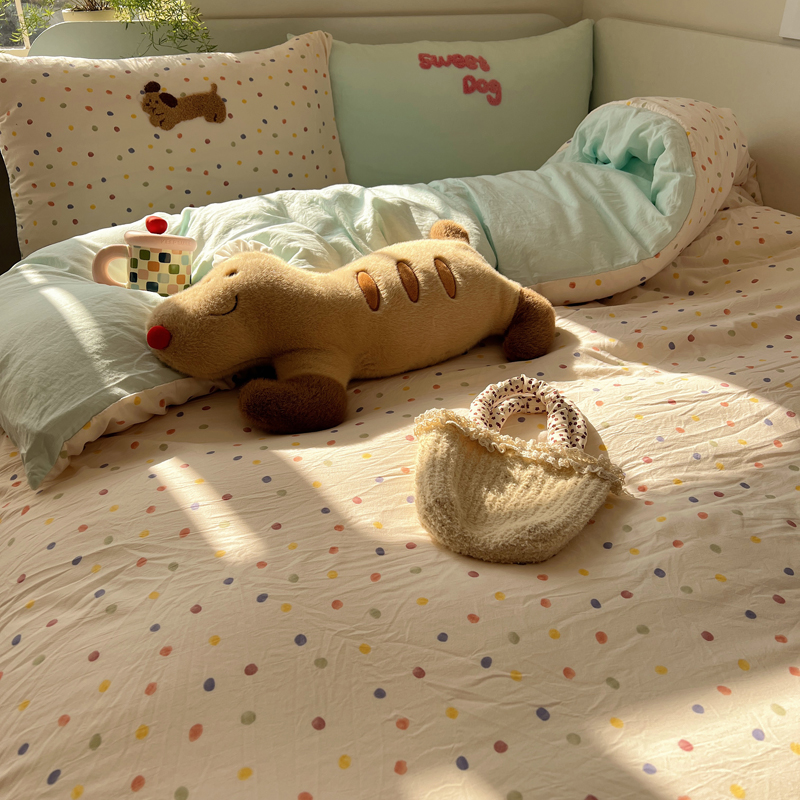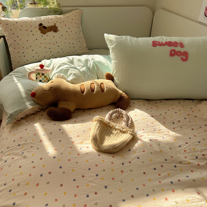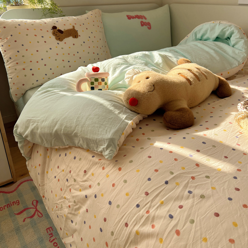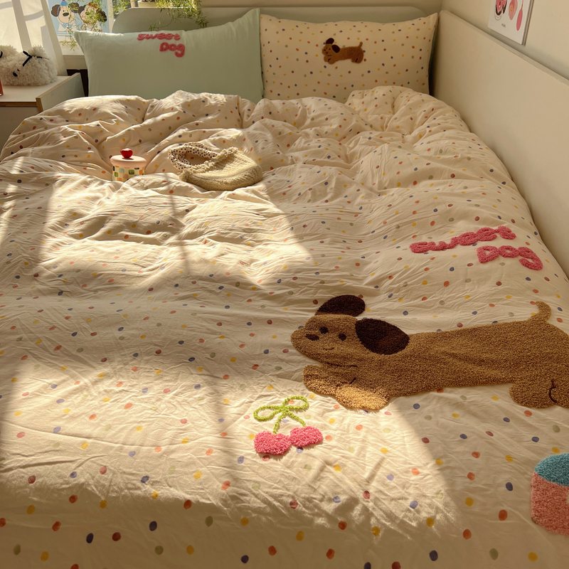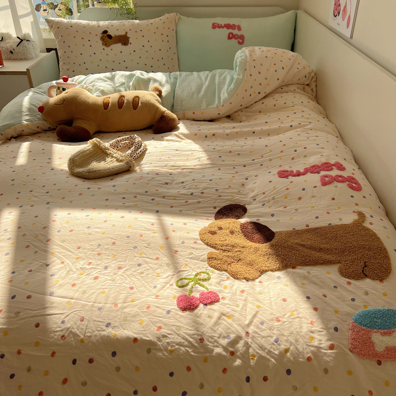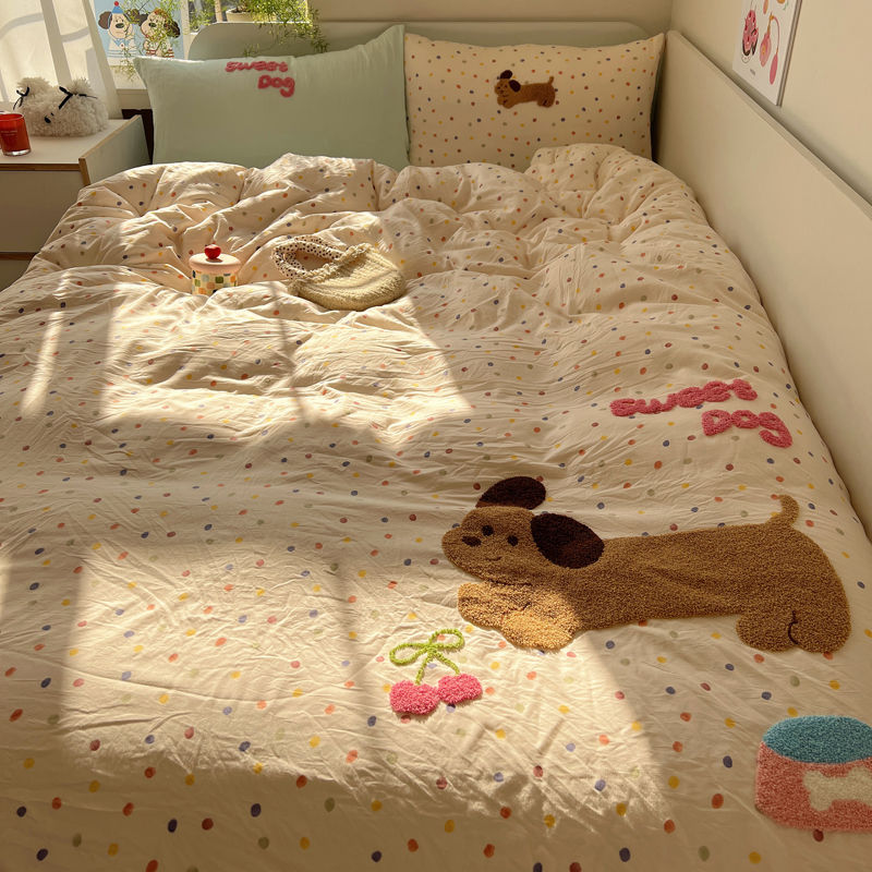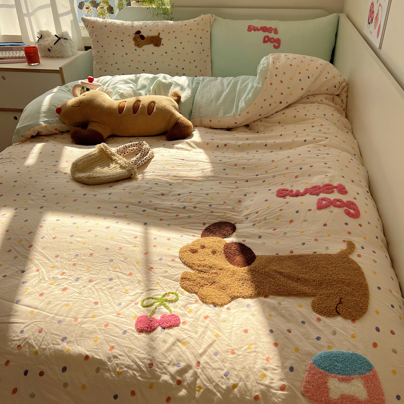 商品名称:顾里家纺 2025新款ins韩系童趣毛巾绣云朵棉四件套 彩色腊肠狗