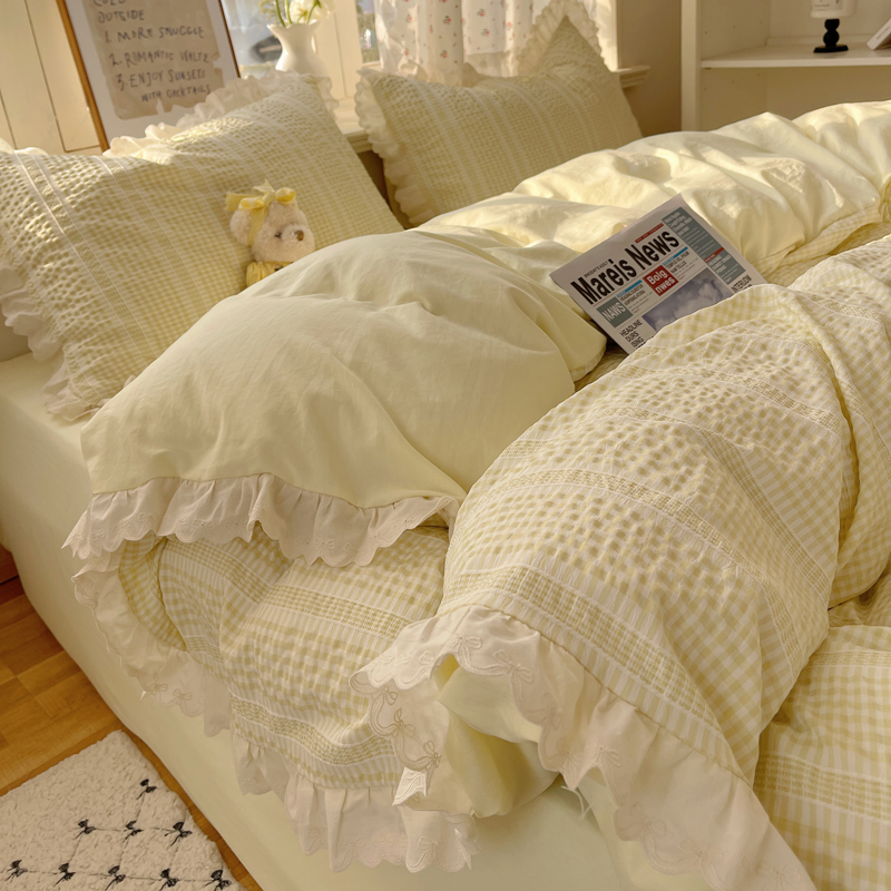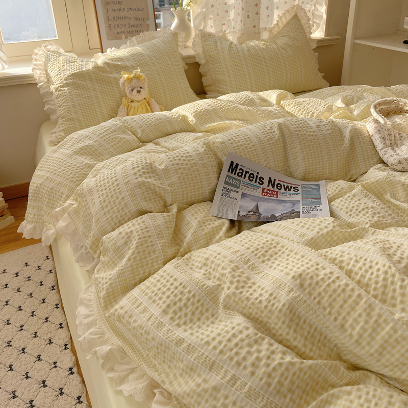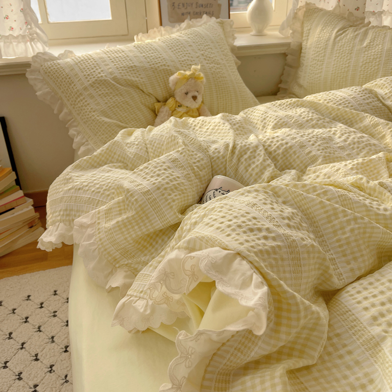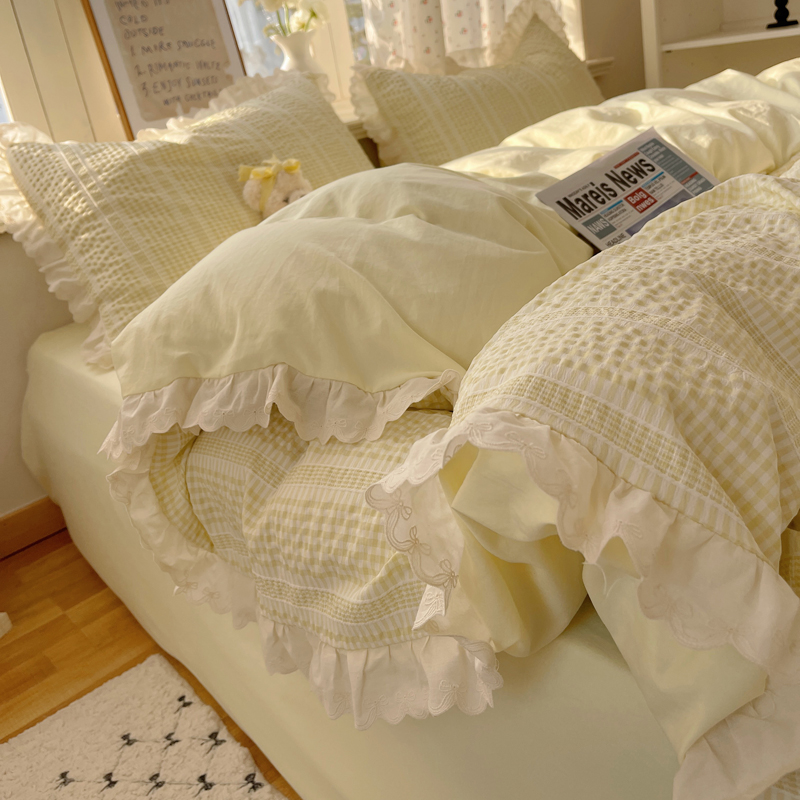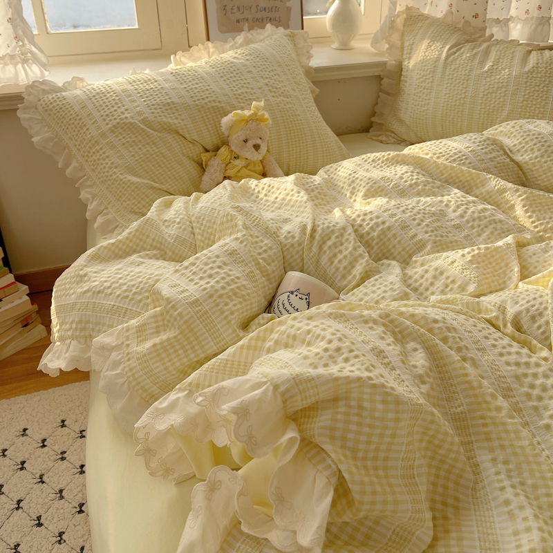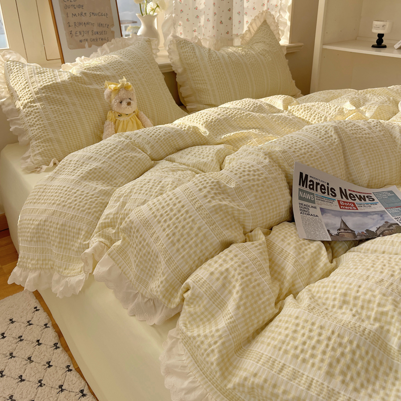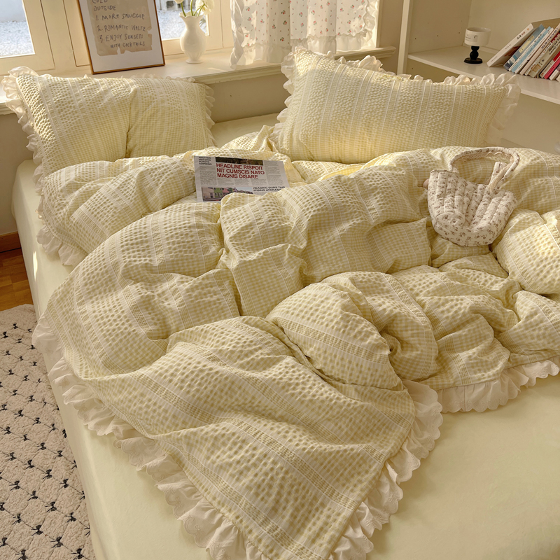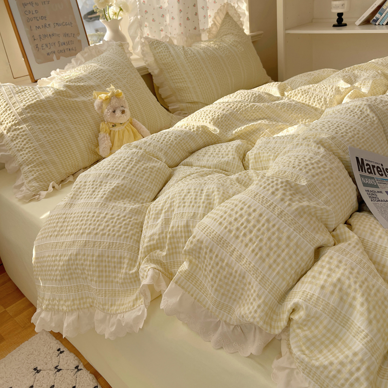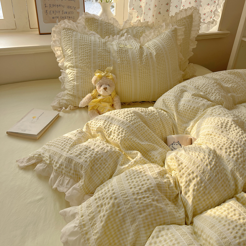 轻奢坊 2025新款色织提花格子水洗棉仙仙花边安妮四件套 花边安妮-黄