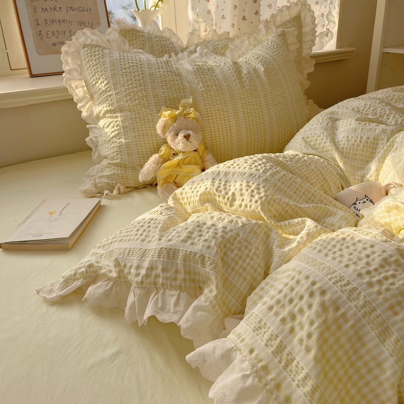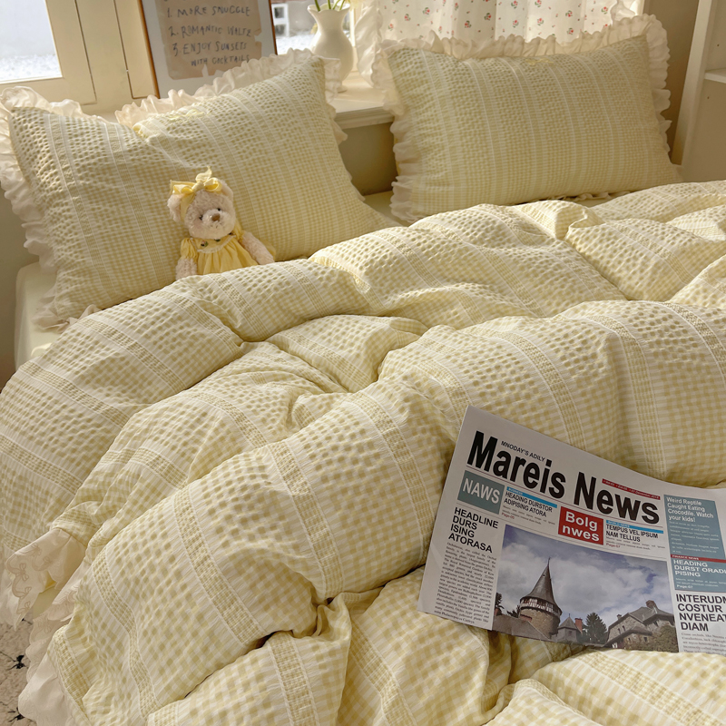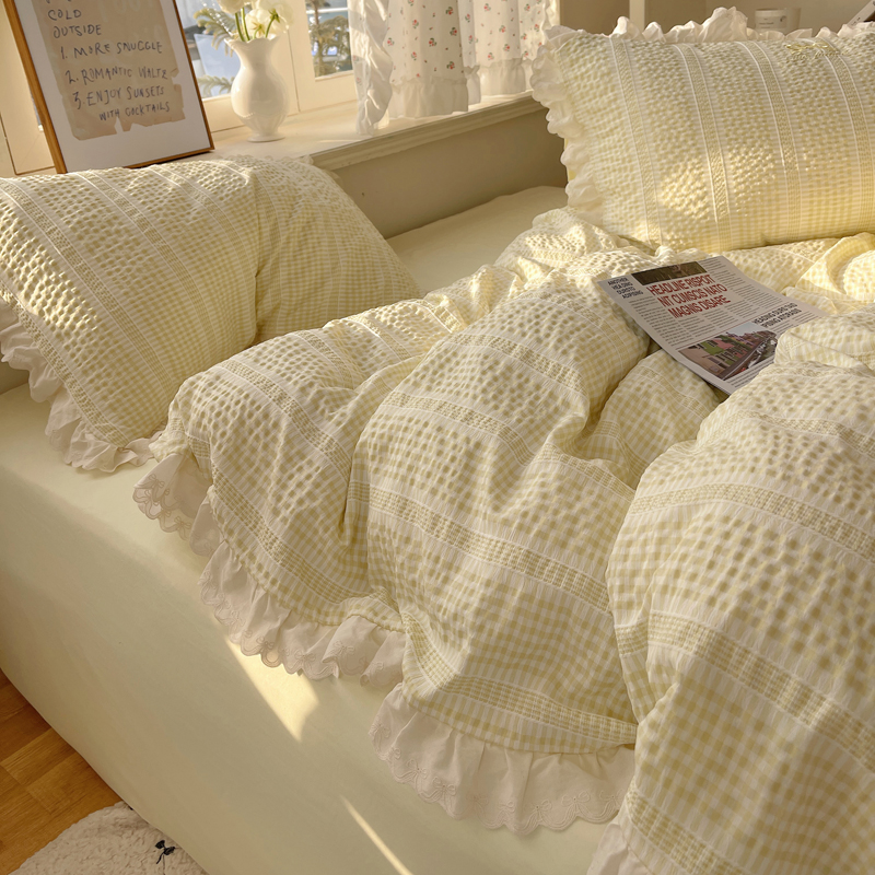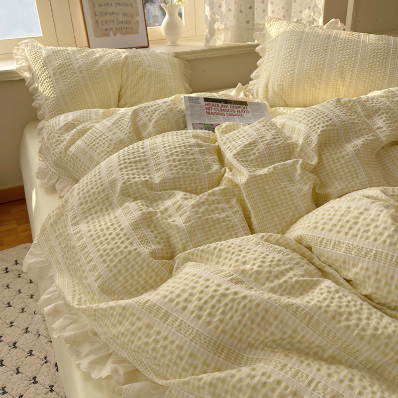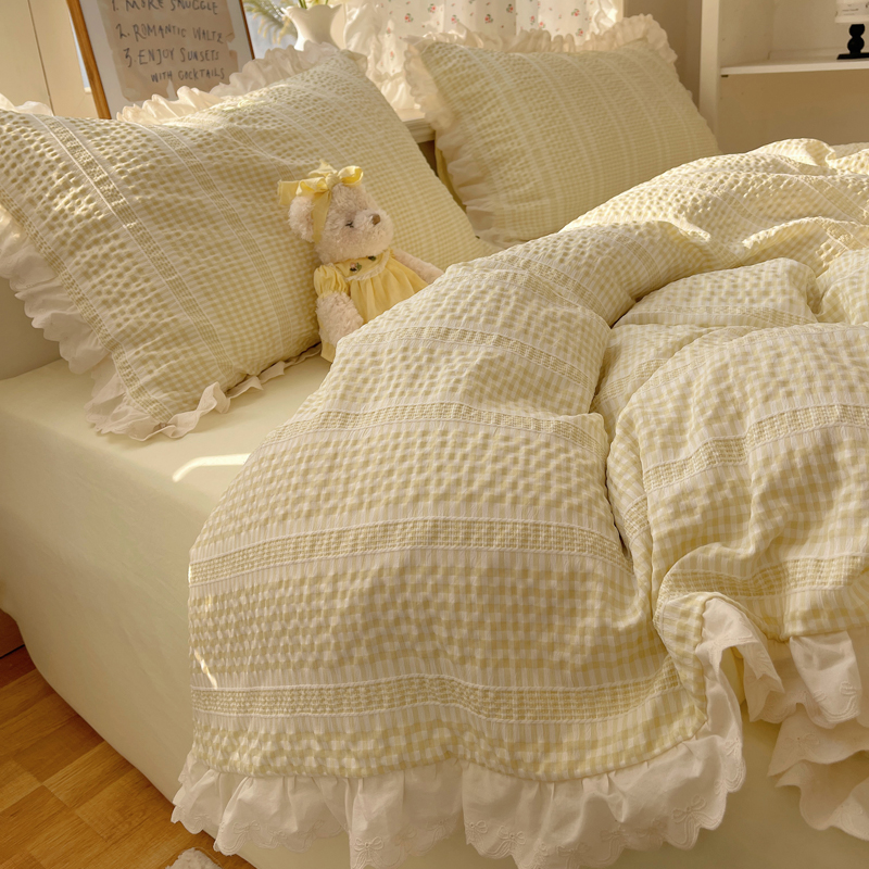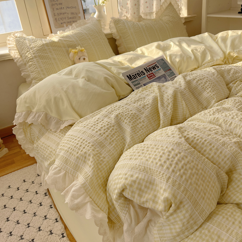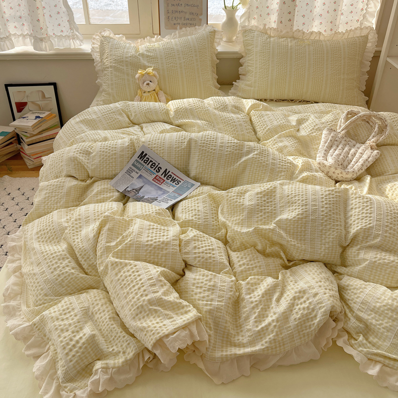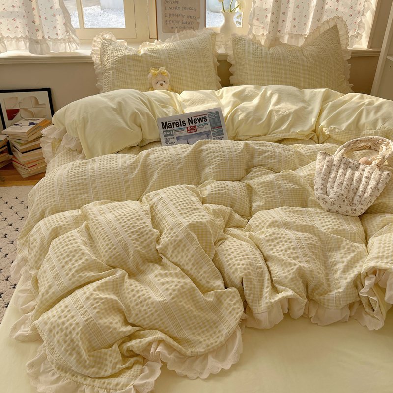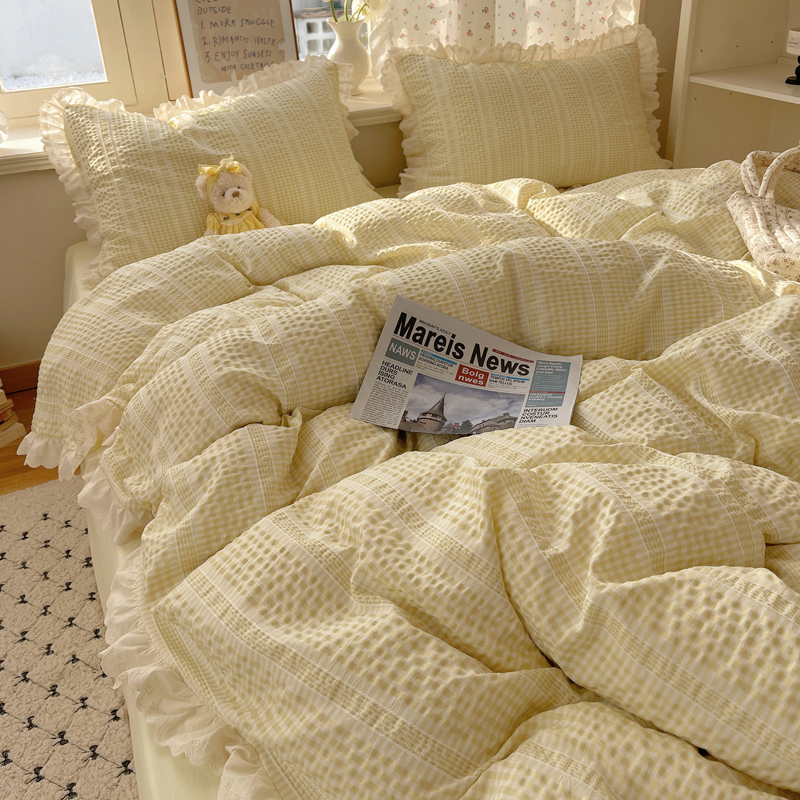 轻奢坊 2025新款色织提花格子水洗棉仙仙花边安妮四件套 花边安妮-黄