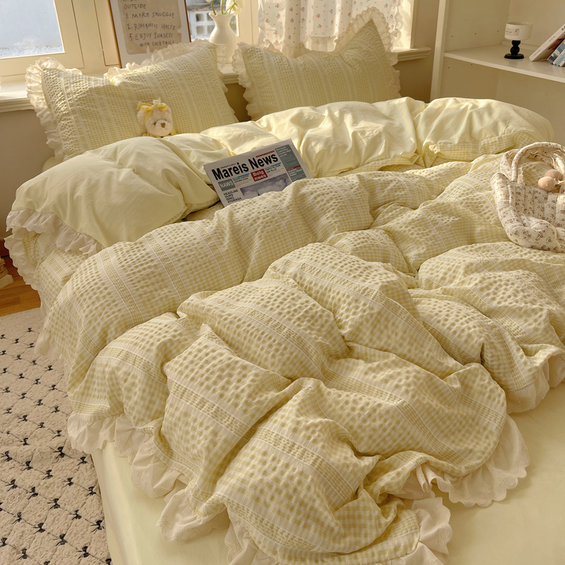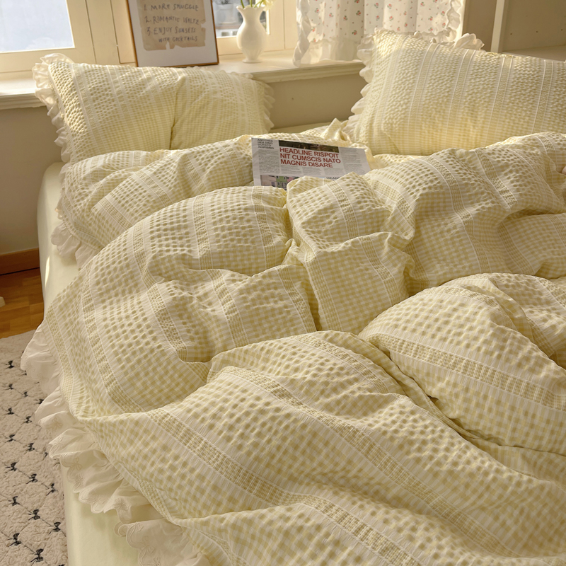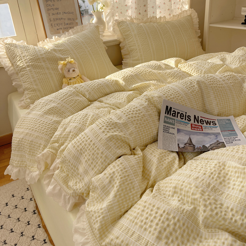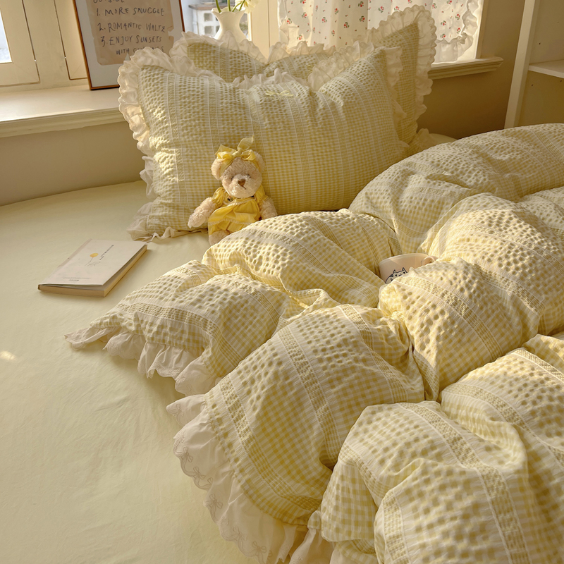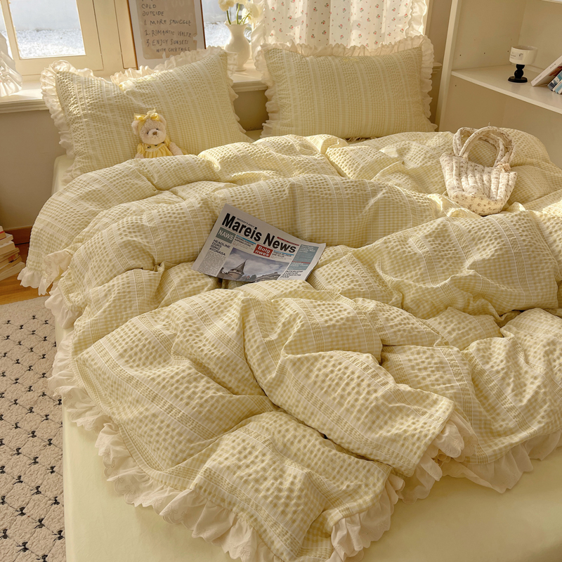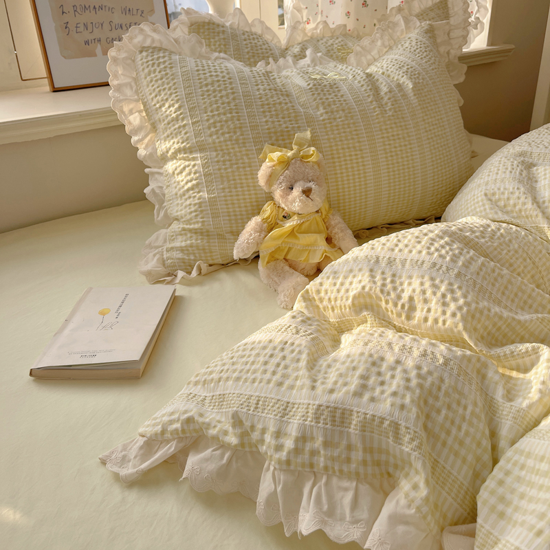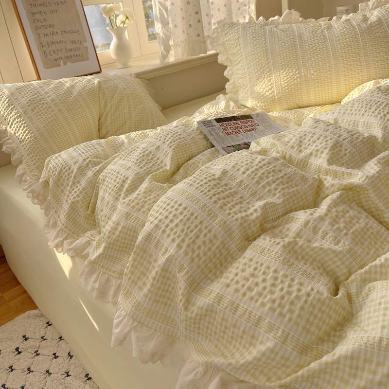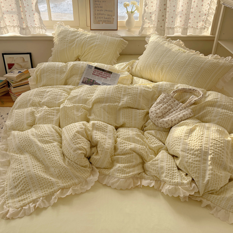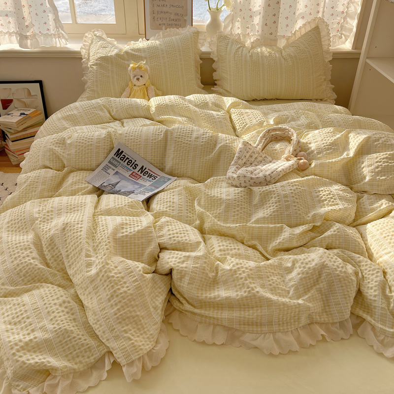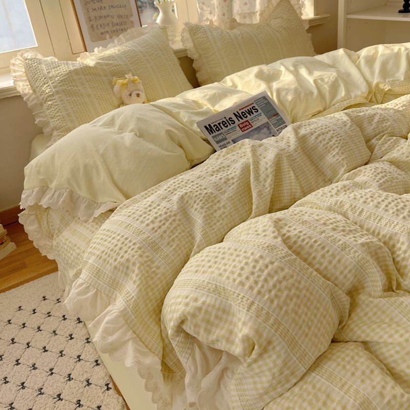 轻奢坊 2025新款色织提花格子水洗棉仙仙花边安妮四件套 花边安妮-黄