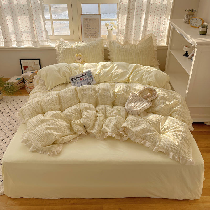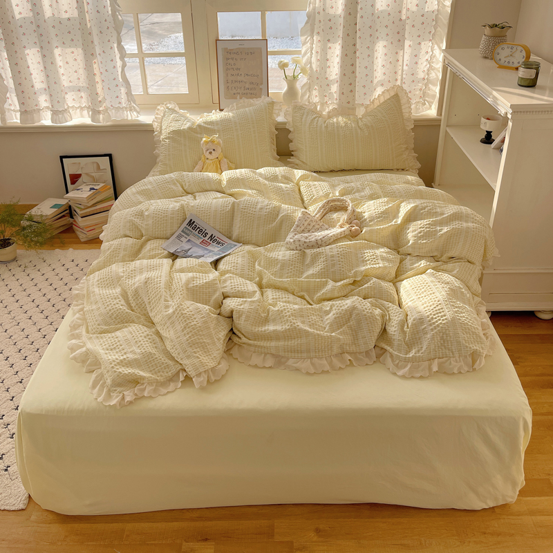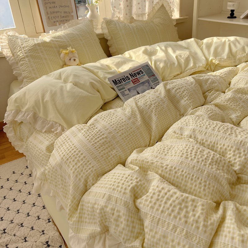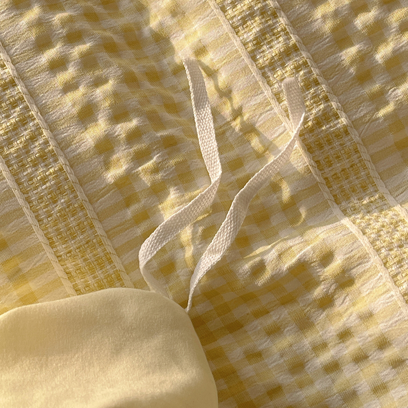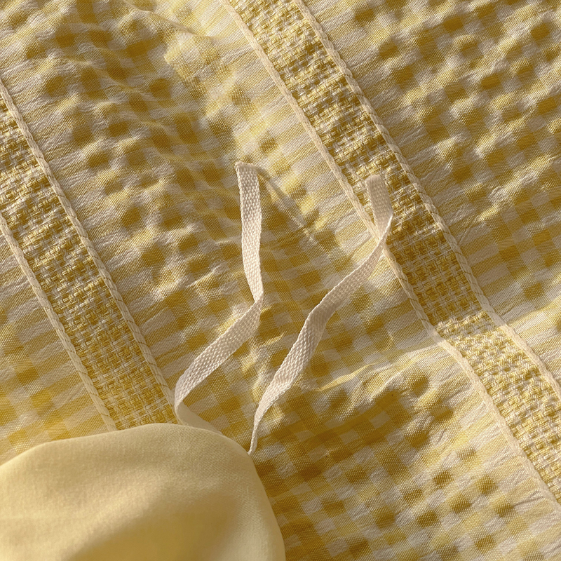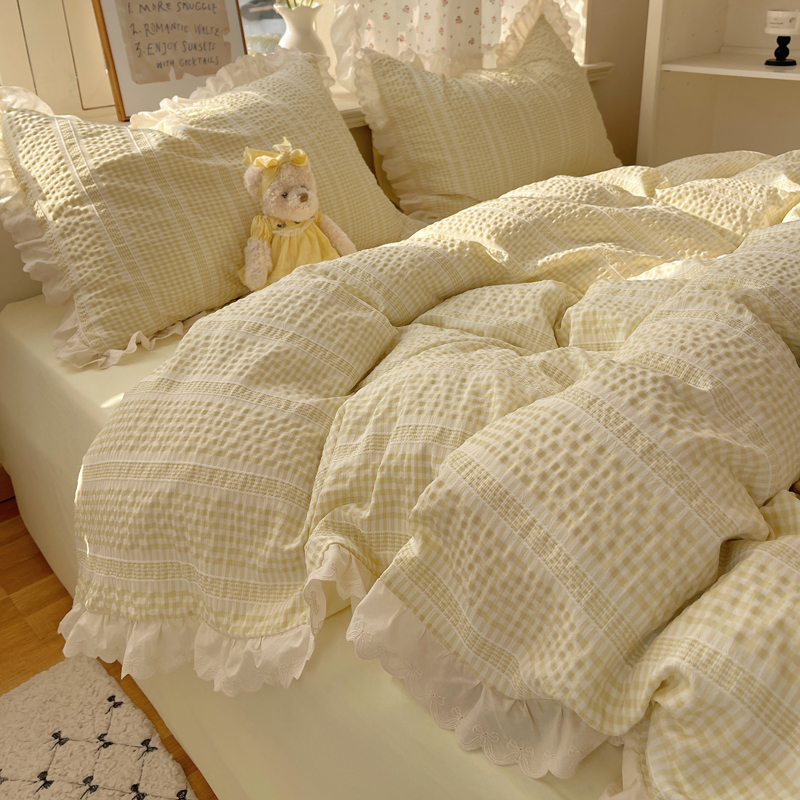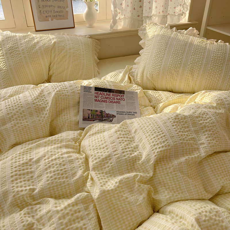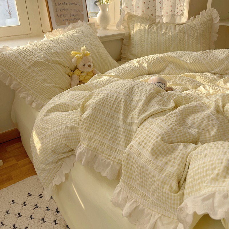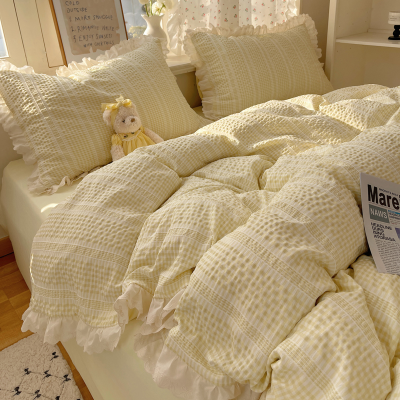 轻奢坊 2025新款色织提花格子水洗棉仙仙花边安妮四件套 花边安妮-黄