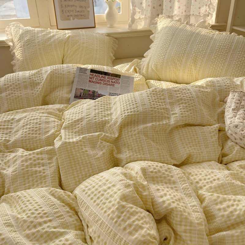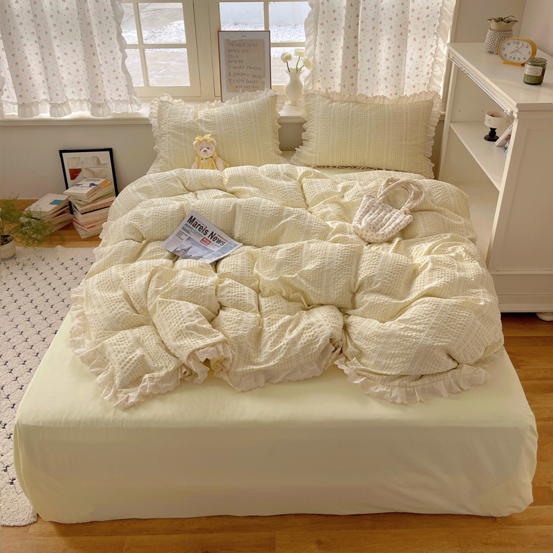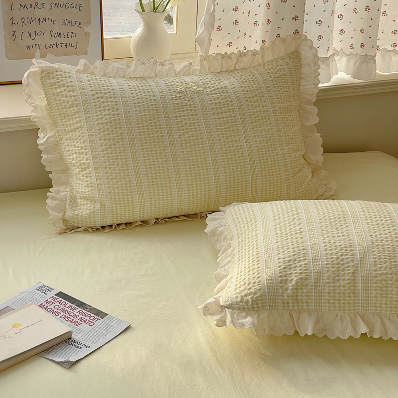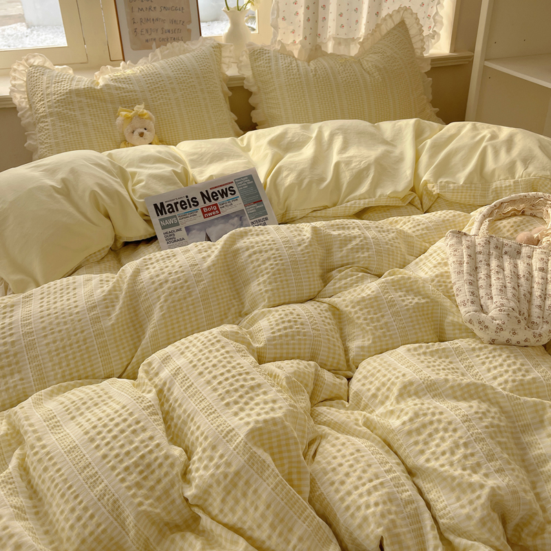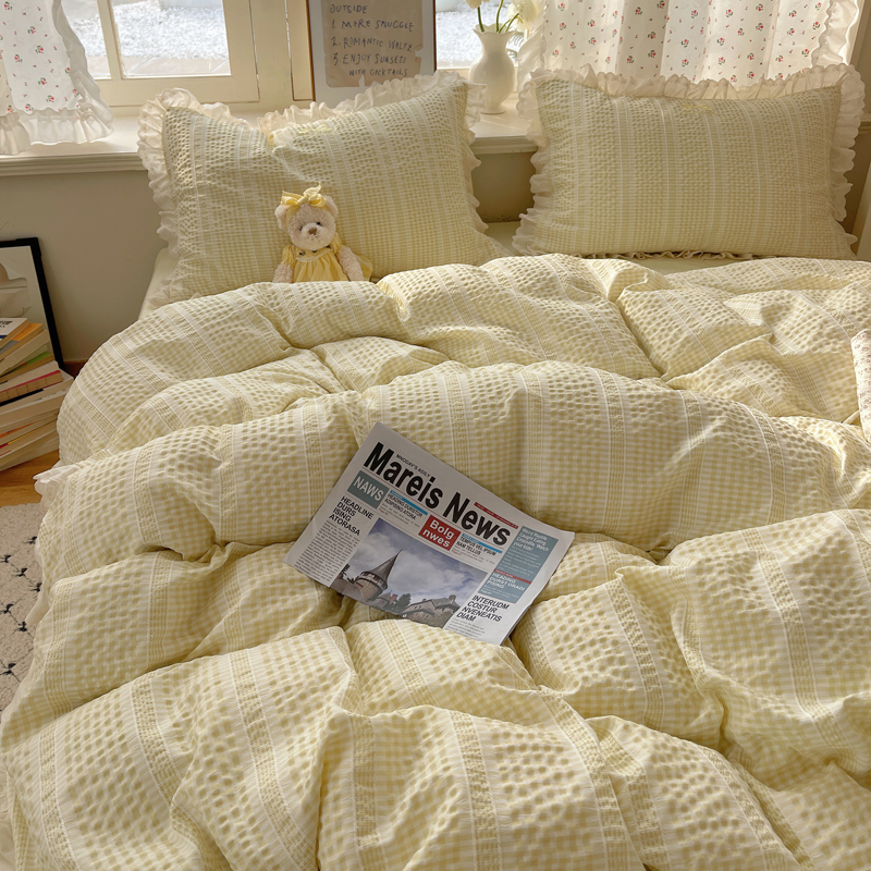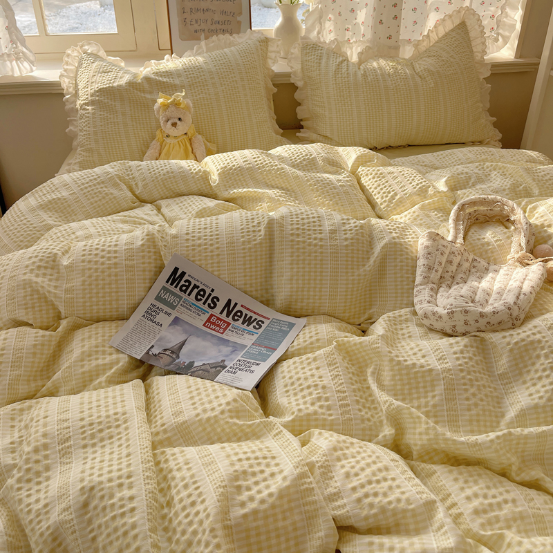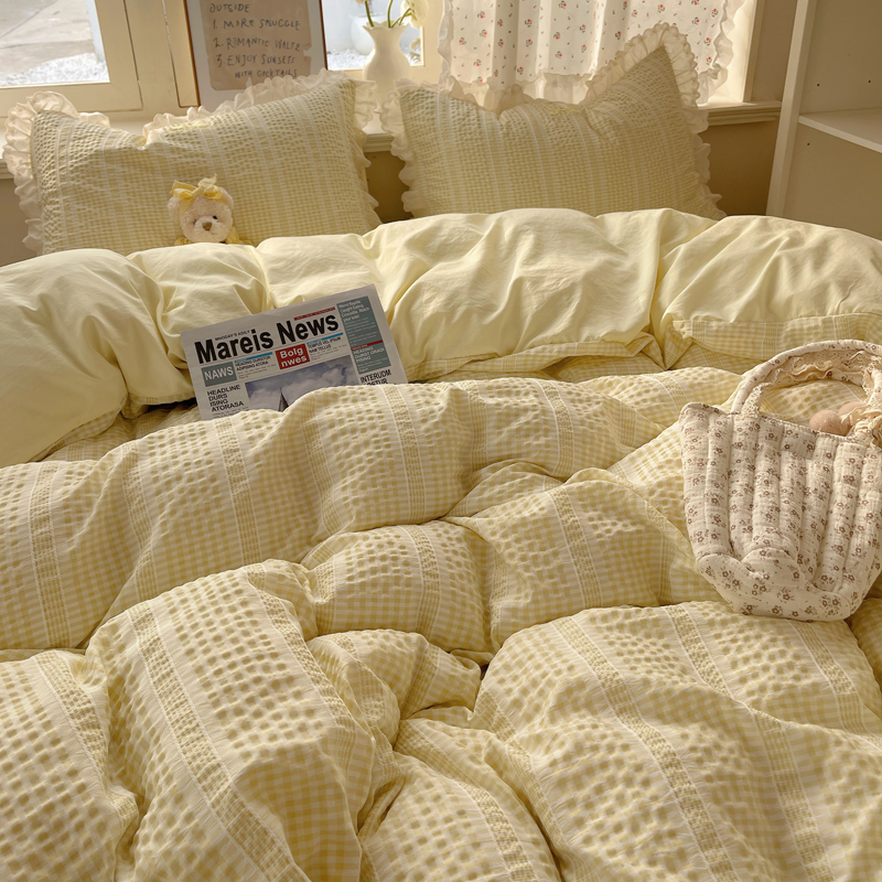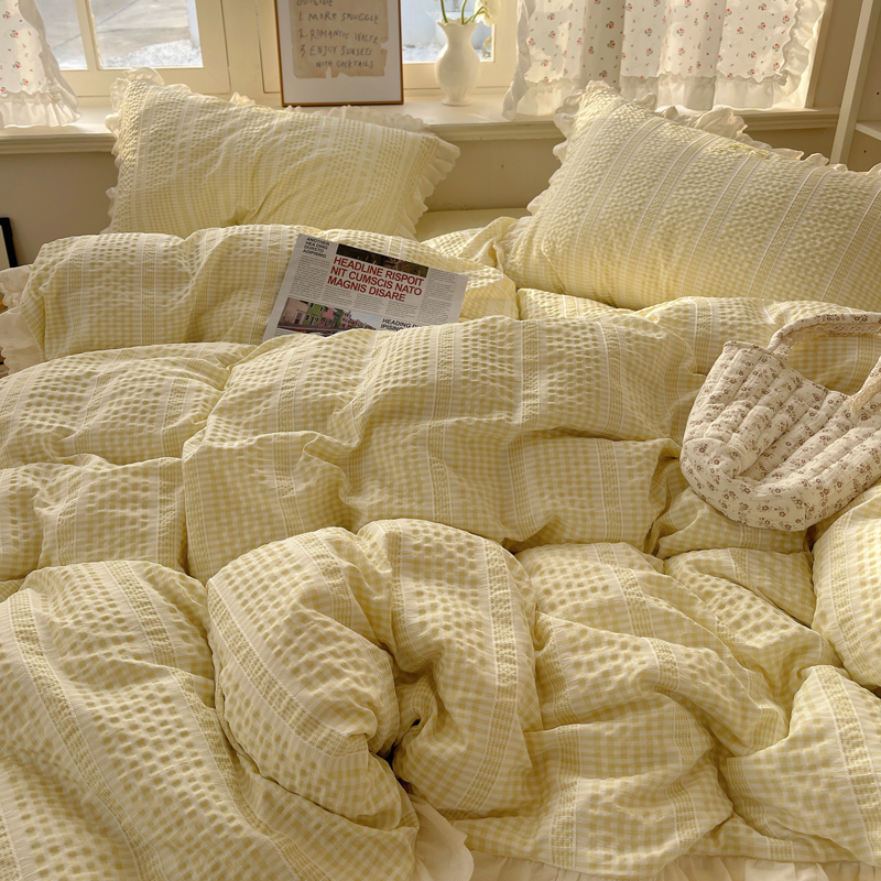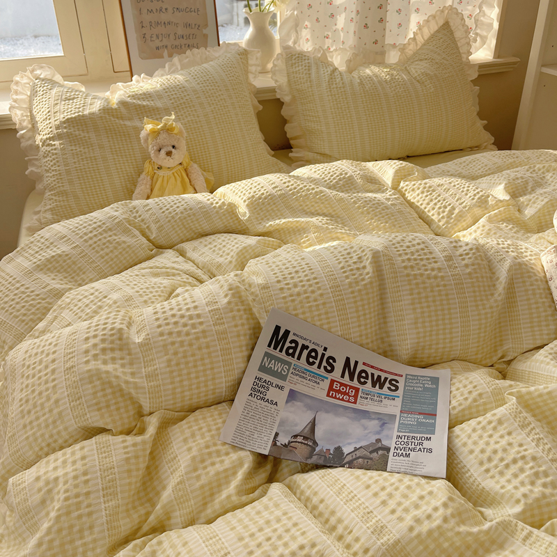 轻奢坊 2025新款色织提花格子水洗棉仙仙花边安妮四件套 花边安妮-黄