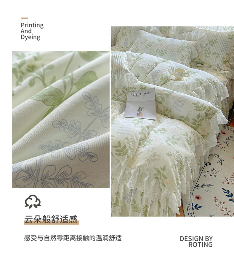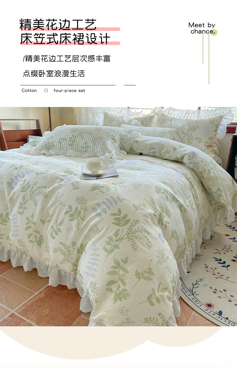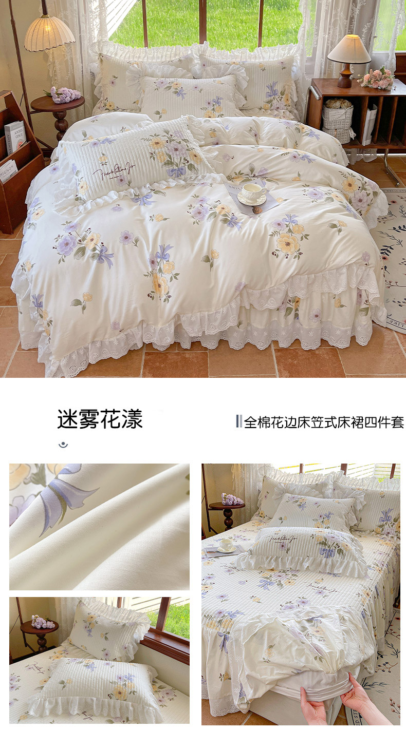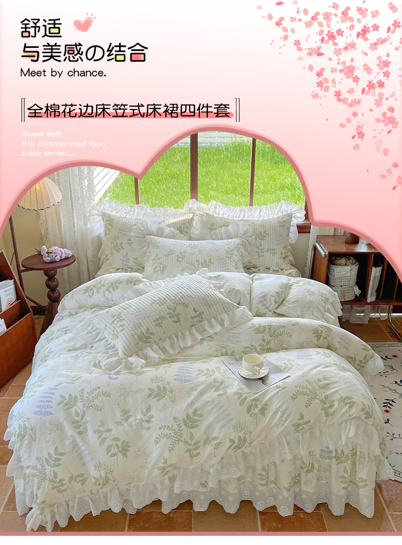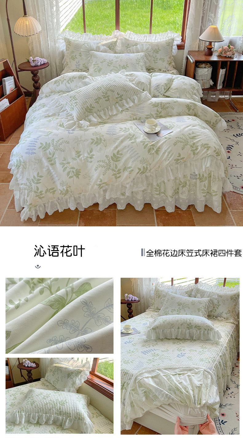 当前位置: 91家纺网 > 商品网购 > 床品套件 > 四件套 > 全棉普通四件套 > 罗艺轩 2025新款全棉印花床笠式花边床裙四件套 沁语花叶